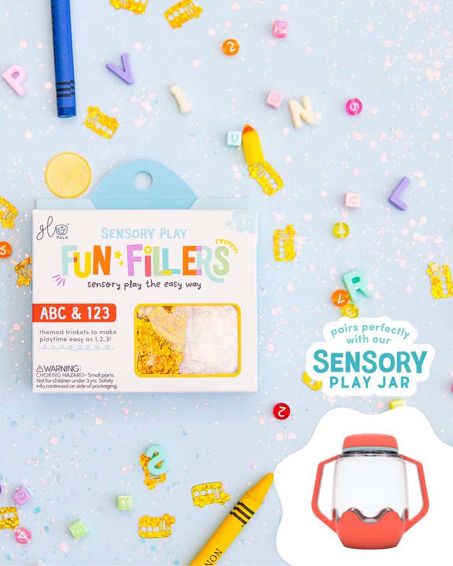 Fun Fillers take the fuss out of curating the perfect sensory play activity! Each pack includes themed sensory accessories that take playtime to the next level! These pair perfectly with our new Sensory Play Jar - or you can use them to enhance your favorite sensory bin. Perfect for water, rice, slime, play-dough and more, Pals!