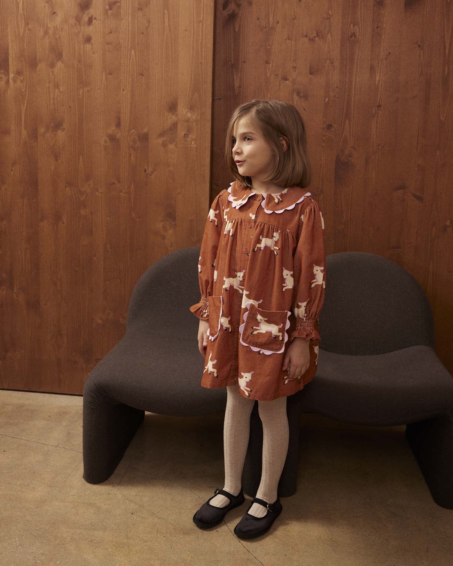 The Agatha dress from Hello Simone is perfect for fall and winter. With long sleeves and a unique lamb print, this dress pairs great with tights and ballet flats.