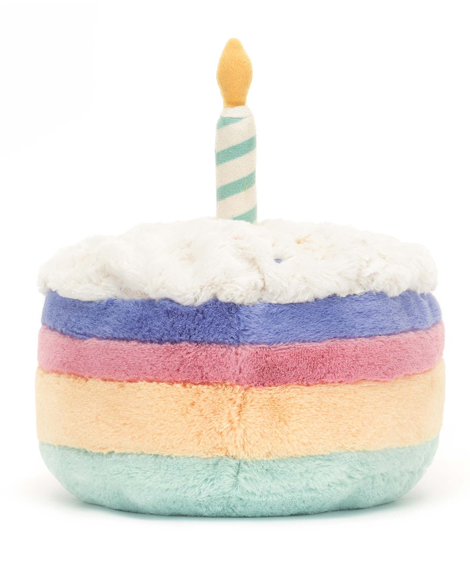 Celebrate in color with Amuseable Rainbow Birthday Cake! This joyful cake has four soft layers in pink, purple, yellow and green, fluffy icing with chocolate flecks and a suedette stripe candle with a golden fur flame. Kick up those cord boots and dance!
