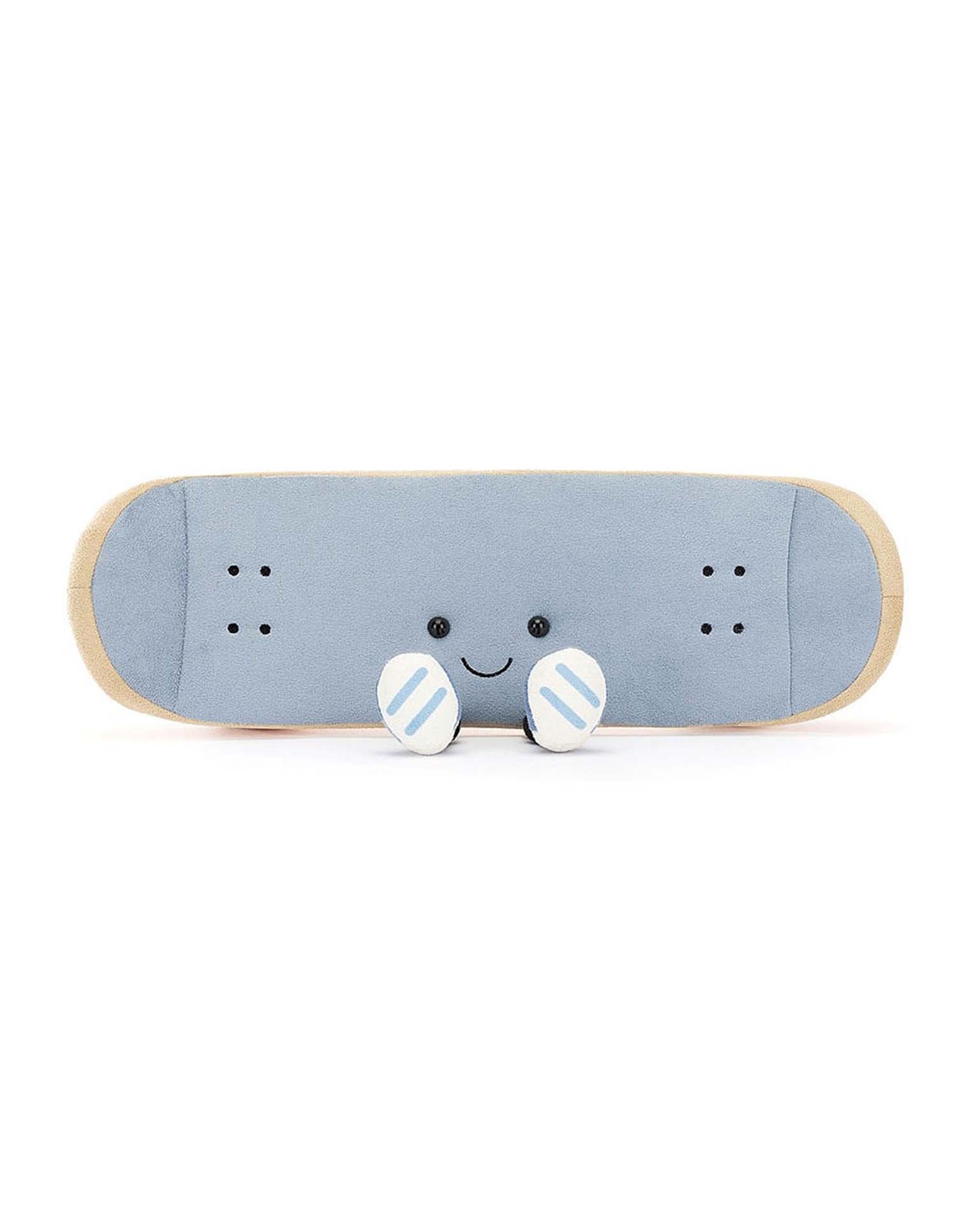 Land tricks and cuddles with Amuseables Sports Skateboarding. In blue suedette with beige edging and a bold orange back, this board can rest on soft charcoal wheels and grey trucks. This smiling skater boasts sweet Jellycat graffiti detail, stitched screws, and fine cord legs with textured trainers.