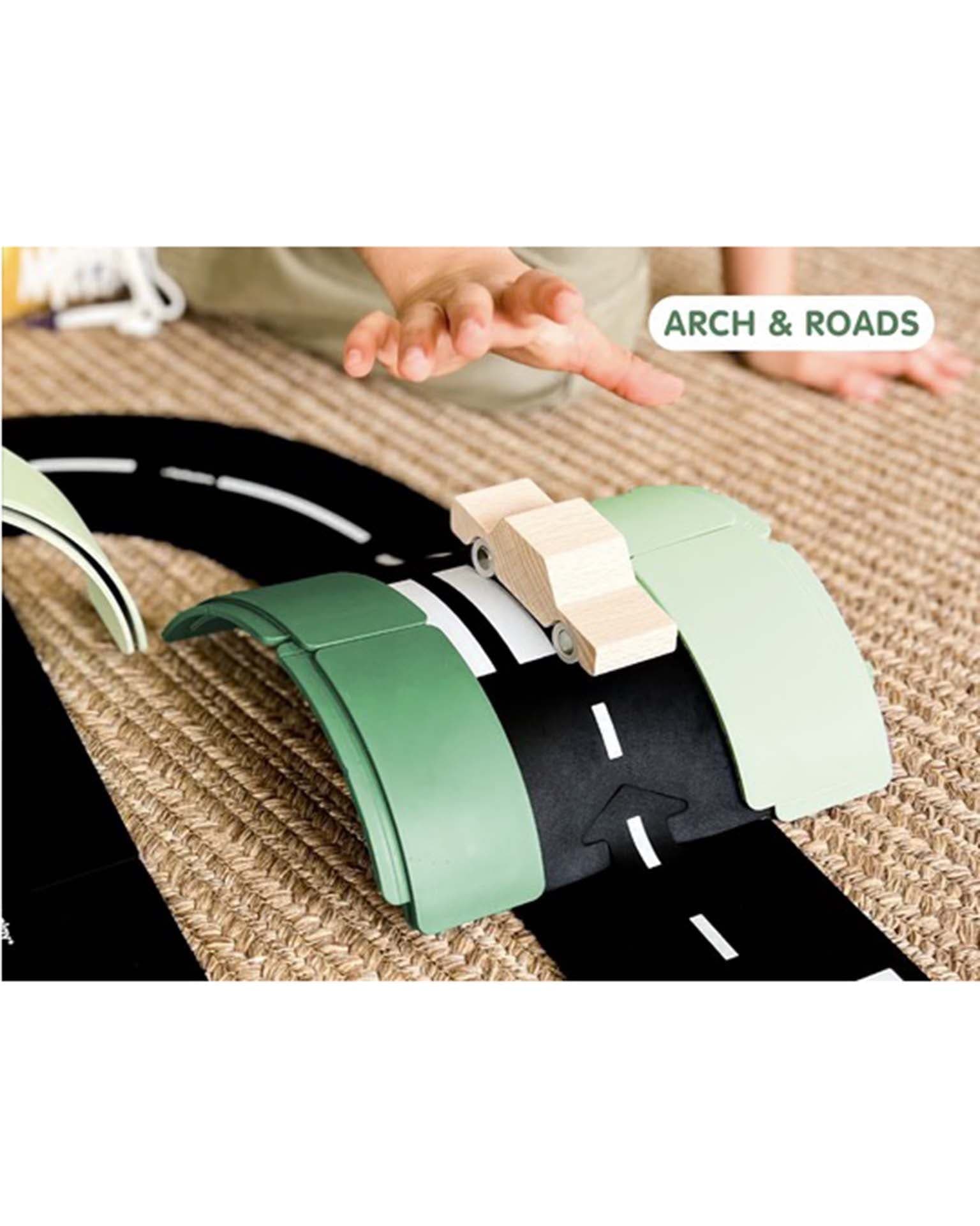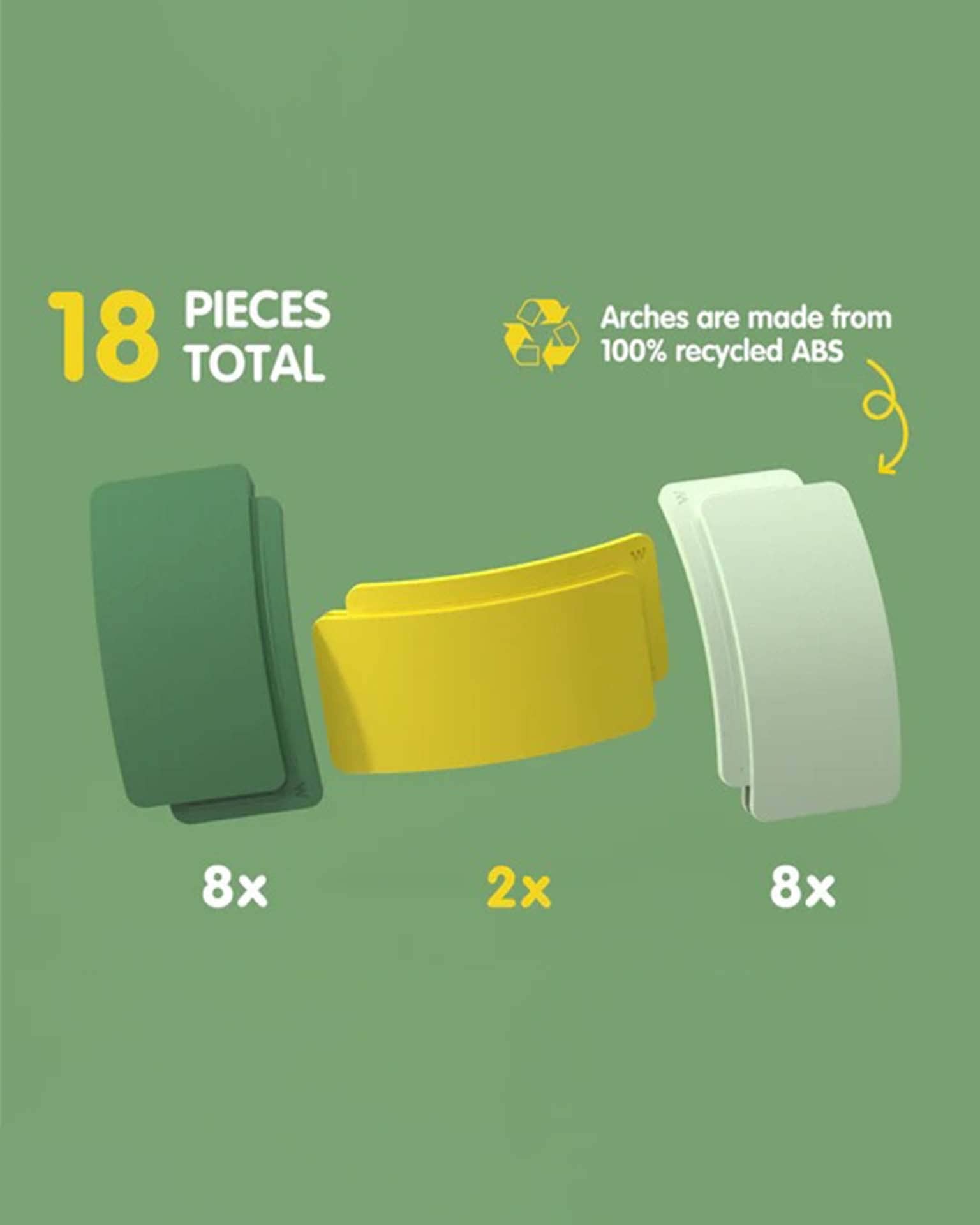 Arches are made in Europe from 100% recycled plastic! They are a safe, sustainable, and durable toy that grows with your child. It’s fully compatible with the rest of the Waytoplay system, turning your roads into ramps, tunnels, or architectural masterpieces!