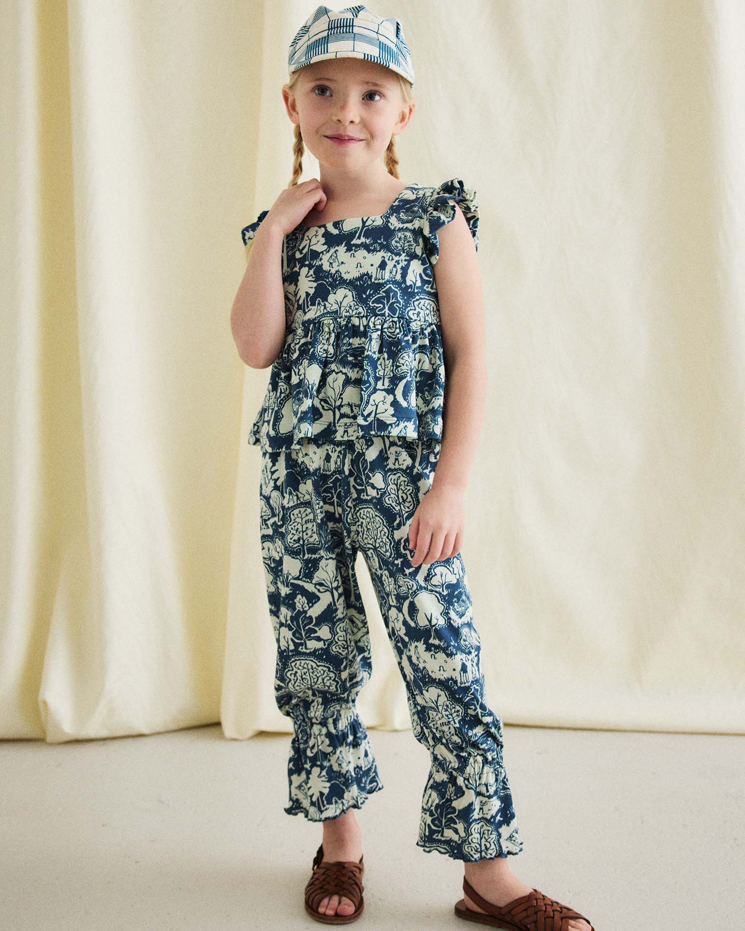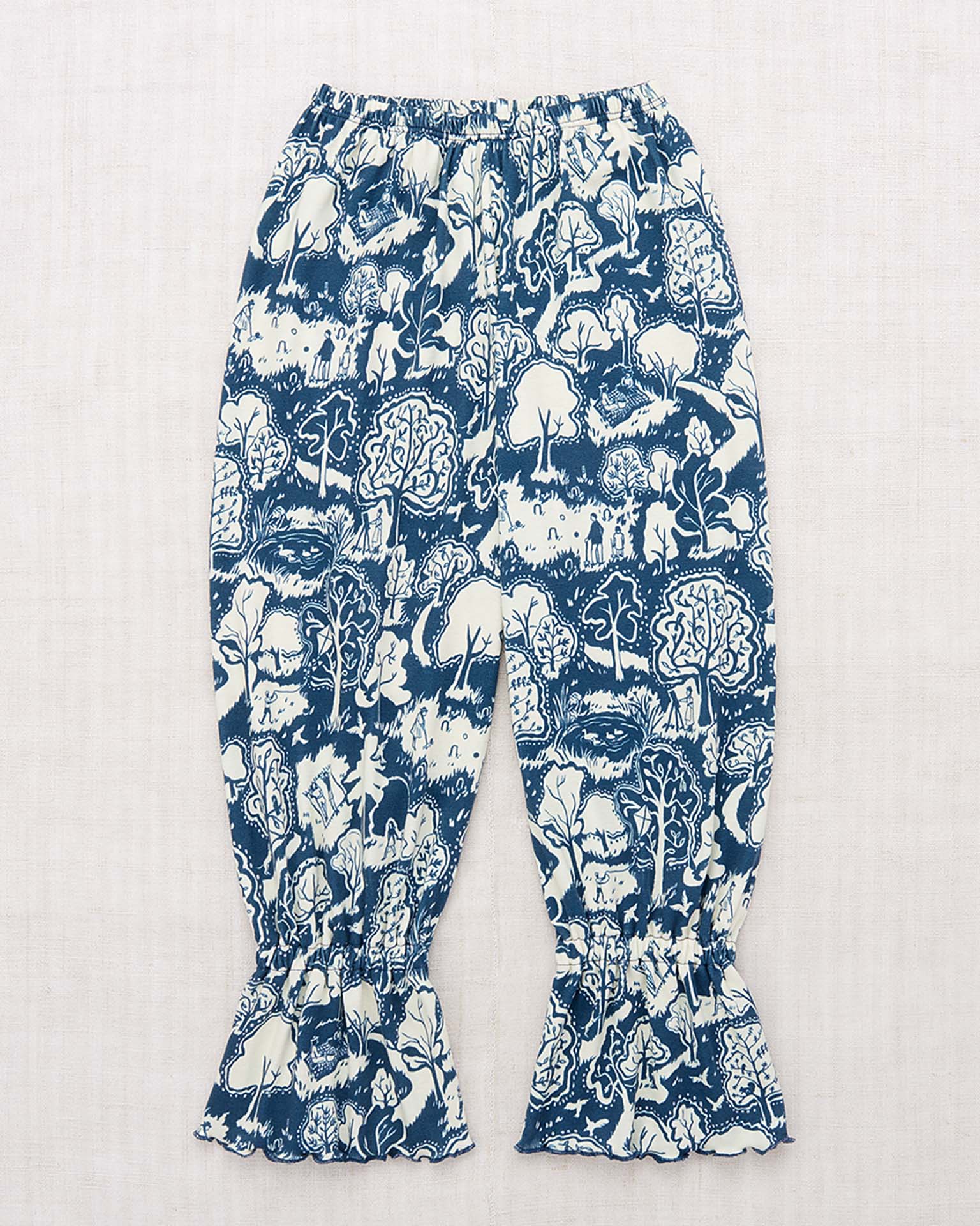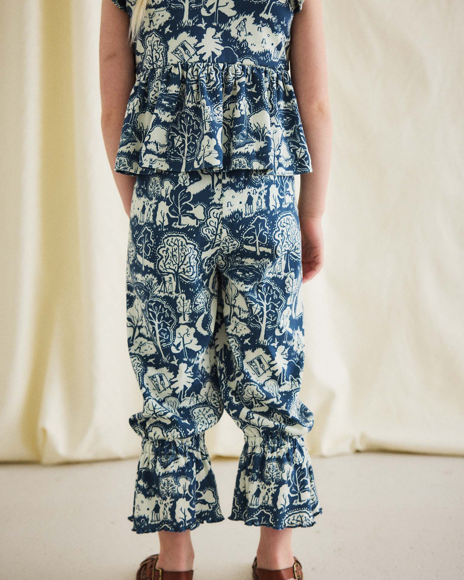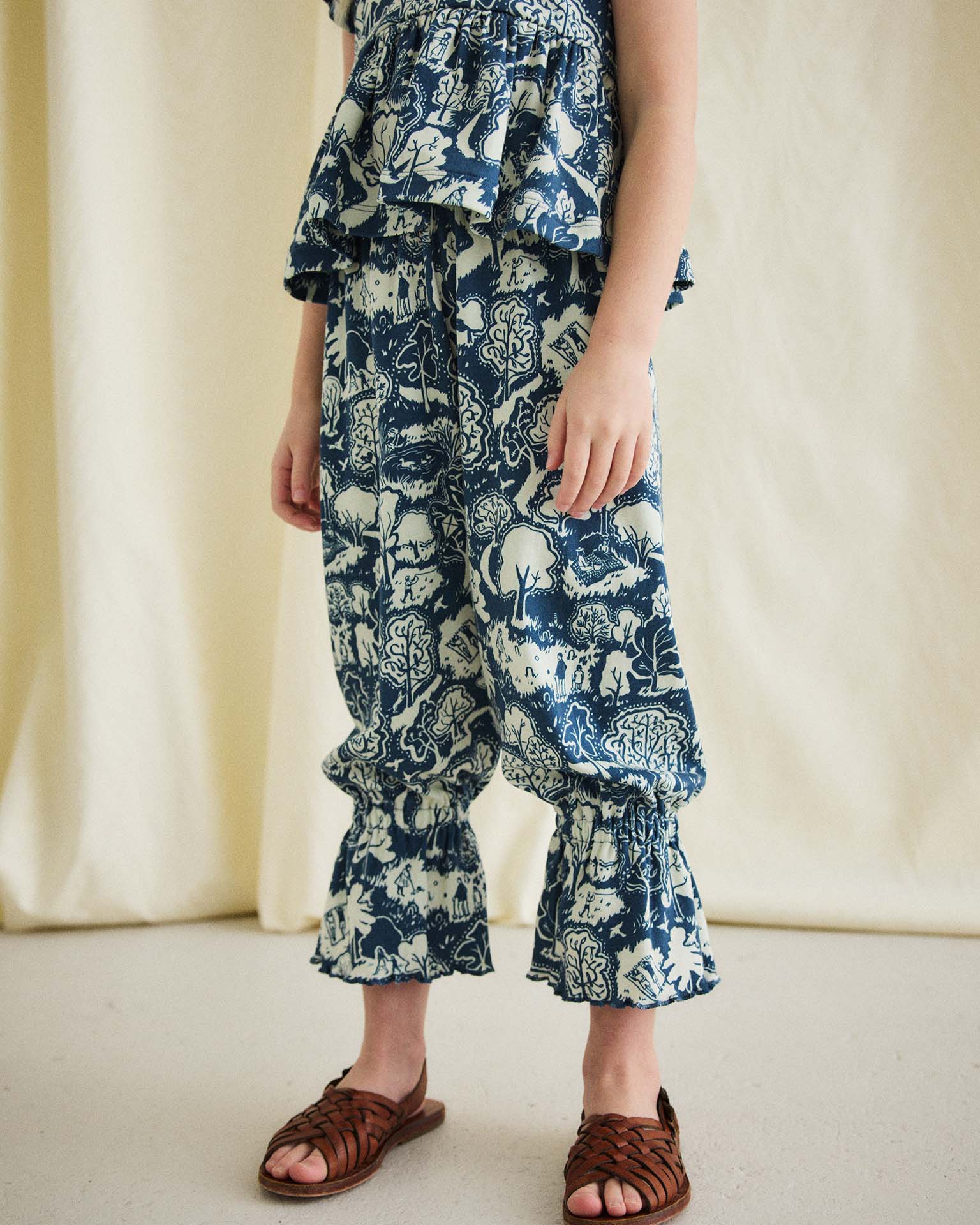A statement-making pull-on pant in Pima cotton, featuring a long ruffle hem and a gathered elastic waistband, adding a touch of flair to any look.