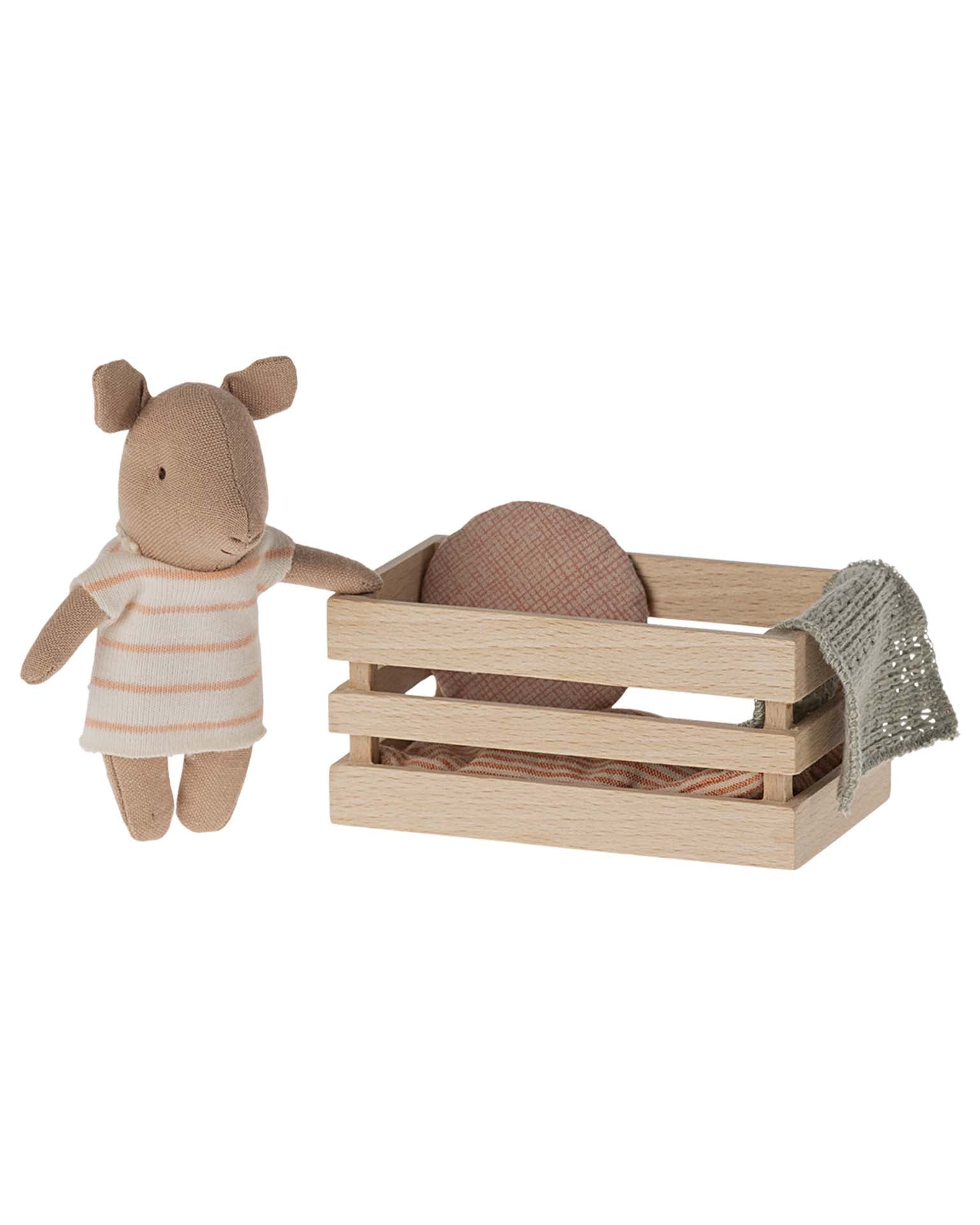 A perfect playset to start any story. This small baby pig sleeps tight in its wooden box with soft bedlinen. Add the bigger sizes of pigs to extend the play.
