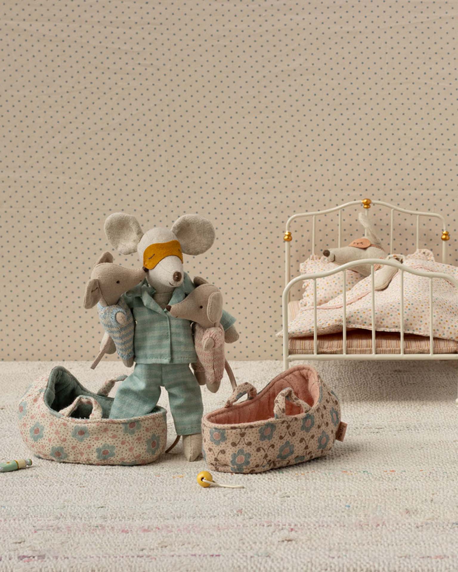 A small baby mouse in a soft and striped knitted suit. It sleeps for hours in its little quilted carry cot.