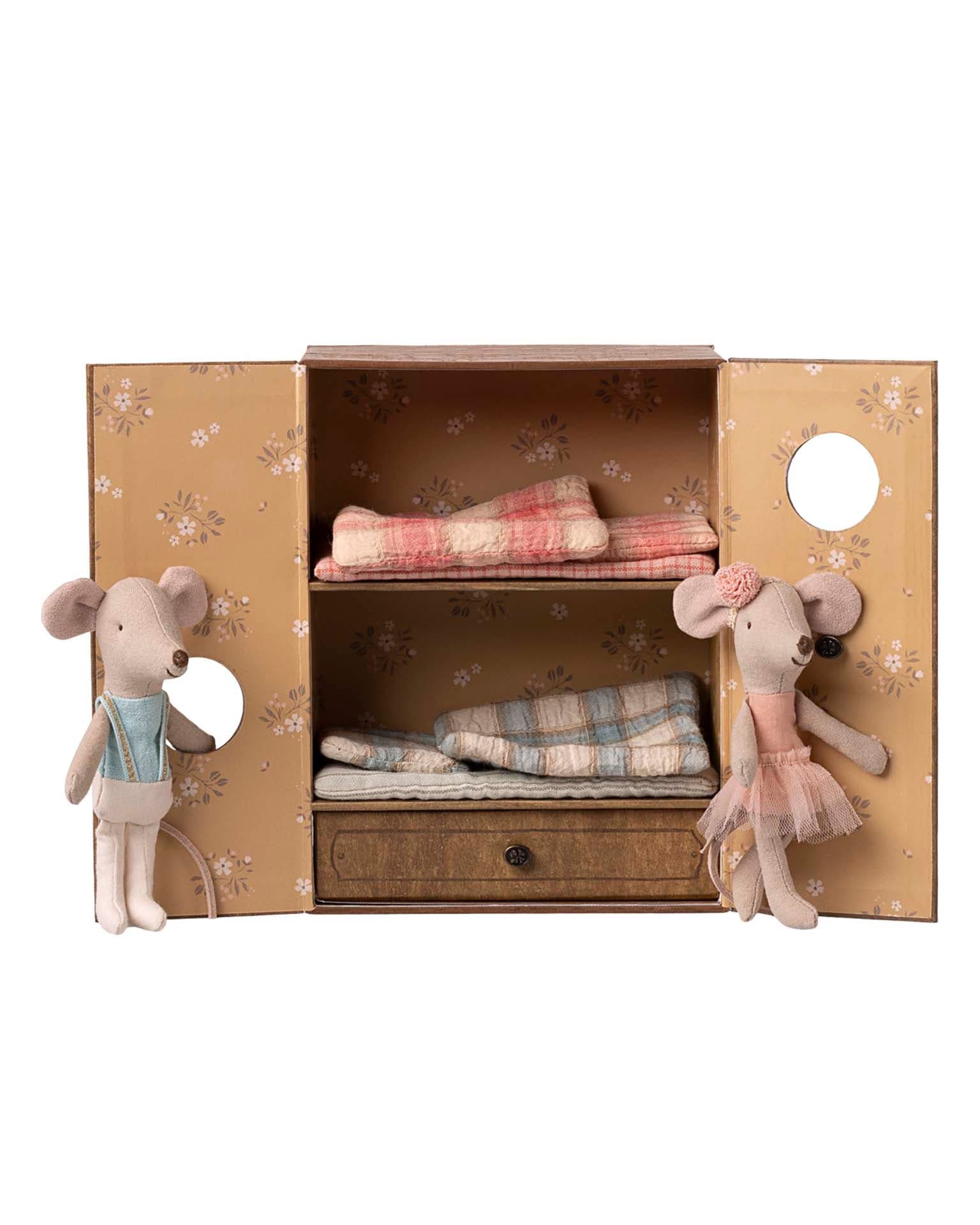 Open the doors of this magical playset and explore a world of dance, stardust and storytelling. This enchanting set transforms from a cosy mouse house to a ballet studio where dreams take centre stage. The mirrored wall glimmers while the magnetic barre holds fast to every tiny paw as the mice rehearse their grand performance. Two ballet mice, already dressed for the spotlight, wait eagerly in their beds, ready to twirl and tell their stories on stage.