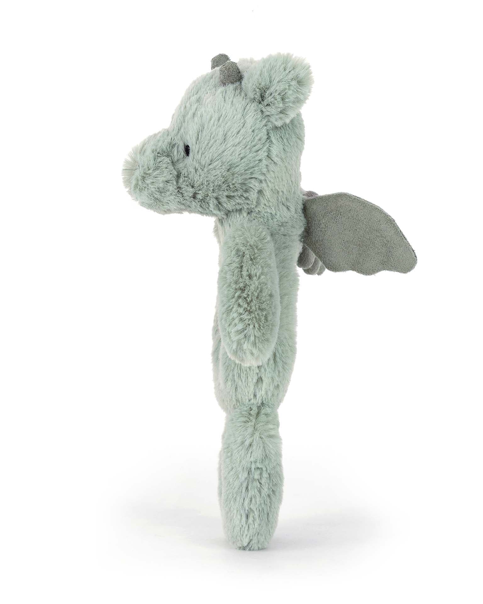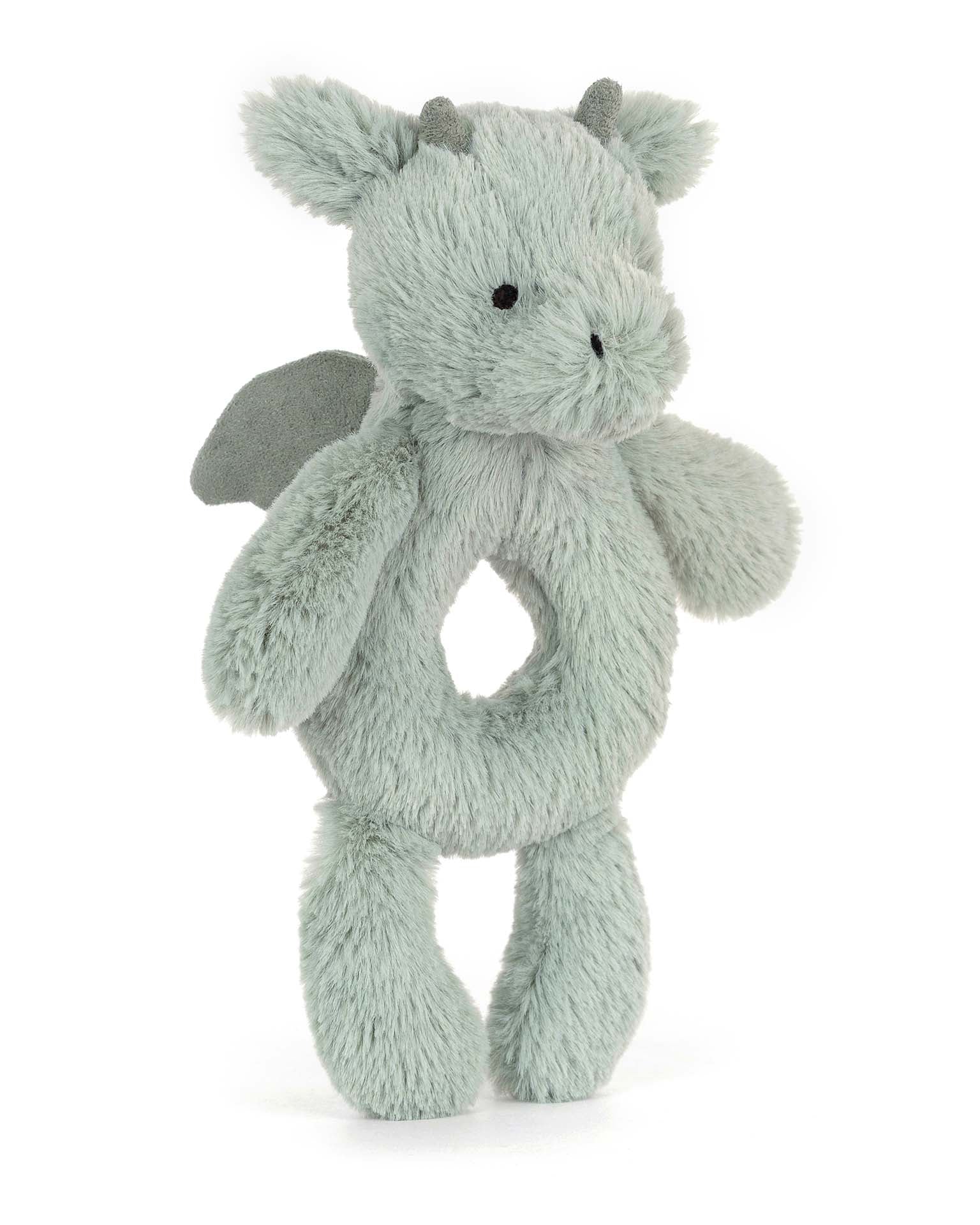 Bashful Dragon Ring Rattle is perfect for jingling playtime. In iconic sage green Bashful fur created from recycled fibers, this dragon has a doughnut-shaped tummy perfect for little hands to hold and shake for instant joy.
