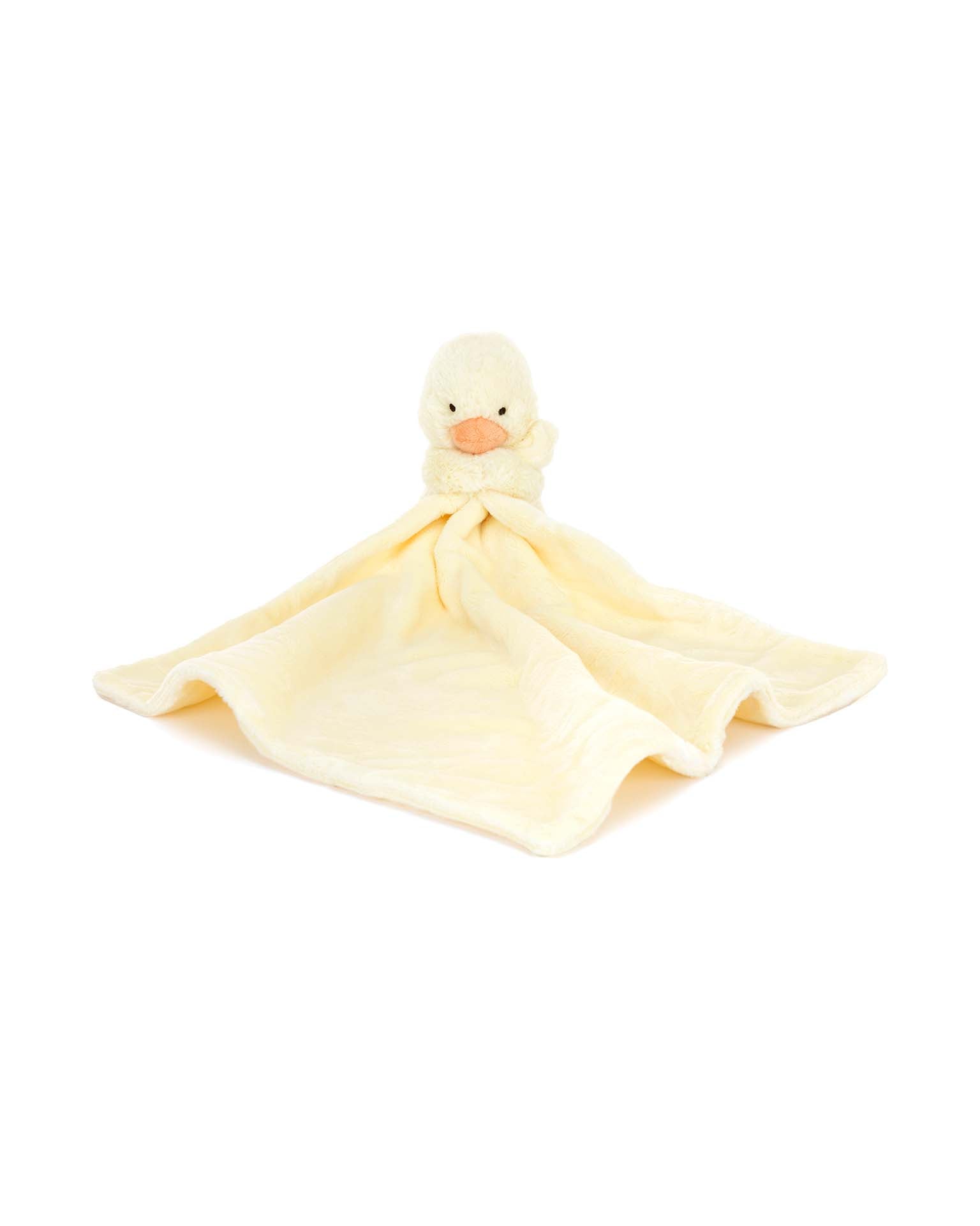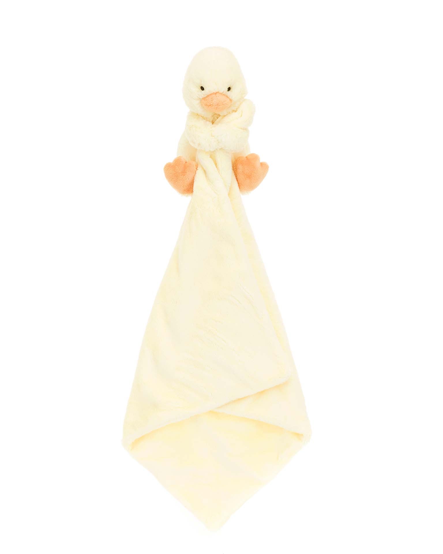 Sweet, gentle Bashful Duckling Soother is a perfect newborn gift, rolled up and presented in a Baby Jellycat grosgrain ribbon. Featuring our most loved farmyard friend, soft in a pale yellow fur made from recycled fibers and holding on tight to a smooth, un-stuffed square shaped soother; a simply gorgeous cuddle companion.
