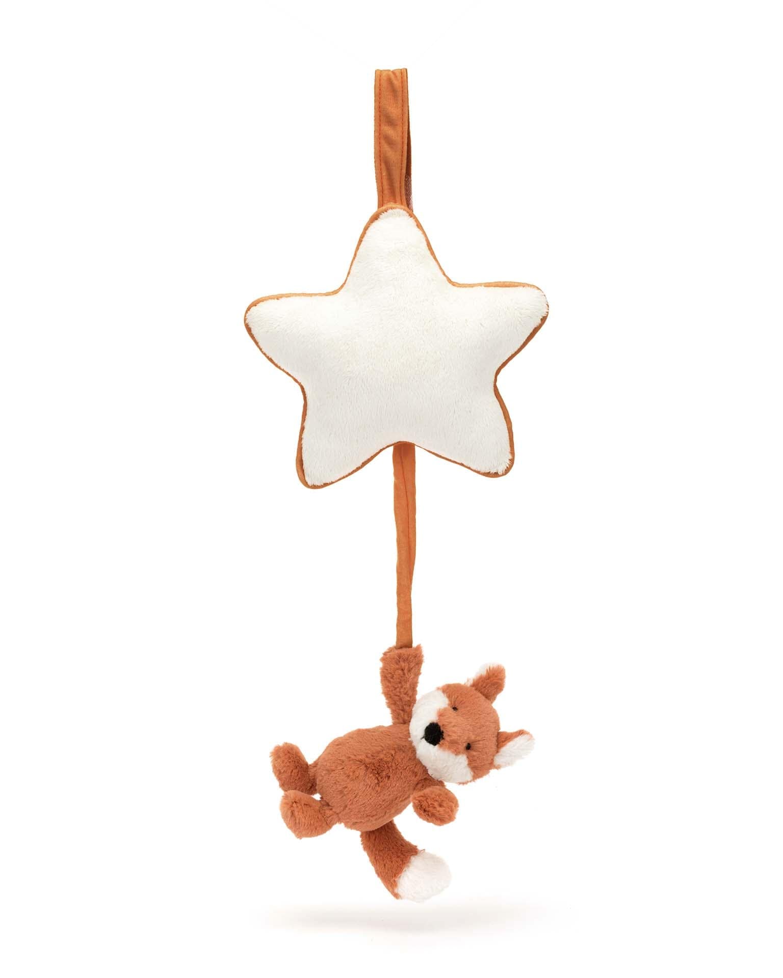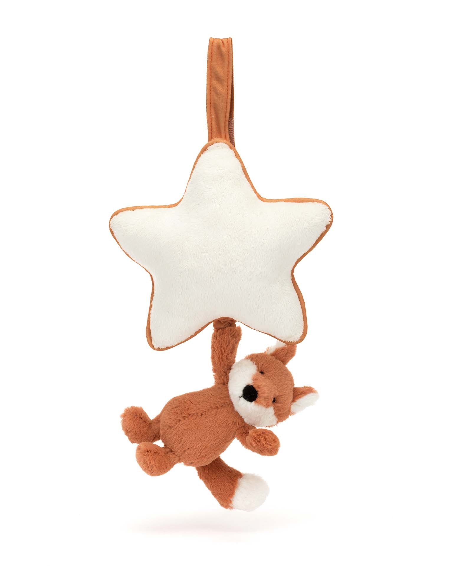 The Bashful Fox Cub Musical Pull is a soothing gift to help babies drift off. Our most loved fox cub has gorgeous orange fur with a cream mouth made with recycled fibers and holds on tight to a concertina pull. Gently pull the cub and an original Jellycat lullaby will play from the stylishly monochrome trimmed star.
