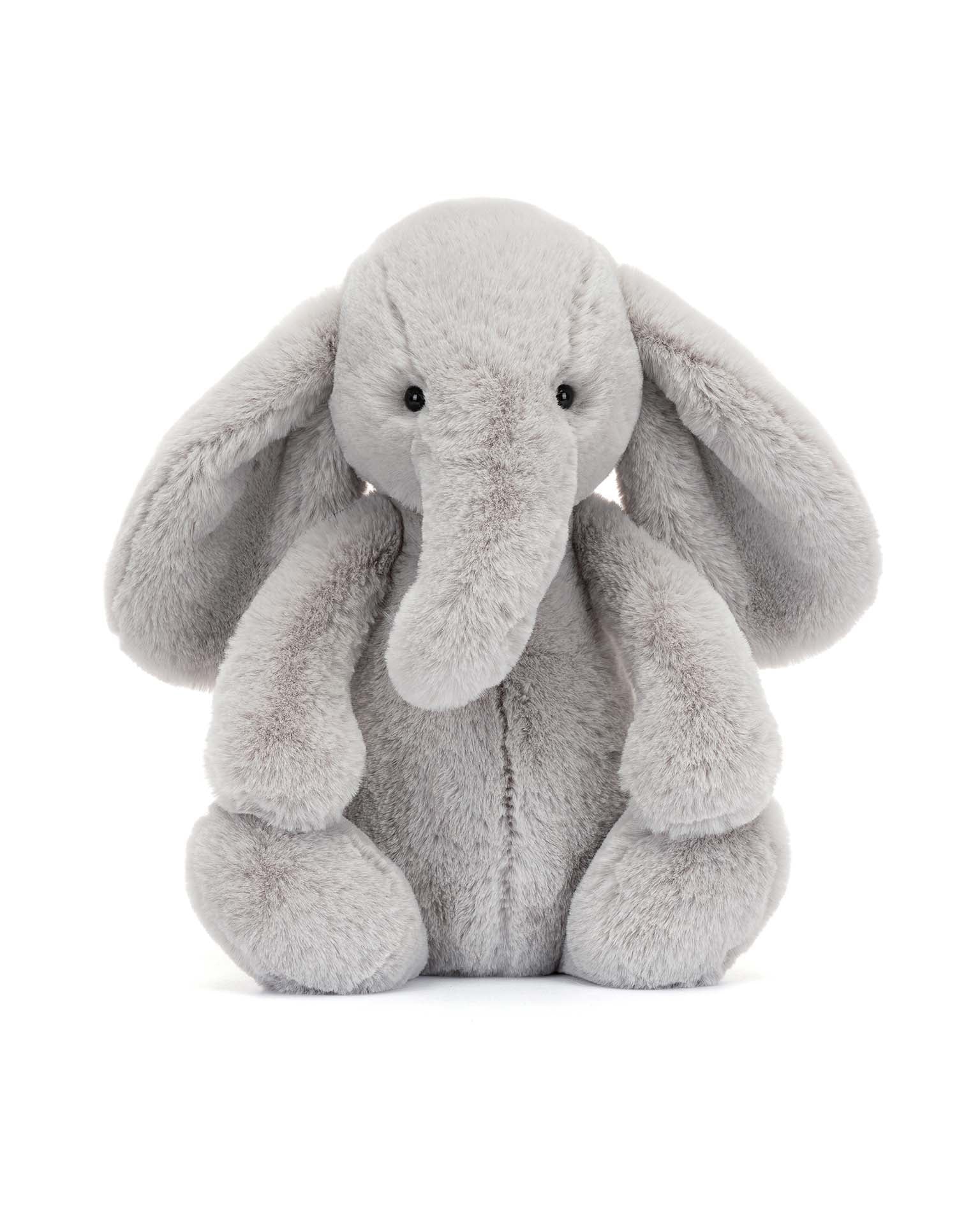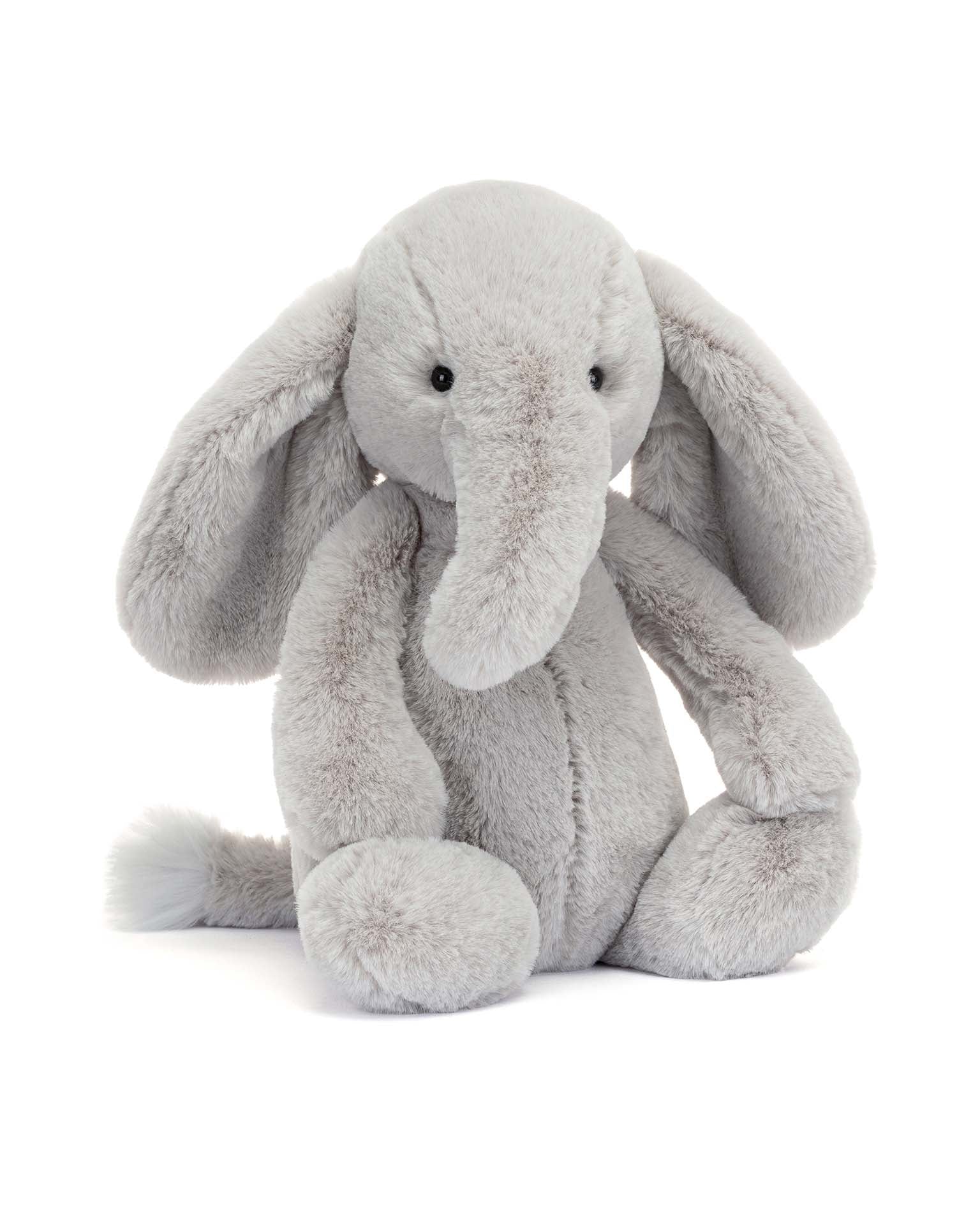 Bashful Luxe Elephant Thuddeus has a nose for adventure. In luxuriously soft grey fur with a fluffy tail tip, Thuddeus uses that long, curved trunk to sniff out new friends, and those big ears to listen to exciting stories. What adventures will you seek out together?