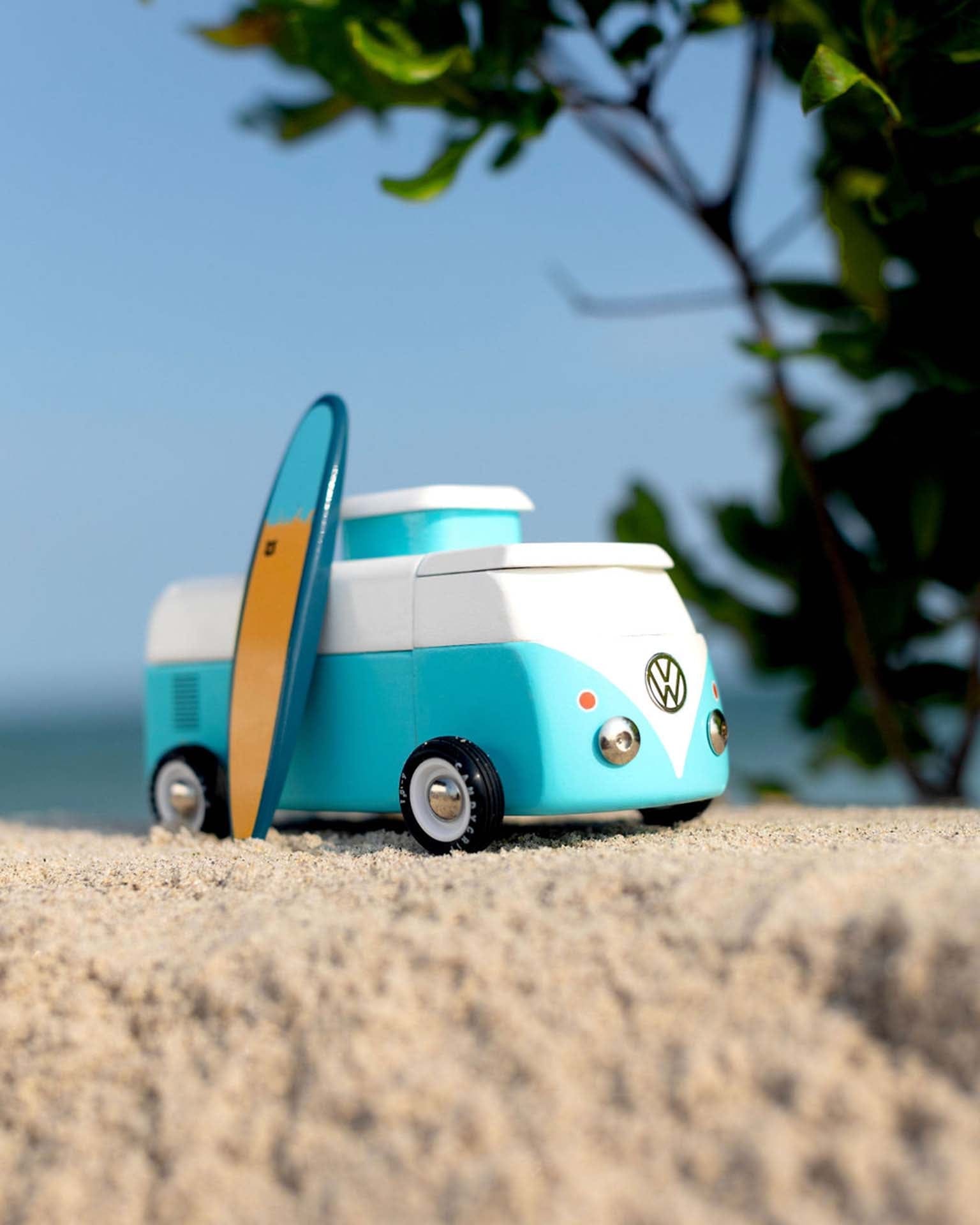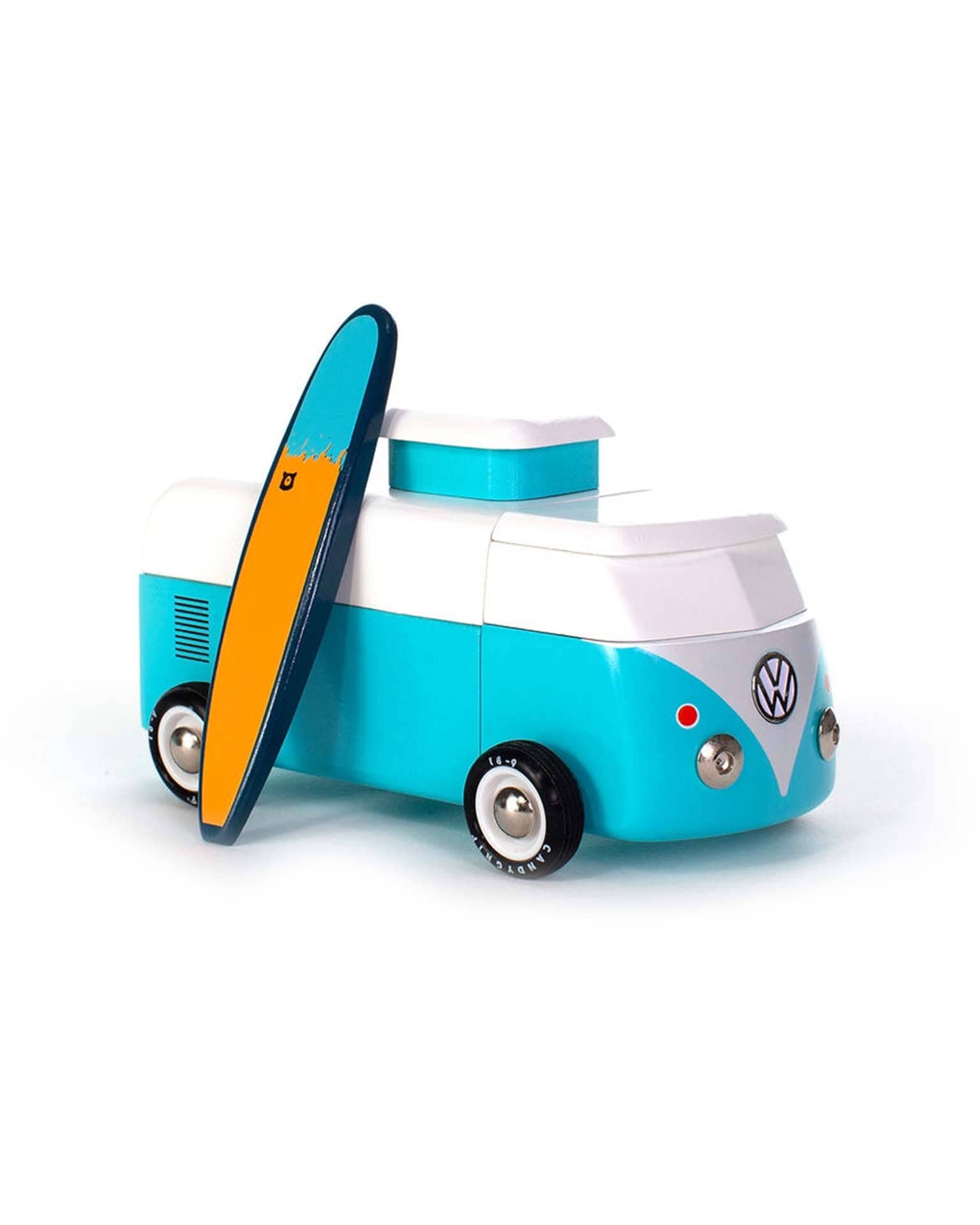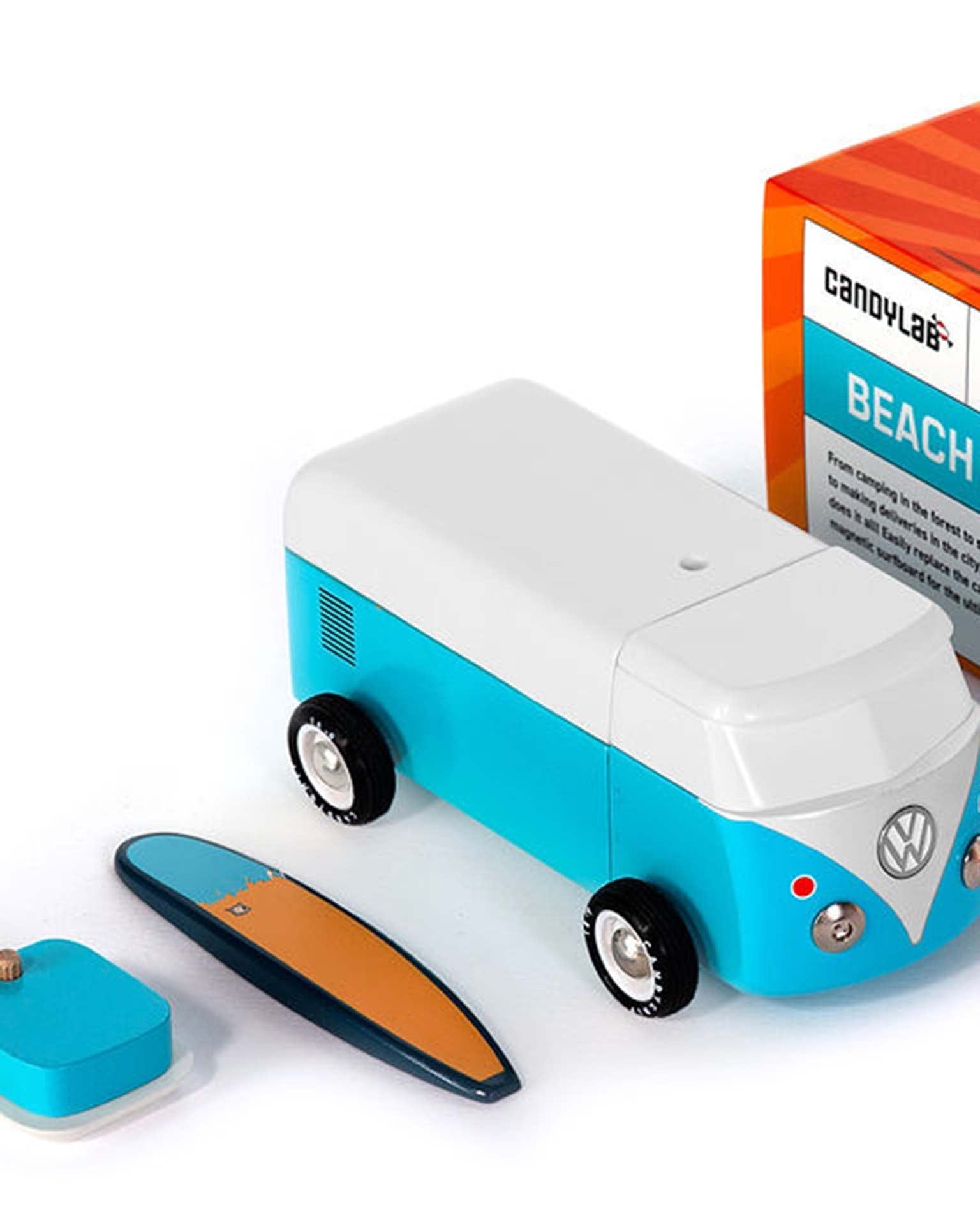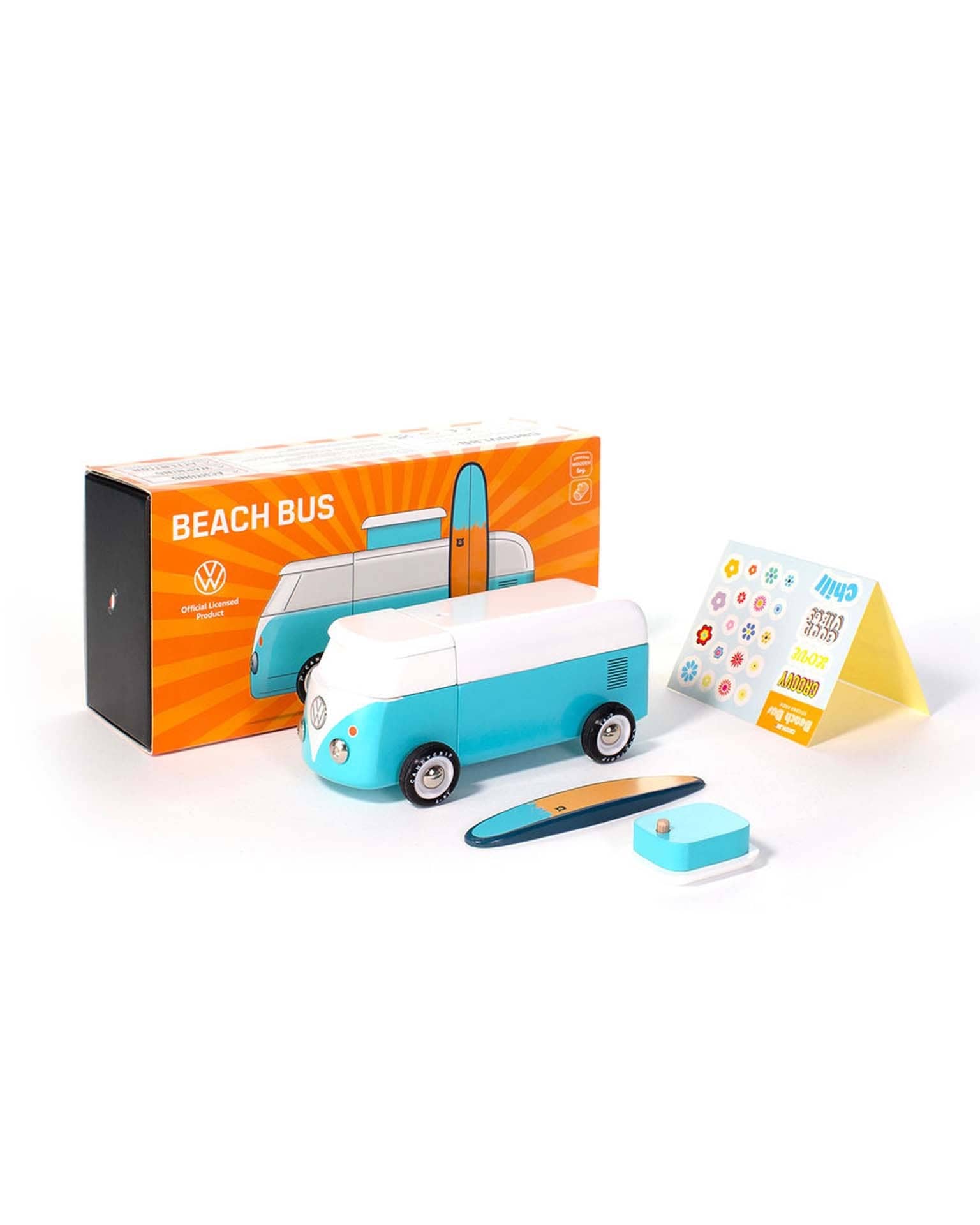 The Beach Bus is back! Now officially licensed by VW - check out the shiny emblem on the front. This iconic Volkswagen Type 2 comes with a magnetic camper top and surf board.