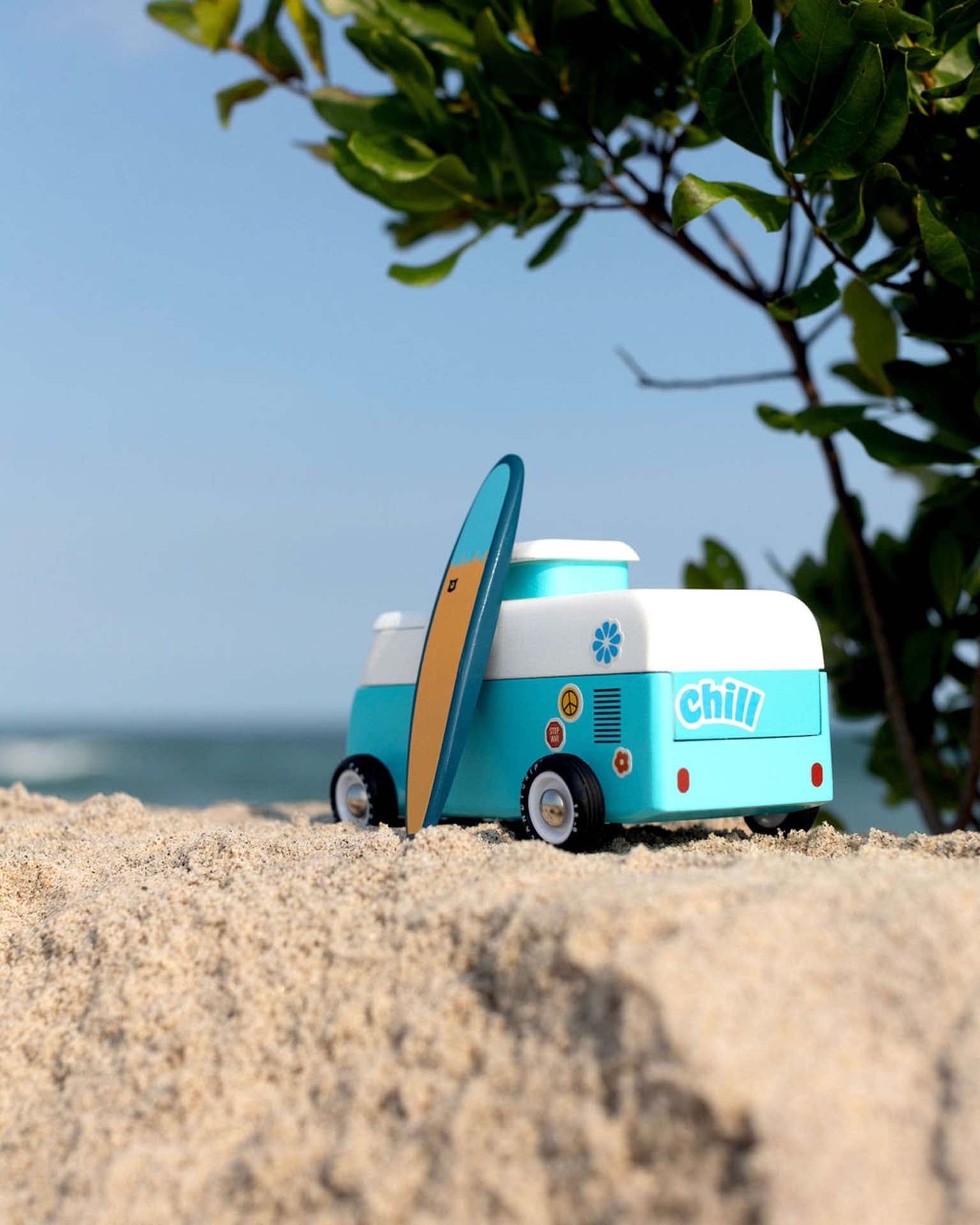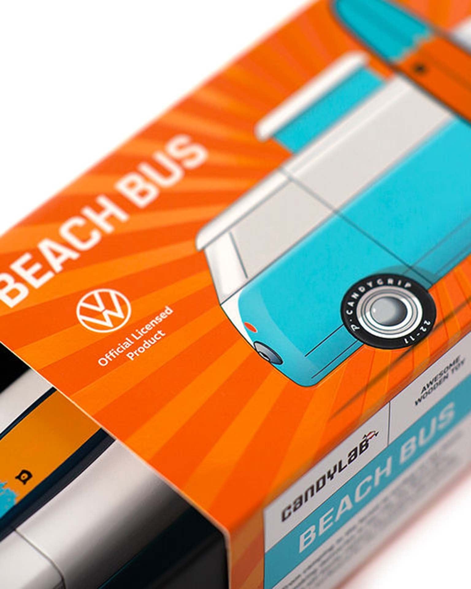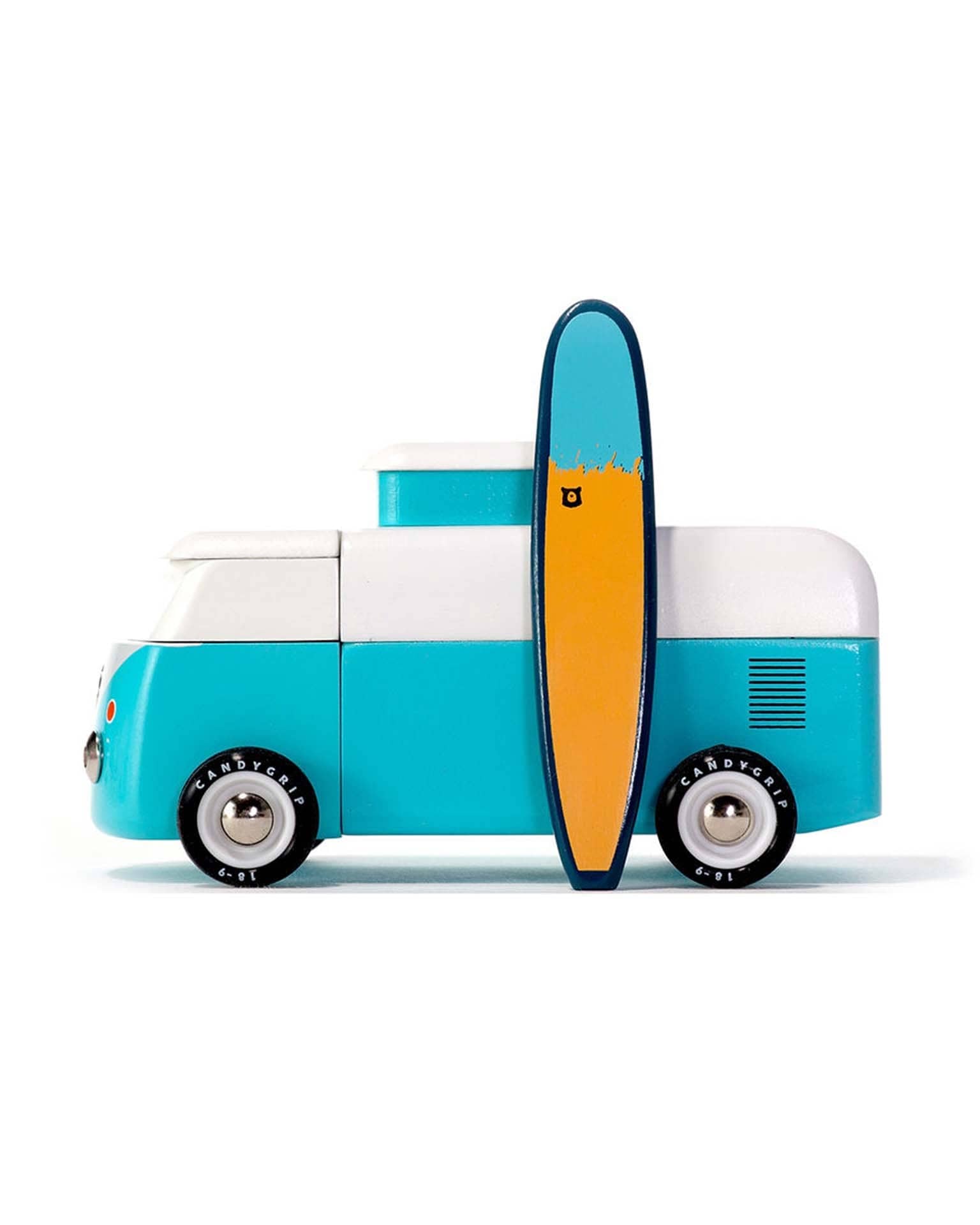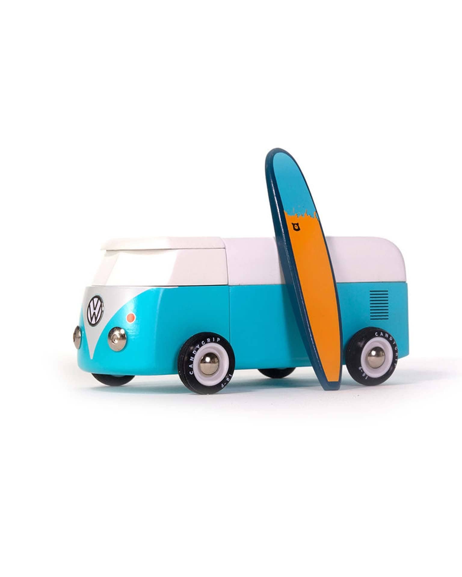 The Beach Bus is back! Now officially licensed by VW - check out the shiny emblem on the front. This iconic Volkswagen Type 2 comes with a magnetic camper top and surf board.