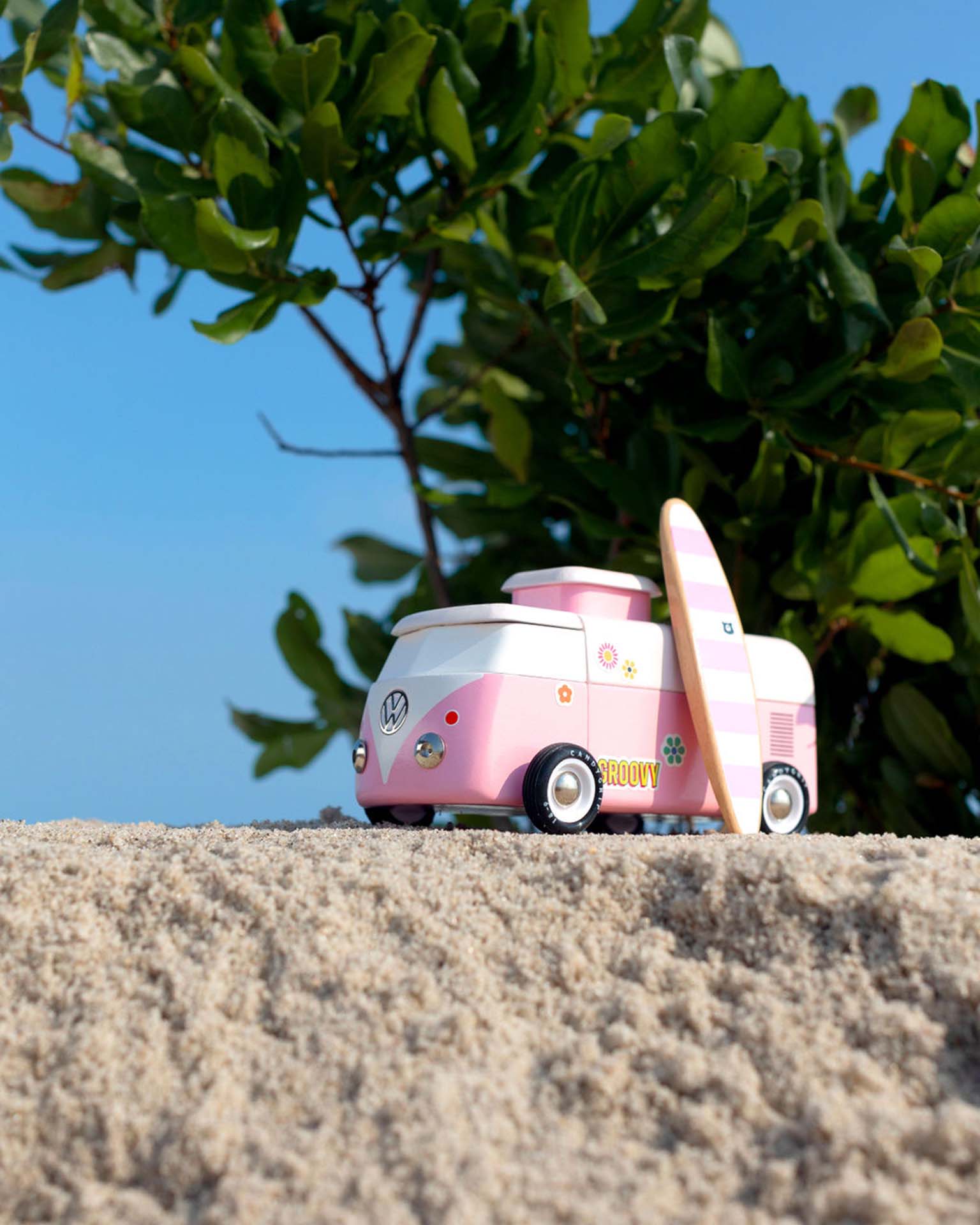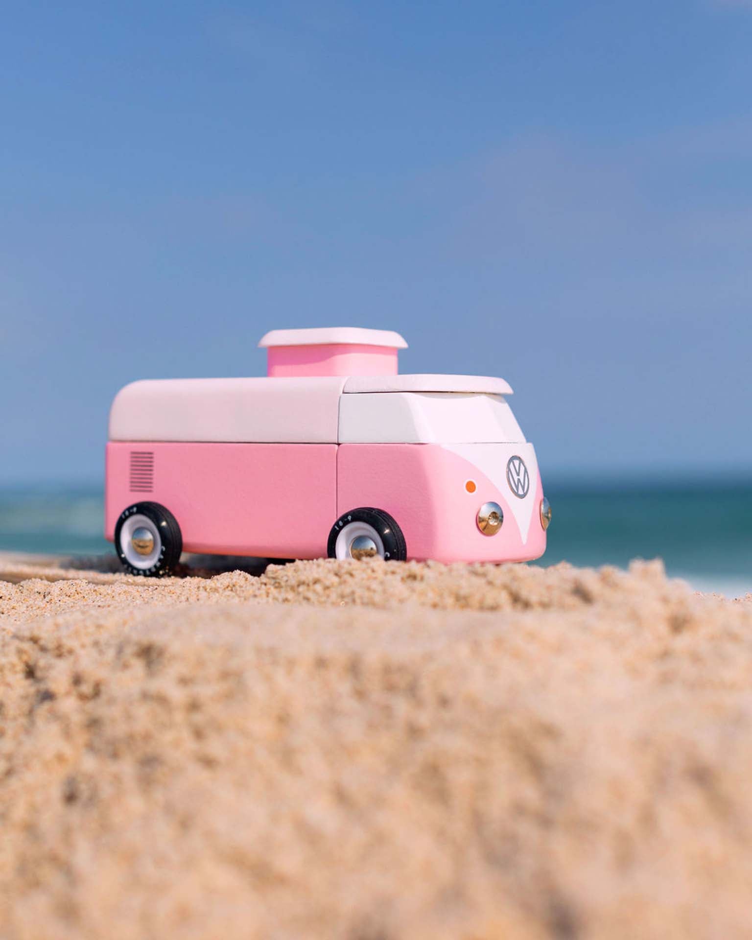 The Beach Bus is back! Now officially licensed by VW - check out the shiny emblem on the front. This iconic Volkswagen Type 2 comes with a magnetic camper top and surf board.