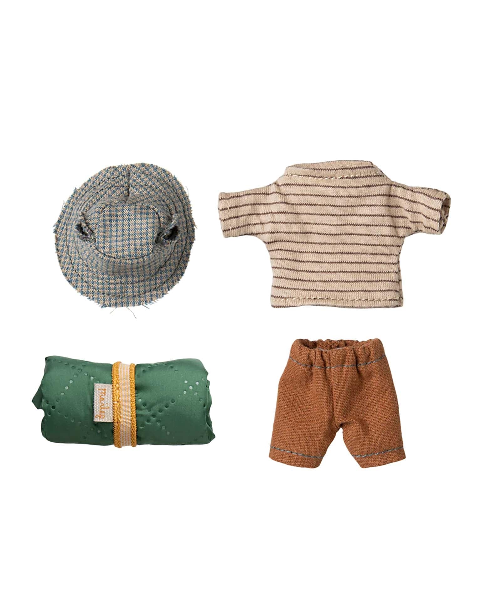 This mouse is well-prepared for a hiking trip in the wild nature. He is dressed for days of walking and brings his sleeping bag for nights under the stars. He has magnets in his hands. Add more accessories from the hiker collection for more play.