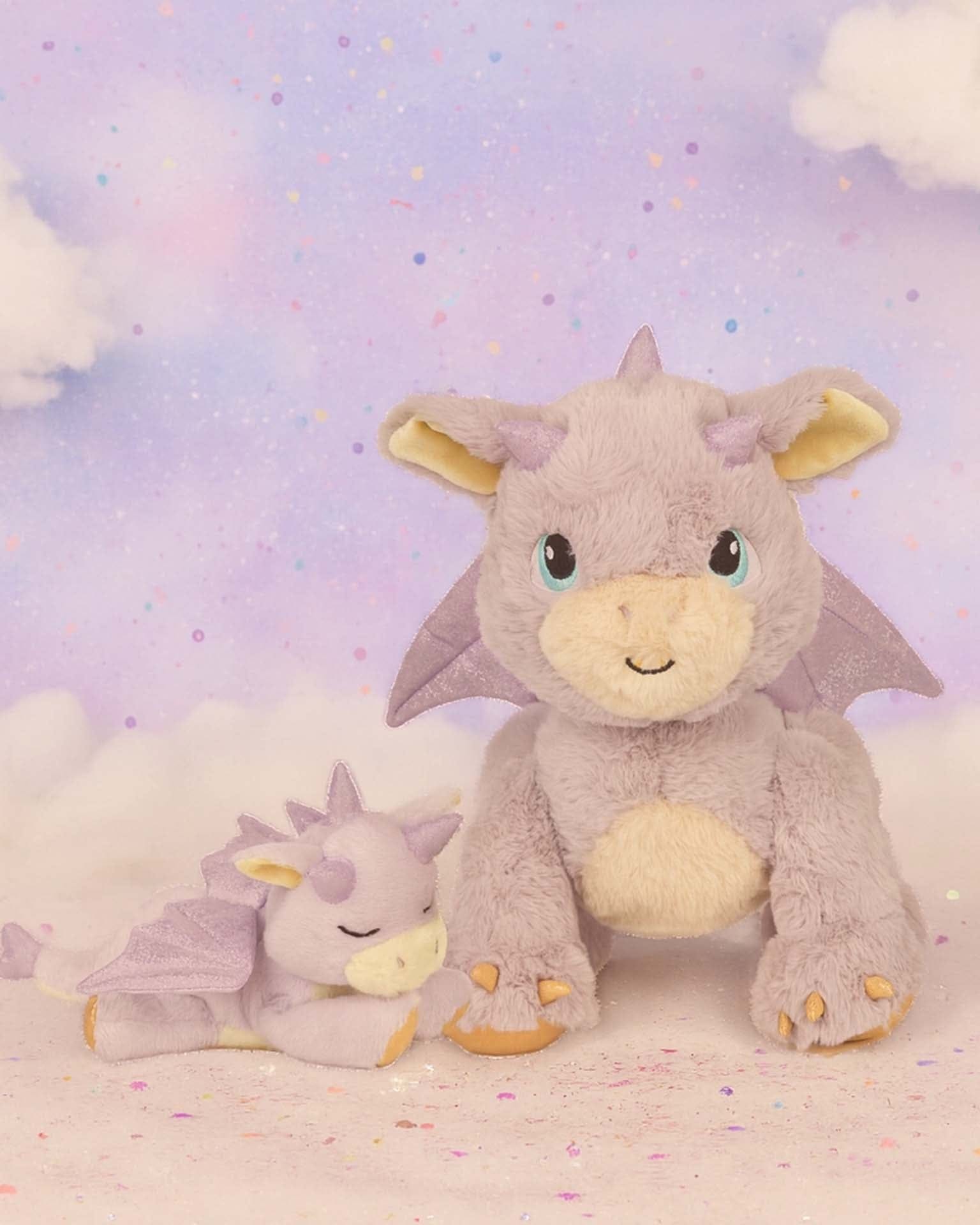 Binky Dragon Misty drifts through the Rainbow Realm in a haze of lavender dreams. With downy-soft lilac fur, sparkling embroidered eyes, and wings that shimmer like starlight, Misty loves curling up in cozy corners, dozing in warm laps, and being told gentle bedtime stories.