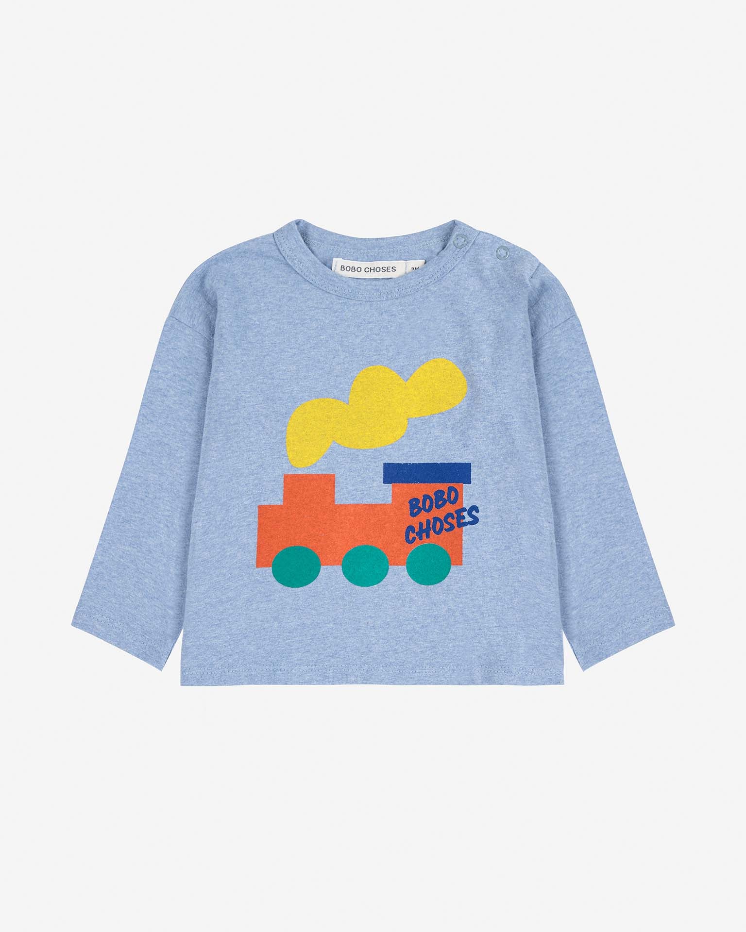This long sleeve tee features a nostalgic train print on the front, shoulder snap buttons for easy changing, and is made of soft cotton. Pair it with the bobo choo choo leggings!