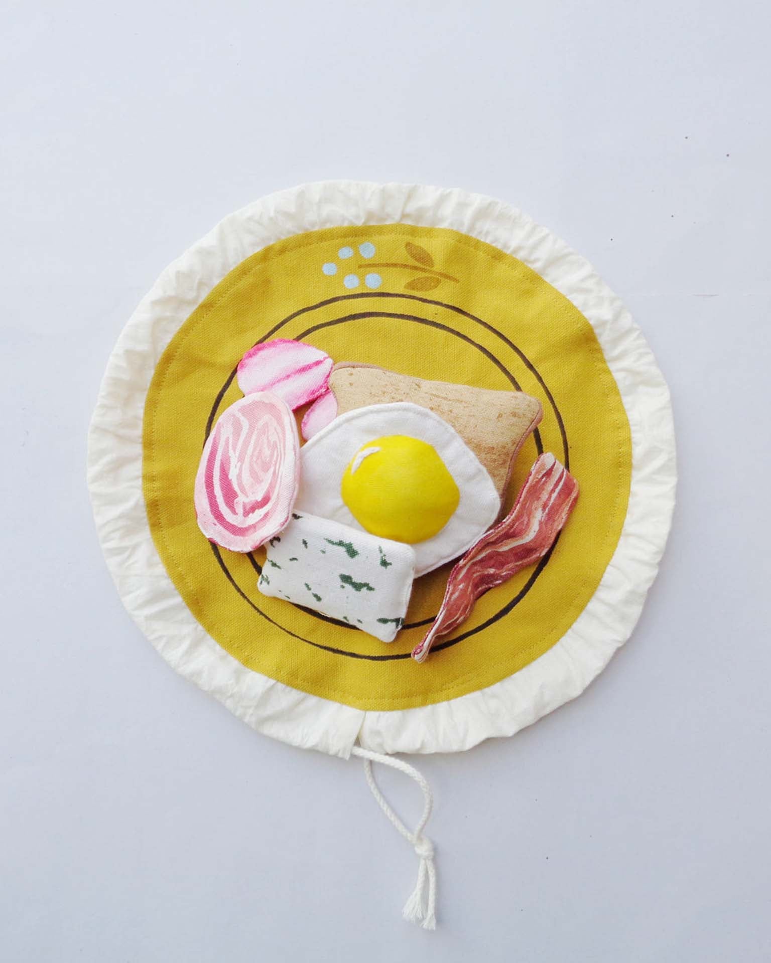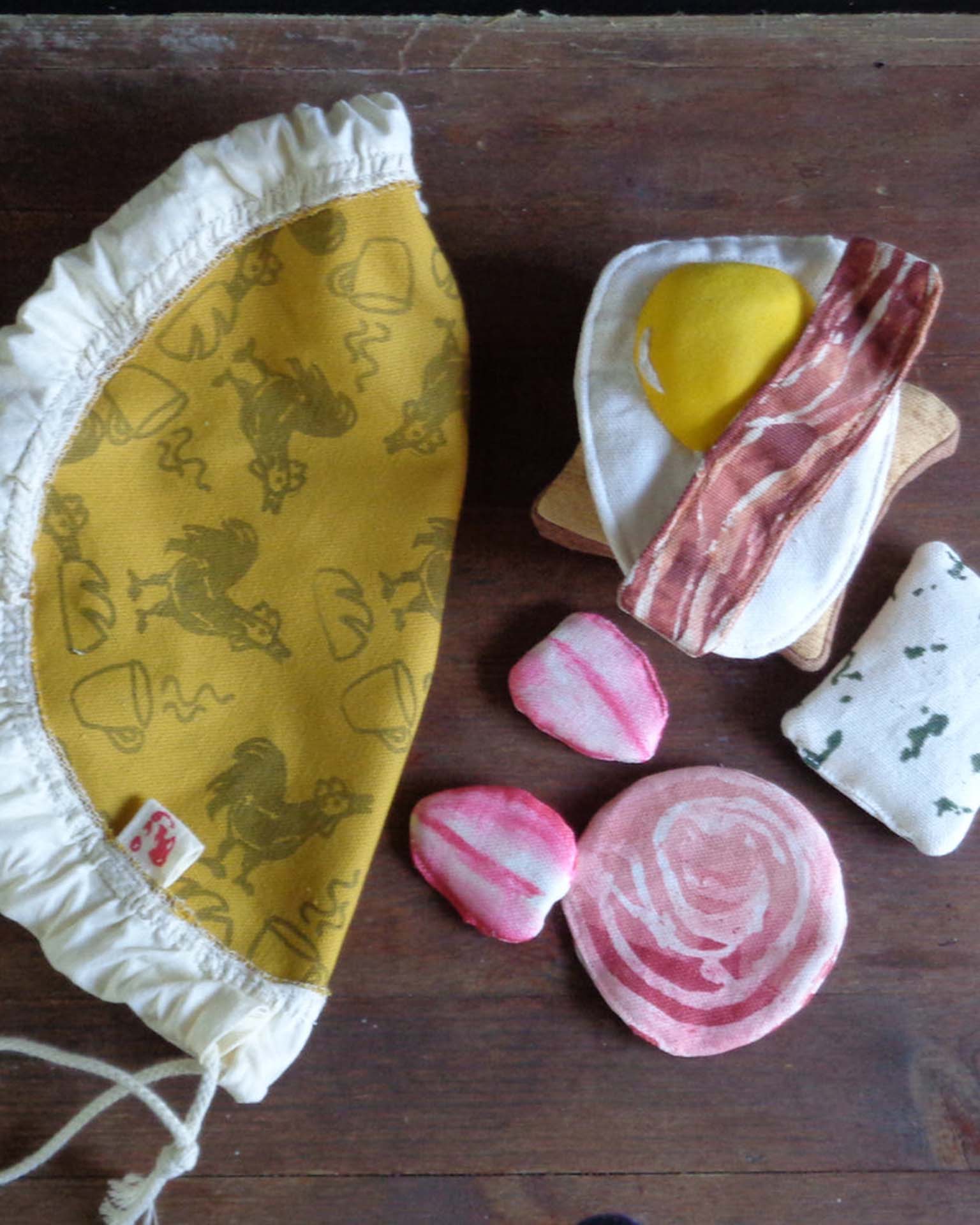 This breakfast toy bag is perfect for hours of imaginative play. Upon opening the bag, your little one will discover a colorful plate ideal for dining on the go. Handcrafted out of durable cotton canvas with plant-based silkscreen print.