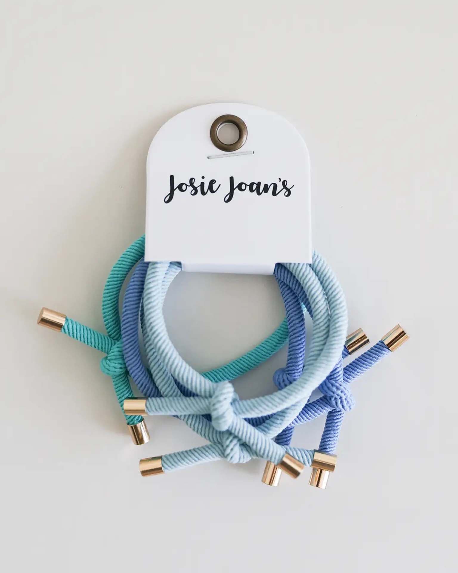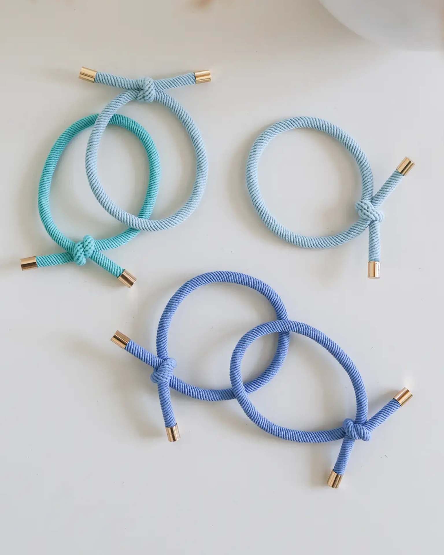 A stunning set of 5 knotted hair ties all in different Blues. Gentle on the hair, perfect for toddlers & girls' ponytails and pigtails. With a gorgeous touch of gold detail, allowing them to sparkle on their own.