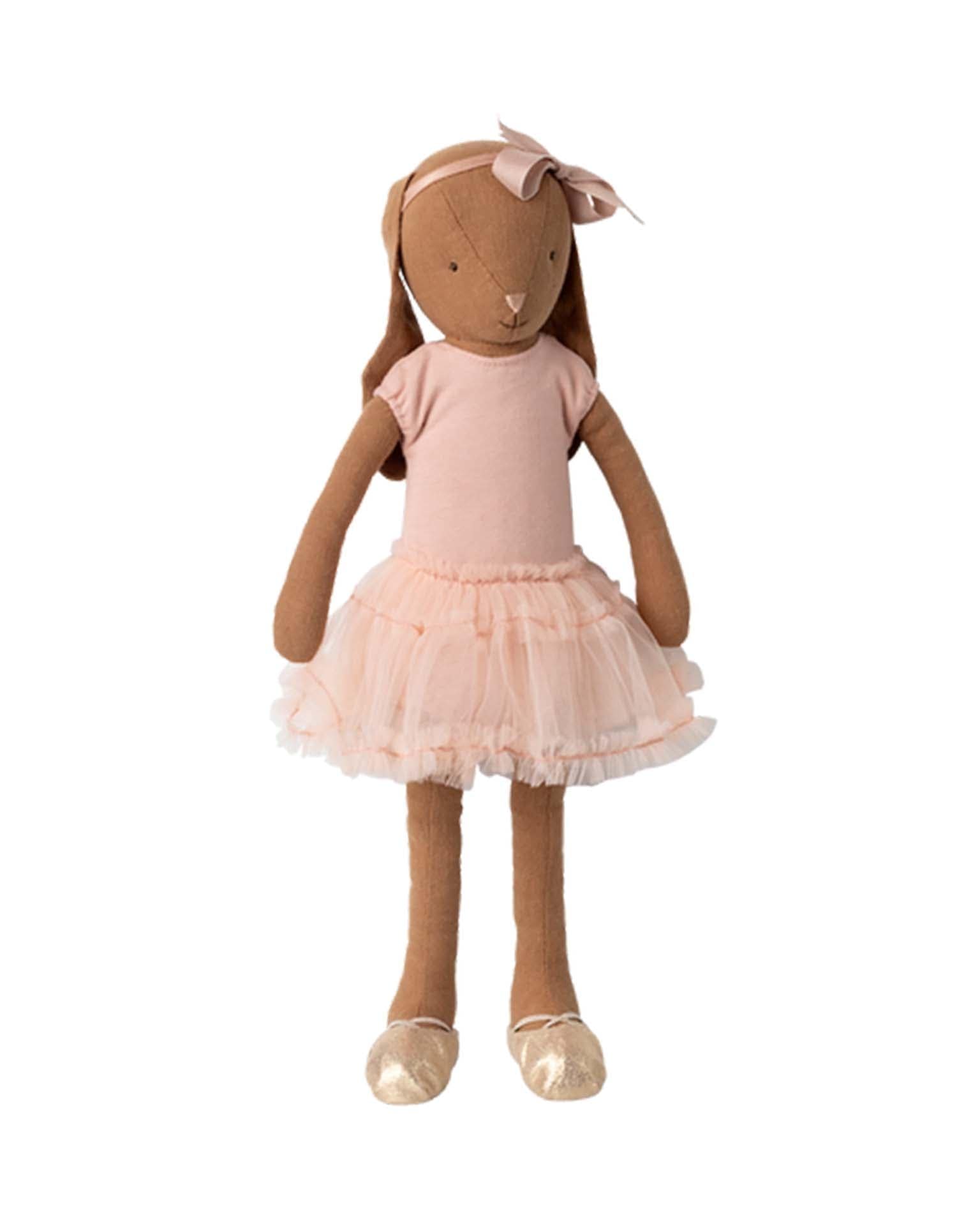 The well known Maileg bunny dressed up as a ballet dancer. It wears a cream colored suit, tulle skirt and ballet shoes.