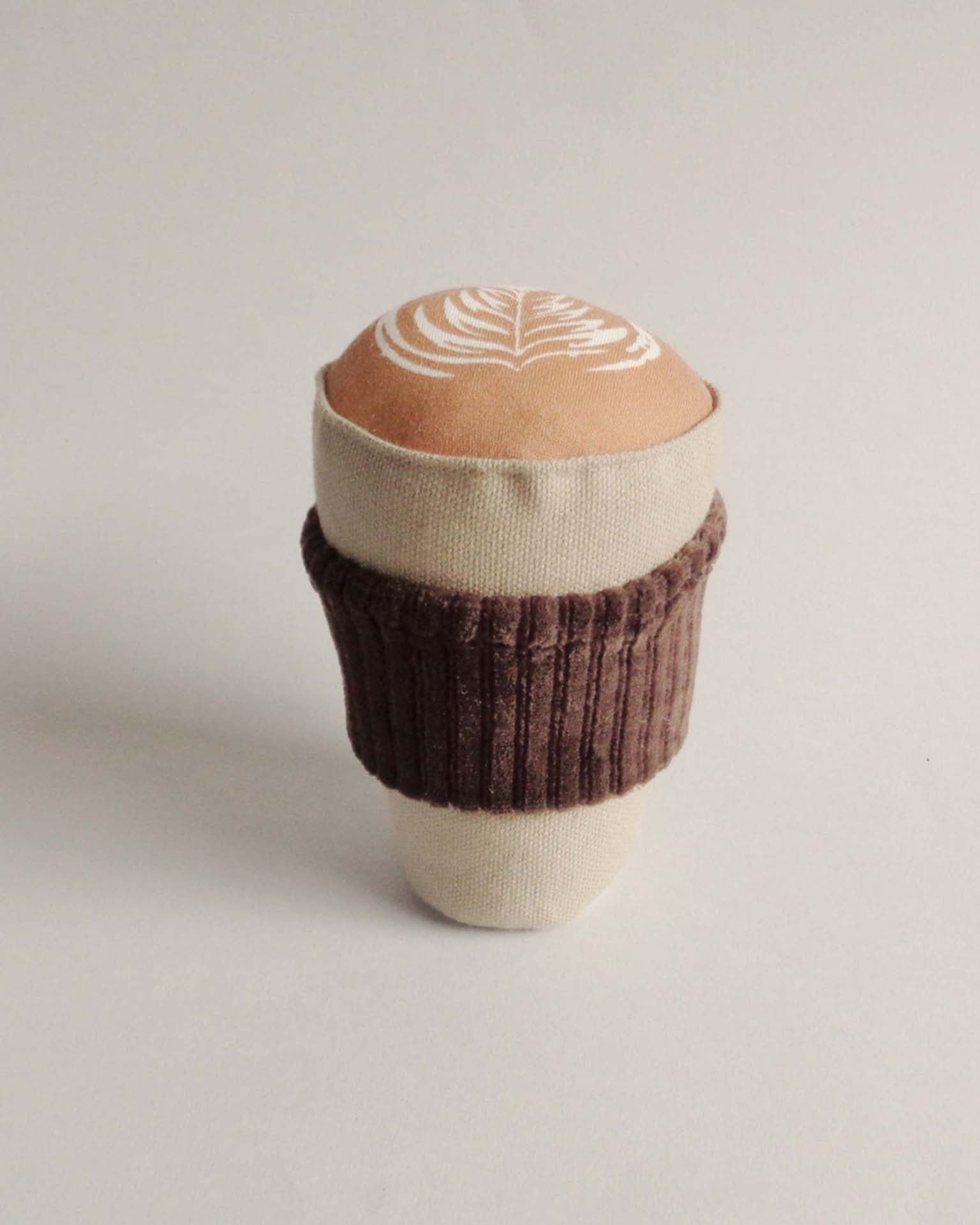 Cappuccino cup to go rattle, handmade of pure cotton canvas with plant-based silkscreen printed organic cotton jersey. Rattle inside makes a calm stimulating sound when shaken.