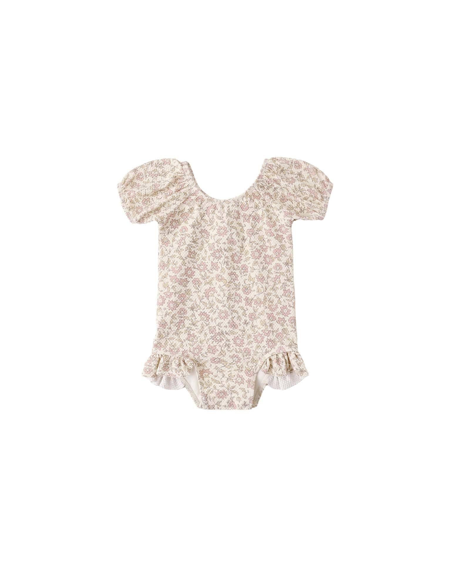 This one-piece bathing suit with puff sleeves and ruffle detail at the leg openings is girly and comfortable.