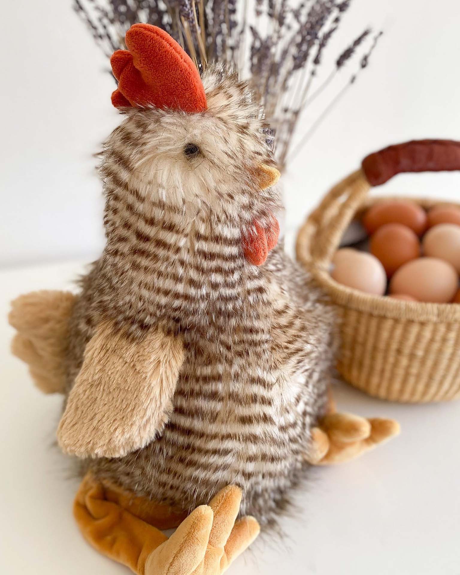 Look who just hatched in our office. Mon Ami's Chester Chicken Plush Toy will brighten an Easter celebration with his fiery comb, two-tone faux fur-feathers and showstopping orange feet and beak. Quirky but cute, this fluffy fellow proves that a chicken stuffed animal can be just as cuddly as a bunny. Celebrate spring with our adorable chicken plush toy, an egg-cellent companion for playtime, naptime and car time.