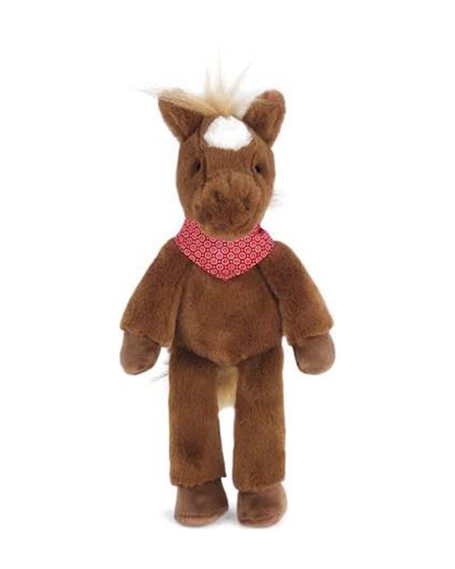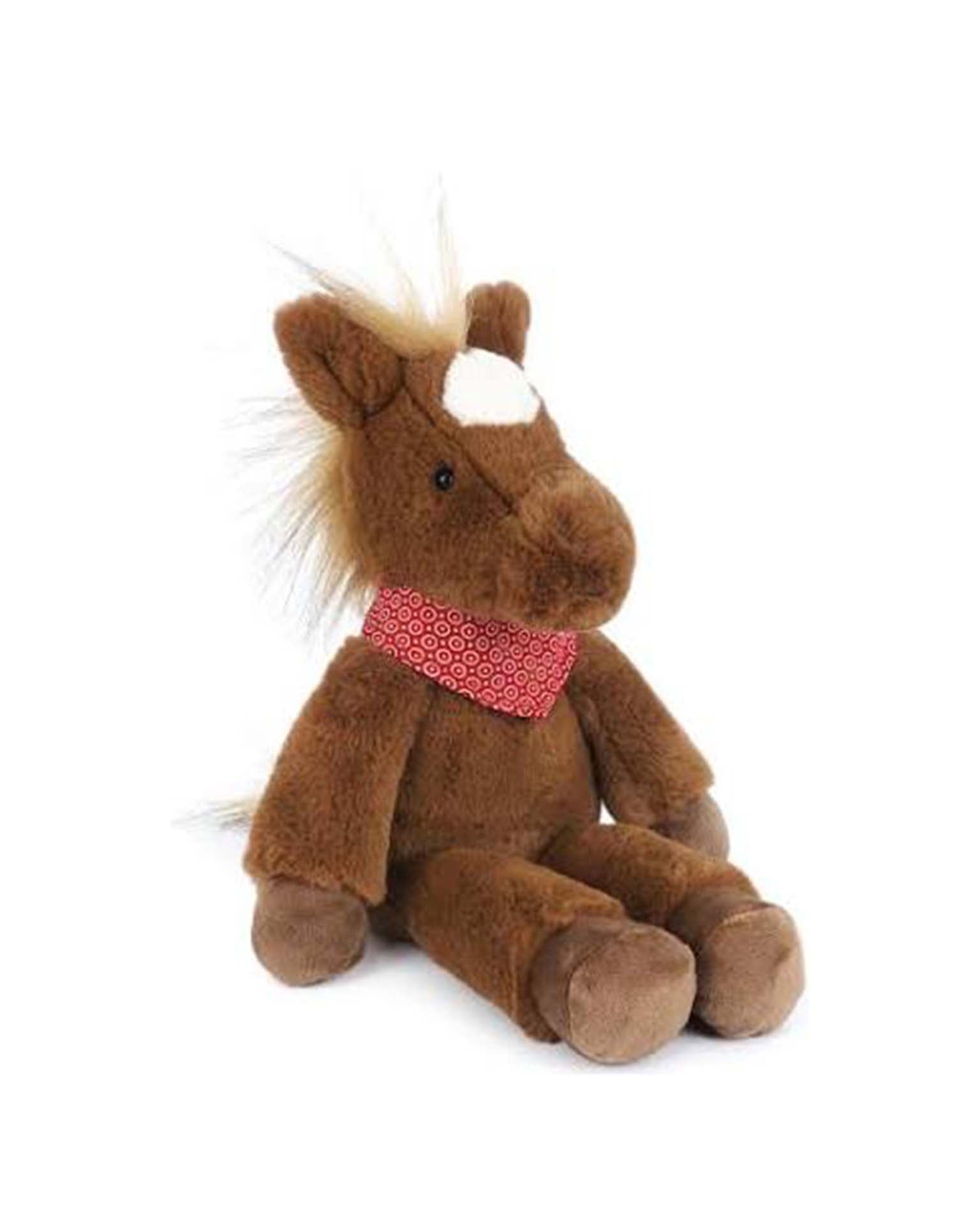 Giddy-up and off we go! Meet Cinnamon, the cuddly stuffed horse ready to trot into every adventure. With a chocolate brown body, white marking, and the fluffiest mane, Cinnamon is an absolute charmer. His hard eyes twinkle with personality, and the red printed bandana around his neck adds just the right touch of cowboy style. Thanks to his weighted bottom, Cinnamon sits upright and steady, always ready for little horse lovers to take him along on their journeys. This plush pal is sure to become a favorite companion for every horse-loving child!