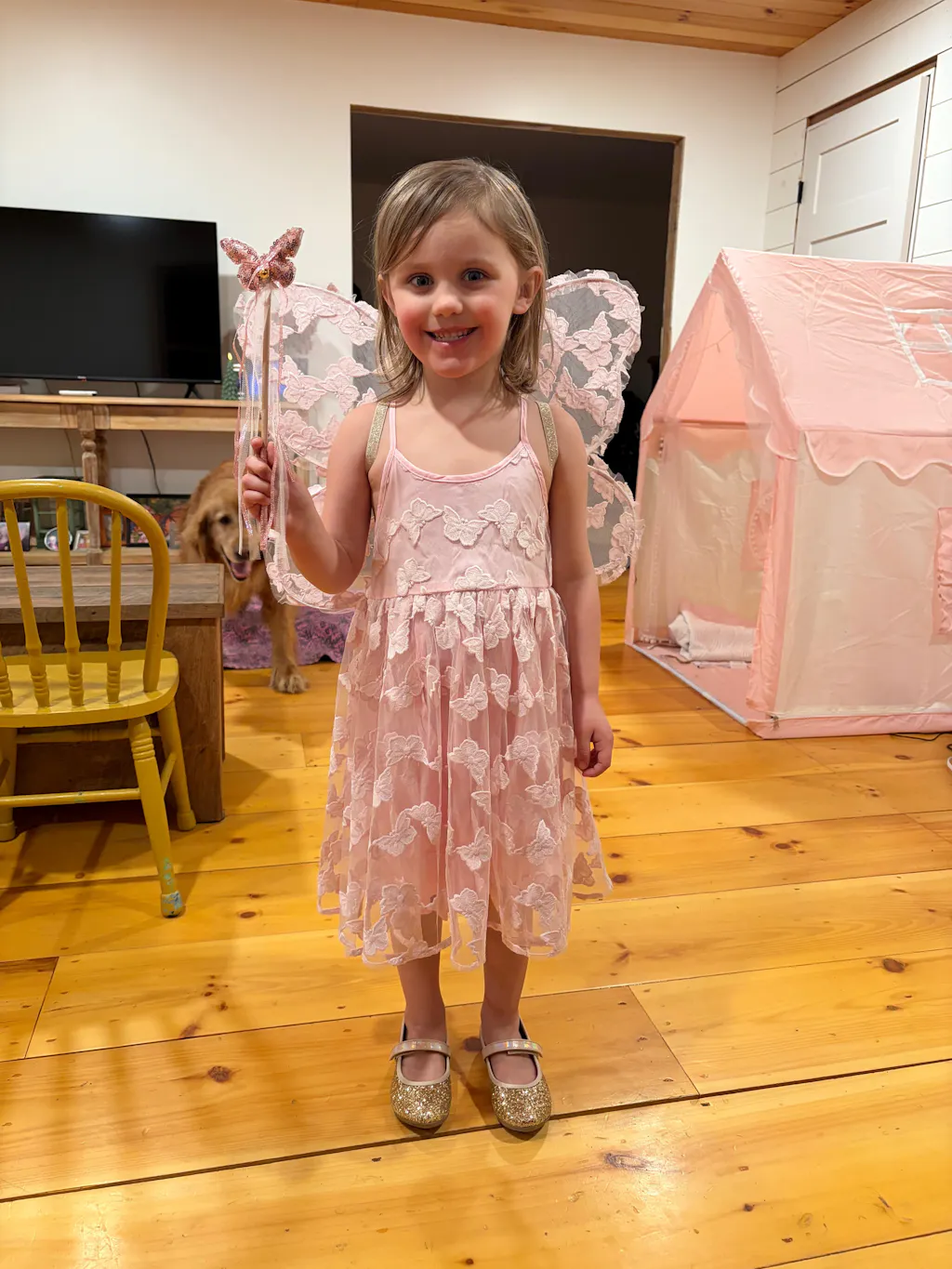 Our Clara Dress, crafted from delicate swiss dot tulle, features a smocked bodice adorned with a charming bow appliqué, bubble cap sleeves, and a full, tiered skirt for a whimsical, twirl-worthy look.