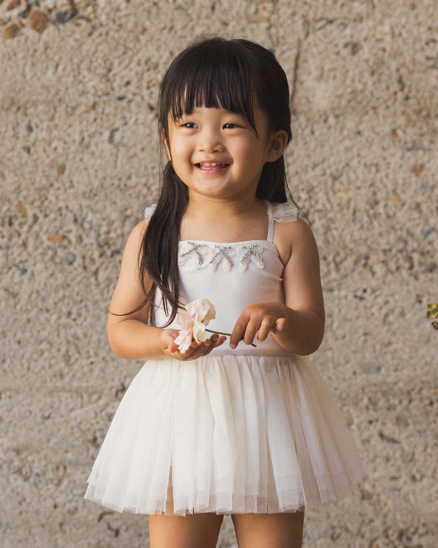 Shine in our Clementine Tutu, with a bow-appliqué leotard, full tiered tulle skirt, and adjustable ruffle straps—made for twirls, dress-up, and the most magical moments.