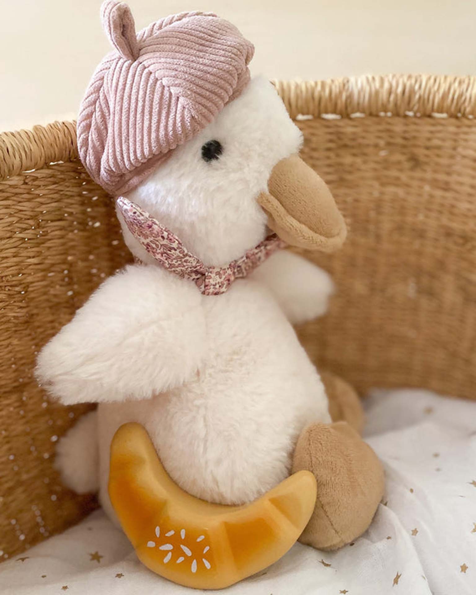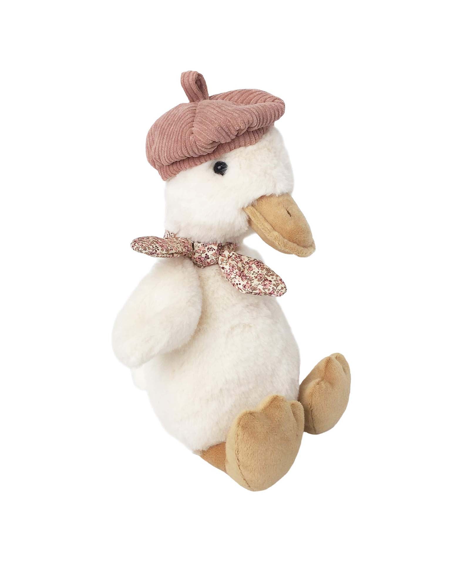Meet Colette the French Duckling. She loves everything French, and is always out and about in her mauve beret and floral scarf. Beautiful ecru fur, and velour details. Perfect for snuggling and play.