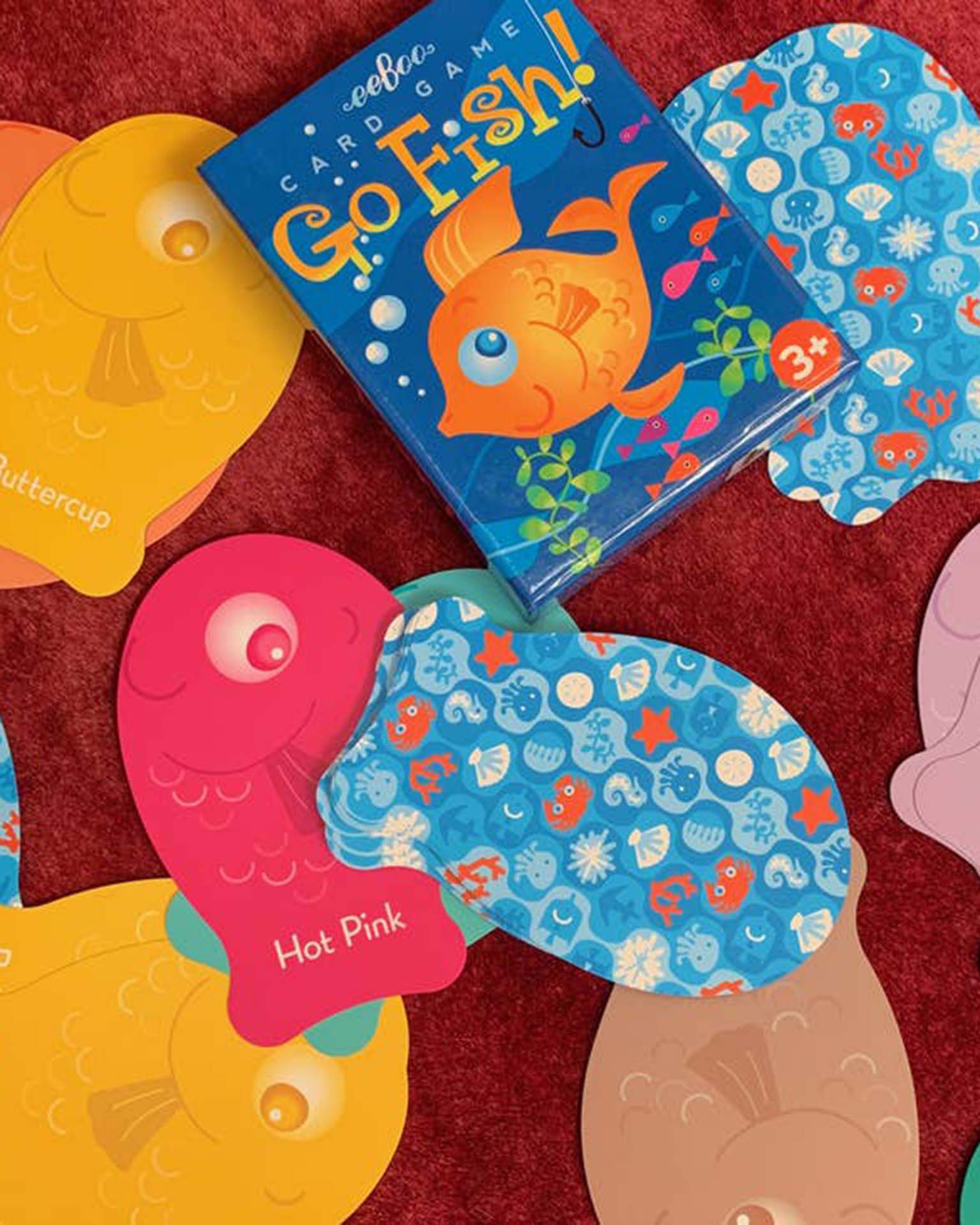 This new take on an old game involves fish-shaped cards and color matching, with bold colors like hot pink and chartreuse. A great first card game that is easy to play. Illustrated by Julia Gorton.