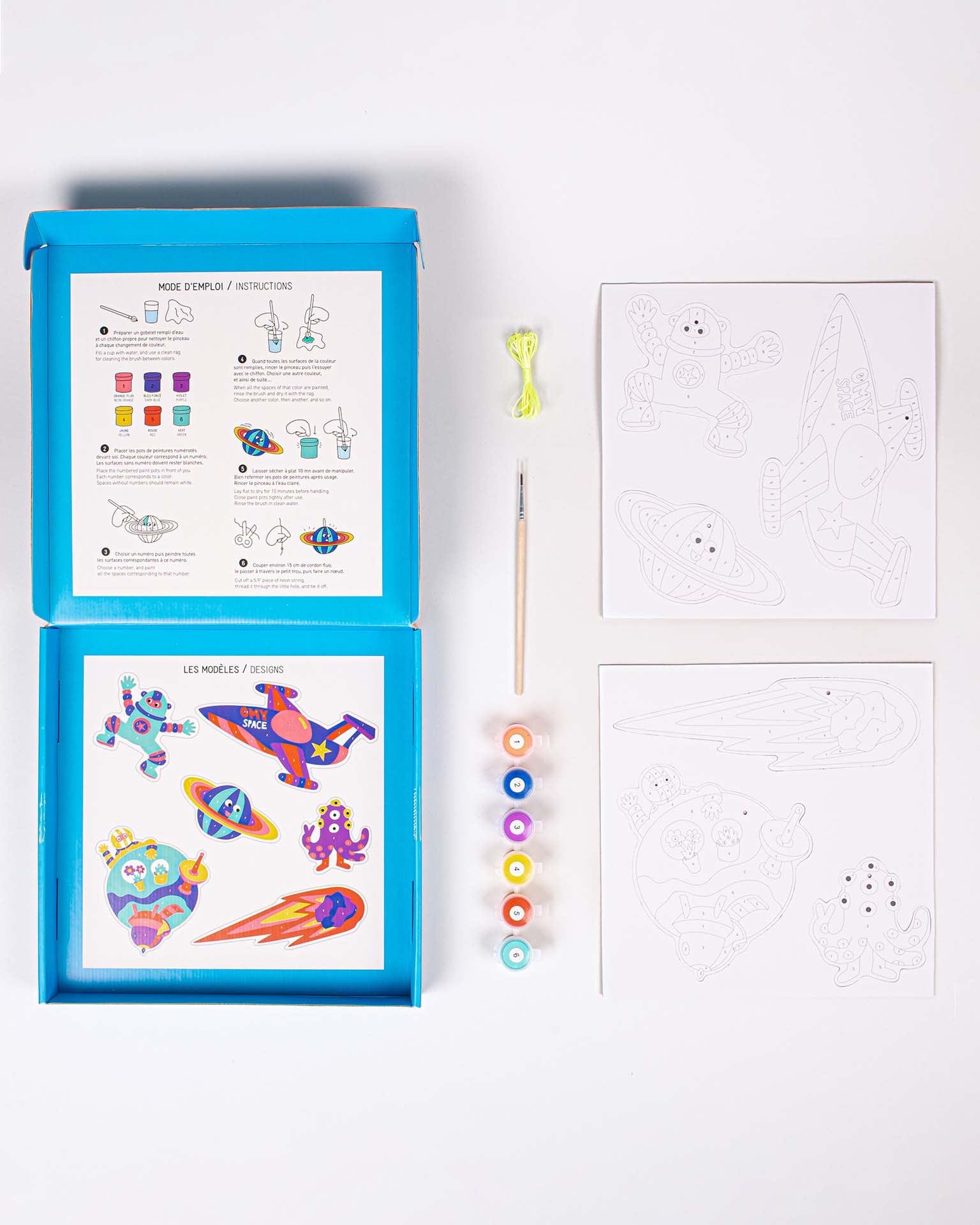 Play, paint and decorate! Touch the moon with your finger tips and discover the world among the stars. Follow the numbers to paint the illustrations. Once it is complete hang your pendants to enjoy or gift to a loved one.