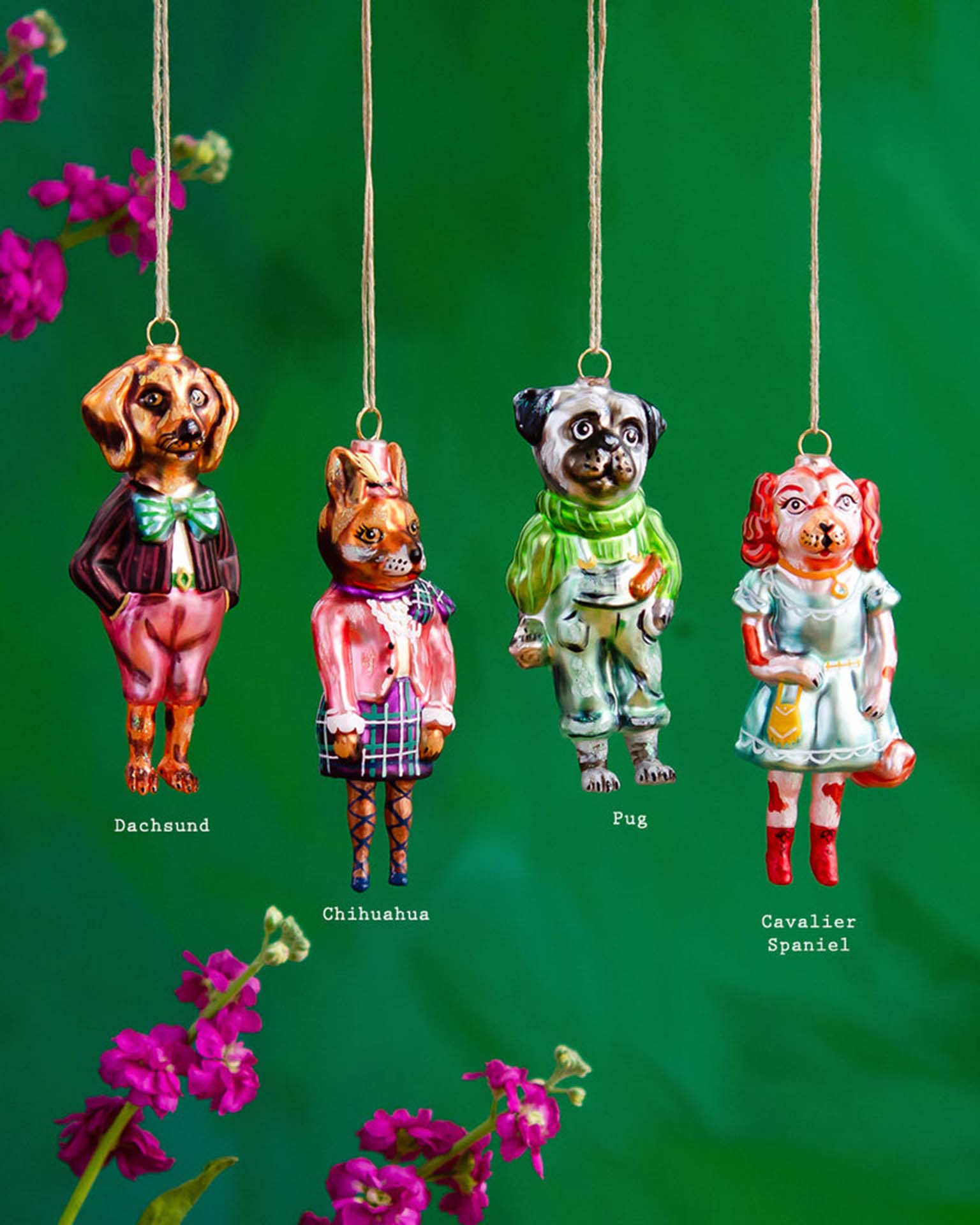 This beautiful set of dapper dogs is perfect for a whimsical, vintage tree. Featuring hand-painted bright colors and the sweetest little details. They are perfect on their own or as a set.