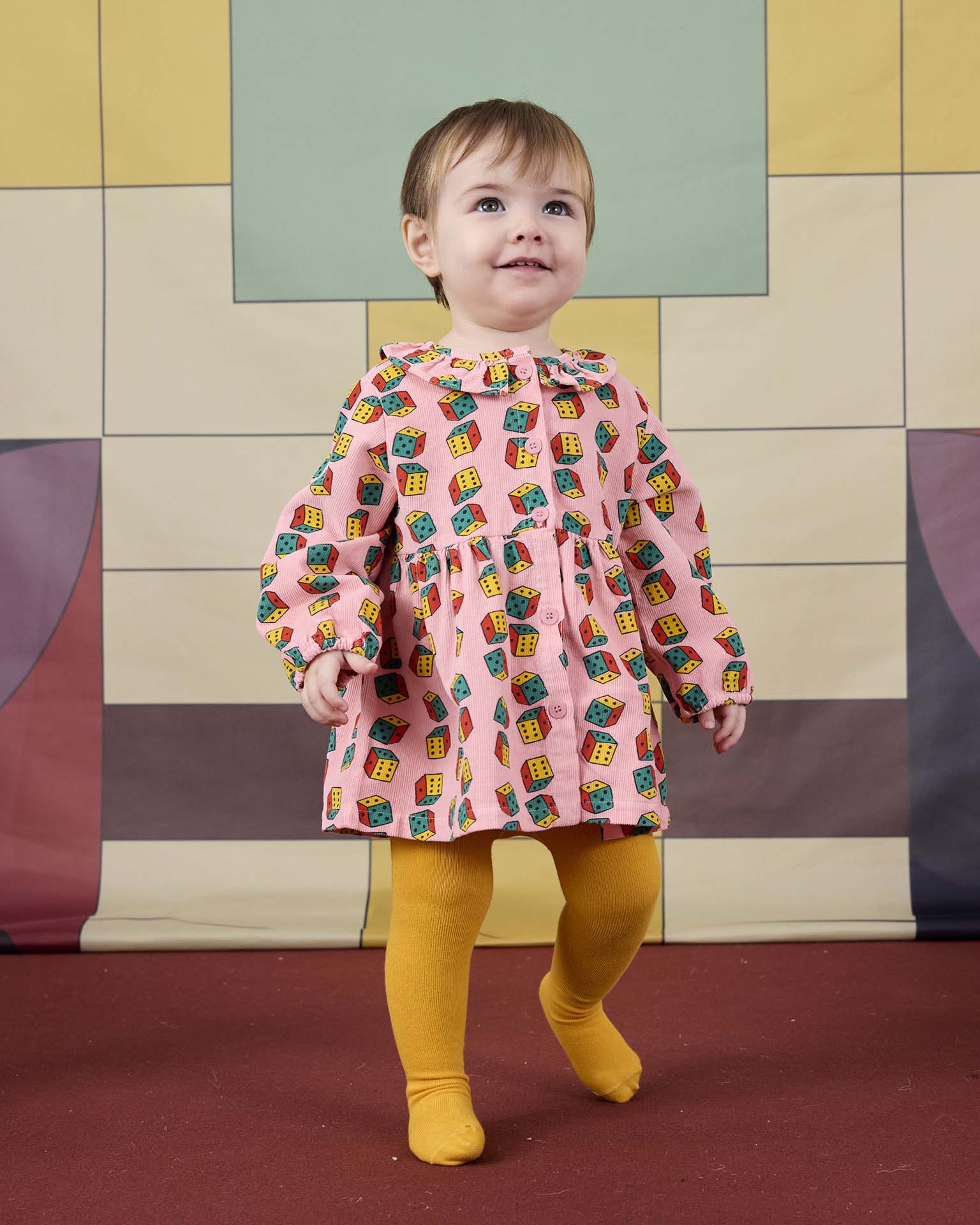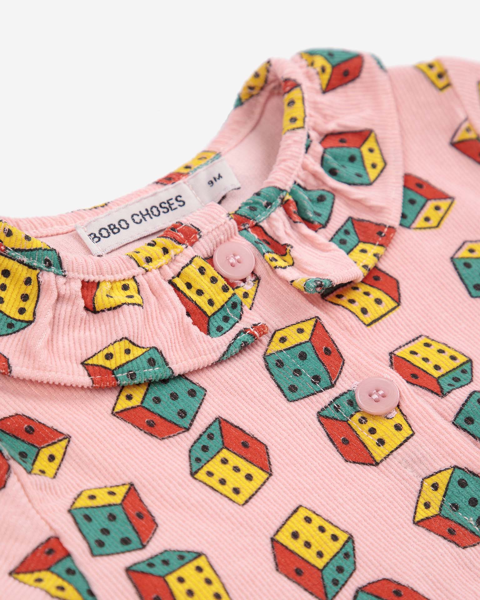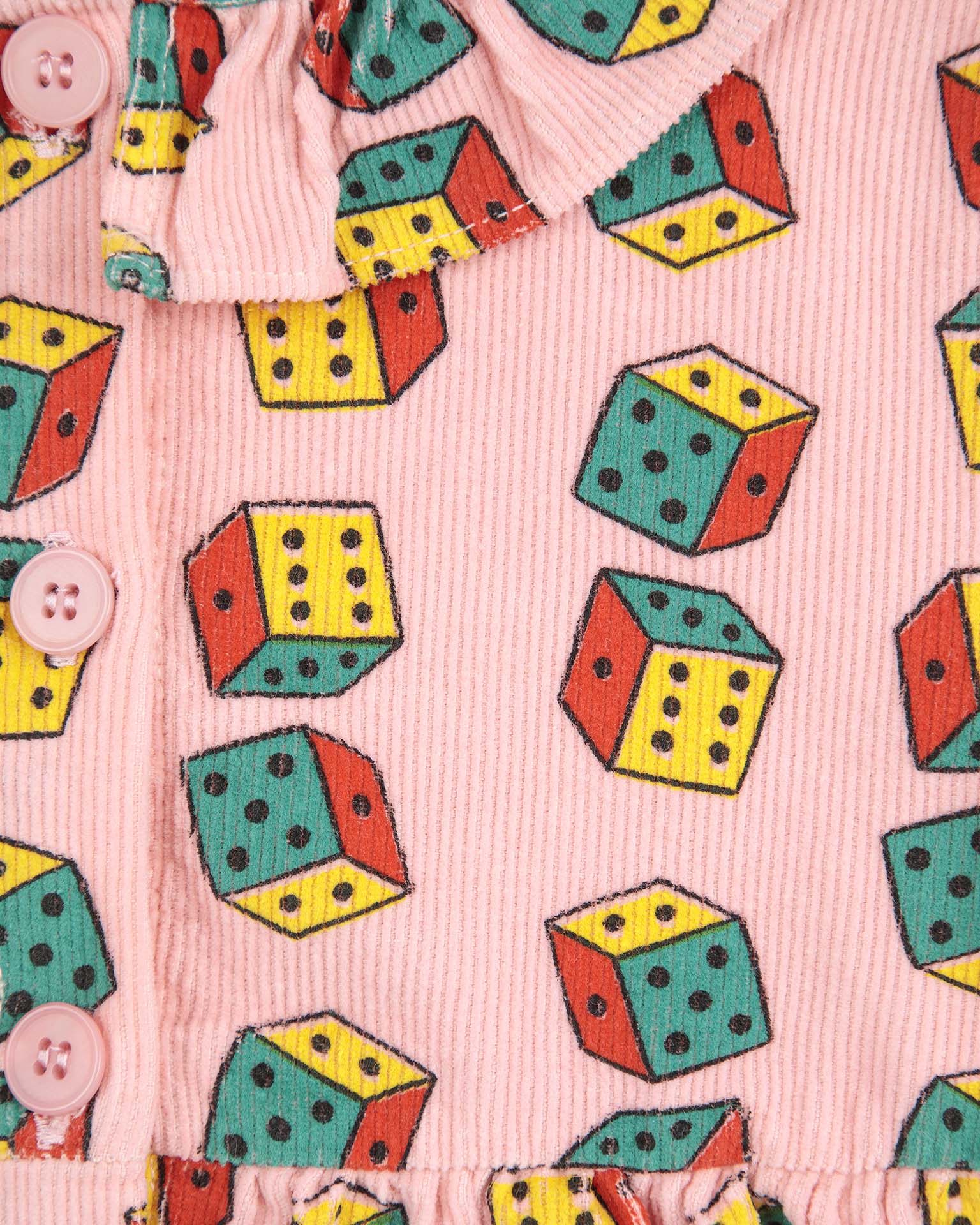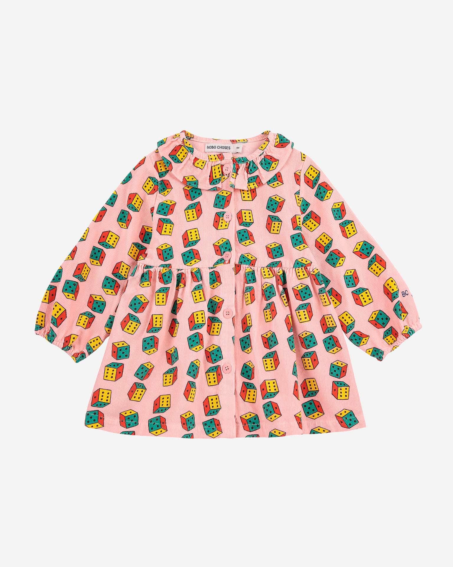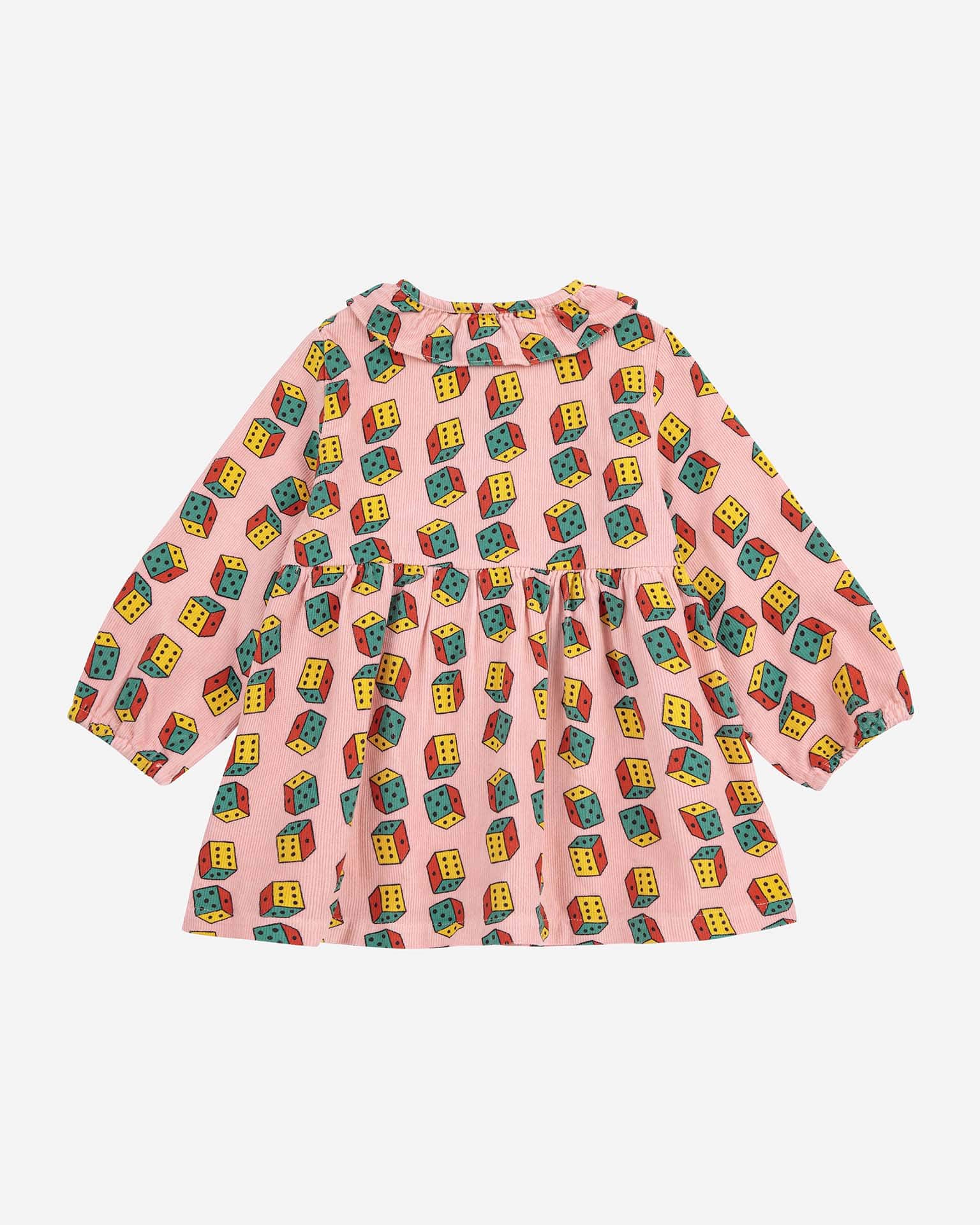 This micro corduroy long-sleeved dress is perfect for fall! Featuring a ruffled collar and dice all-over print. Pair it with some bright colored tights for a fun outfit.