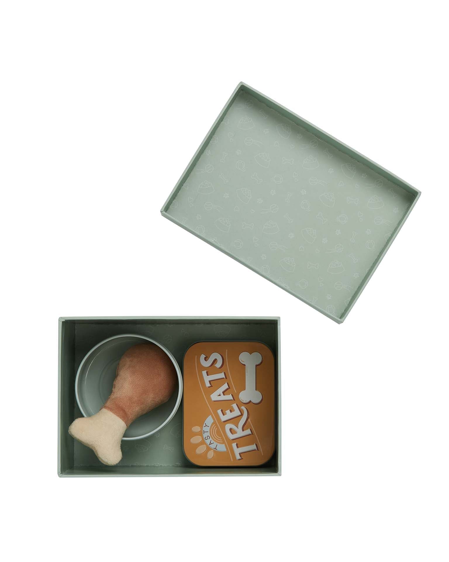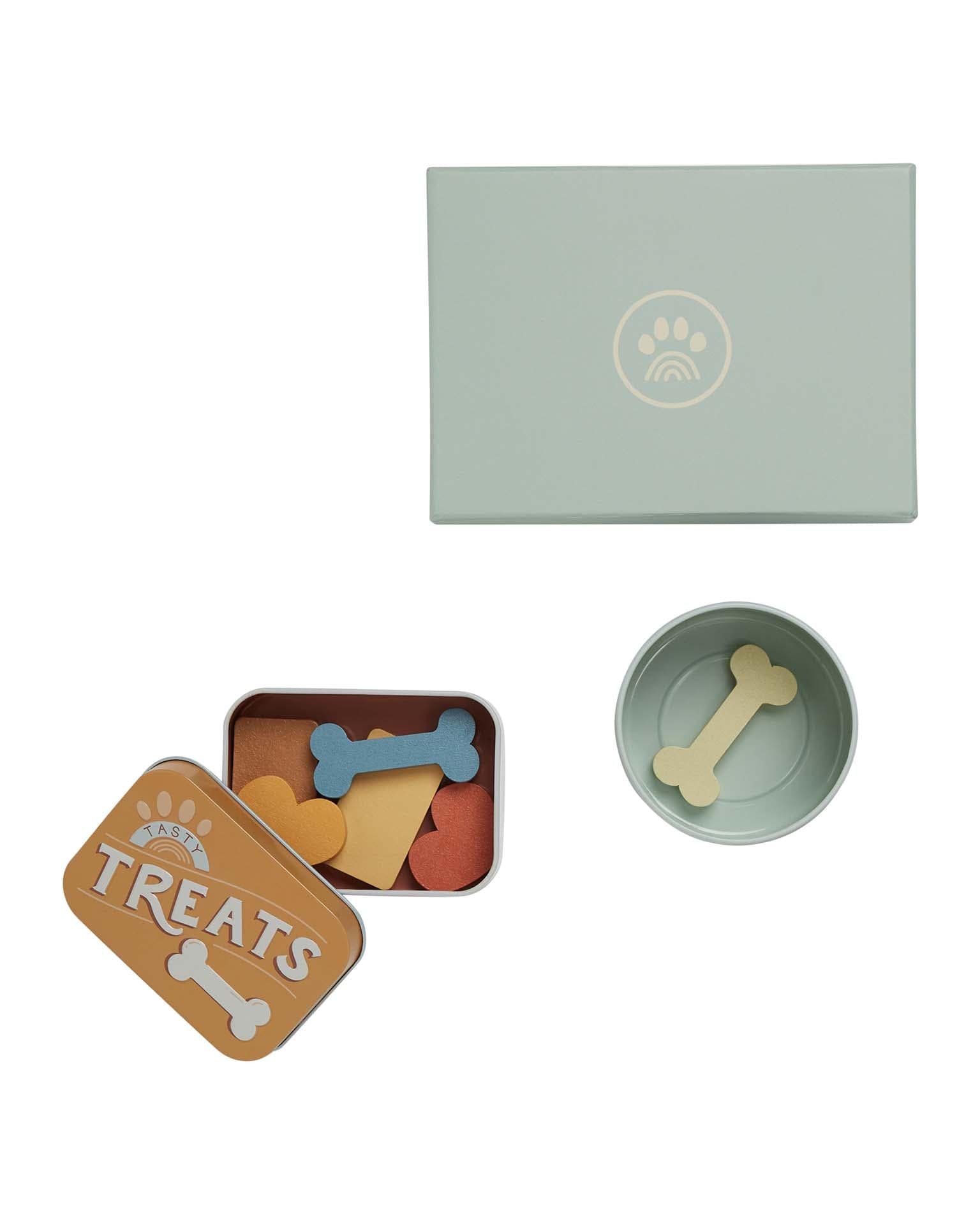 - Goodie Set includes 6 wooden magnetized treats in the shape of cookies, love hearts, and bones, plus 1 treat tin, 1 tin food bowl, and 1 magnetic plush drumstick