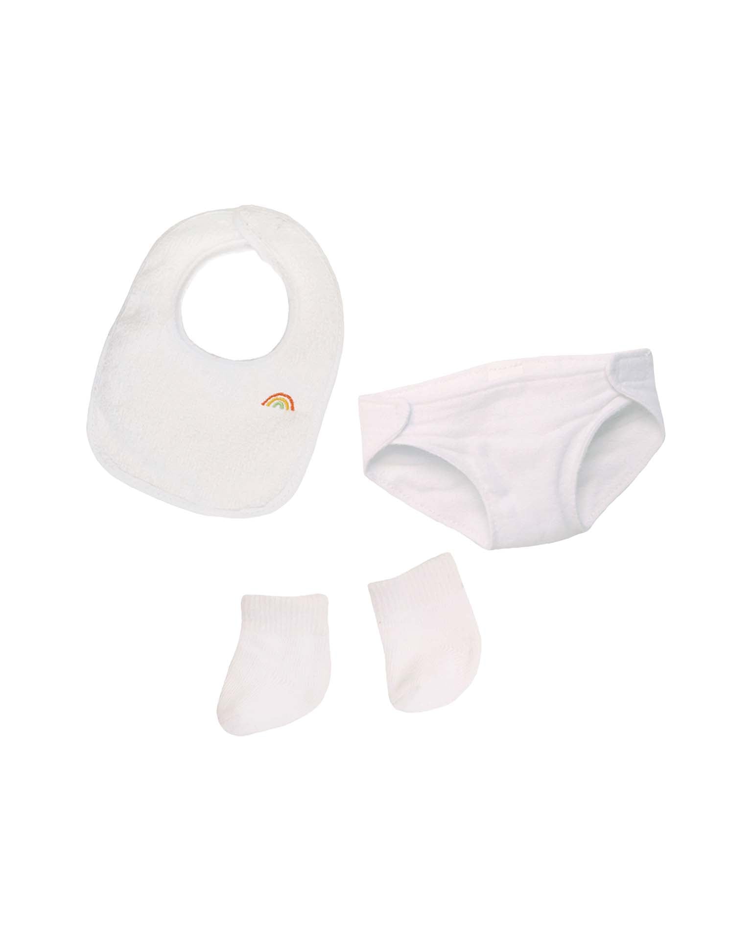 Dinkum Dolls around the world will be ready for TLC with our teeny doll Care Set. Change them into a fresh diaper, stock up on tiny socks, and avoid mess at mealtime with a custom embroidered bib - featuring the Dinkum Doll Rainbow over the heart.