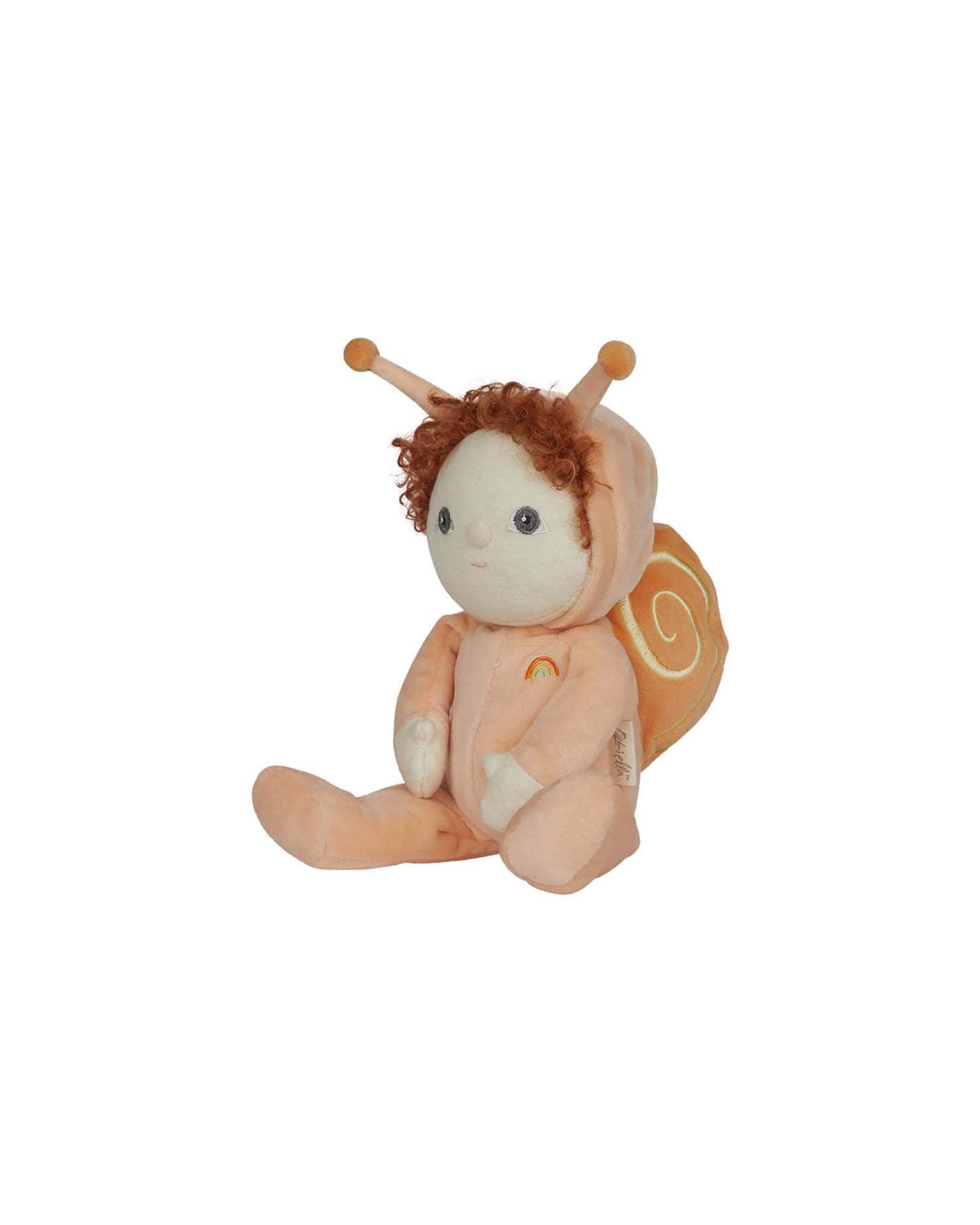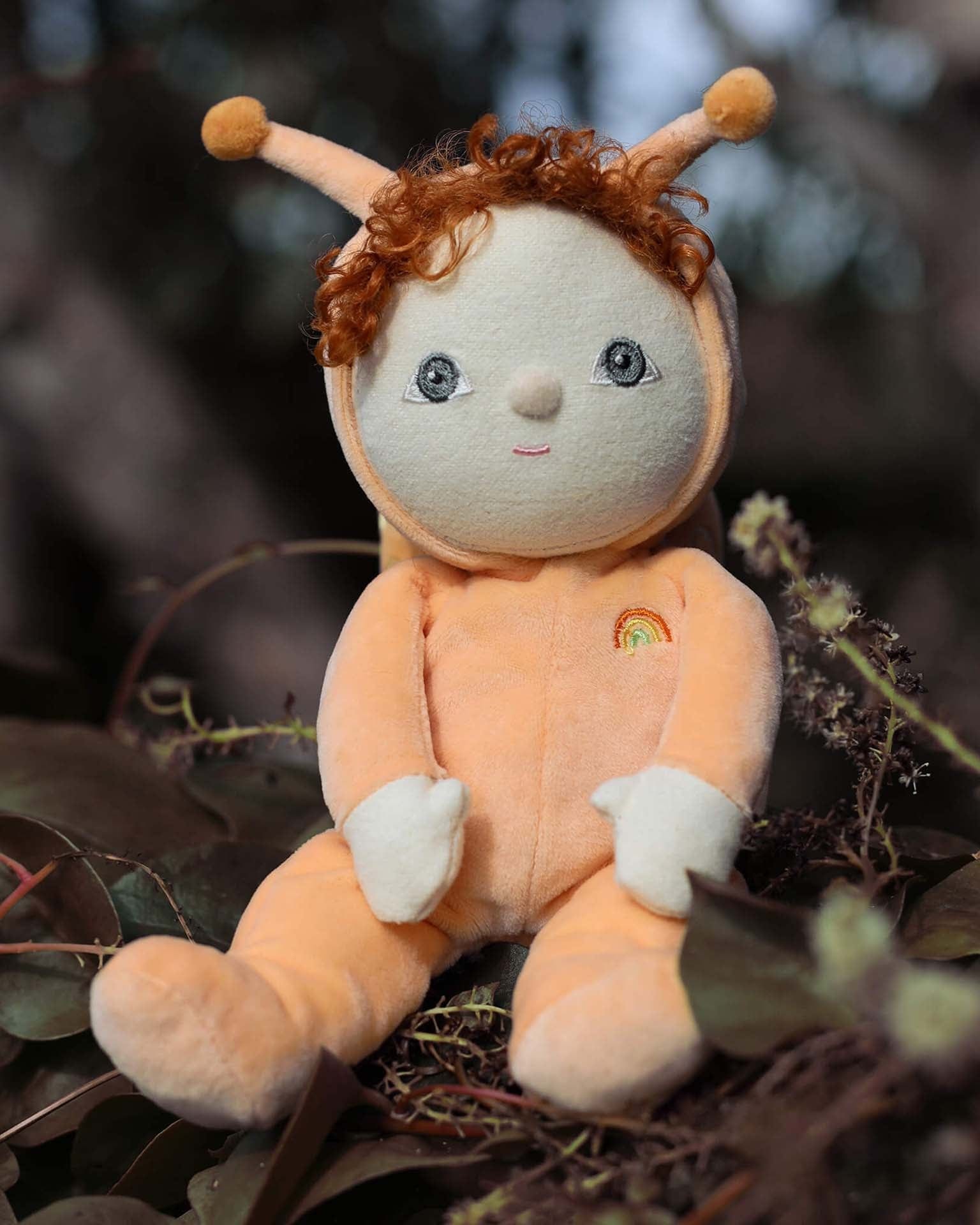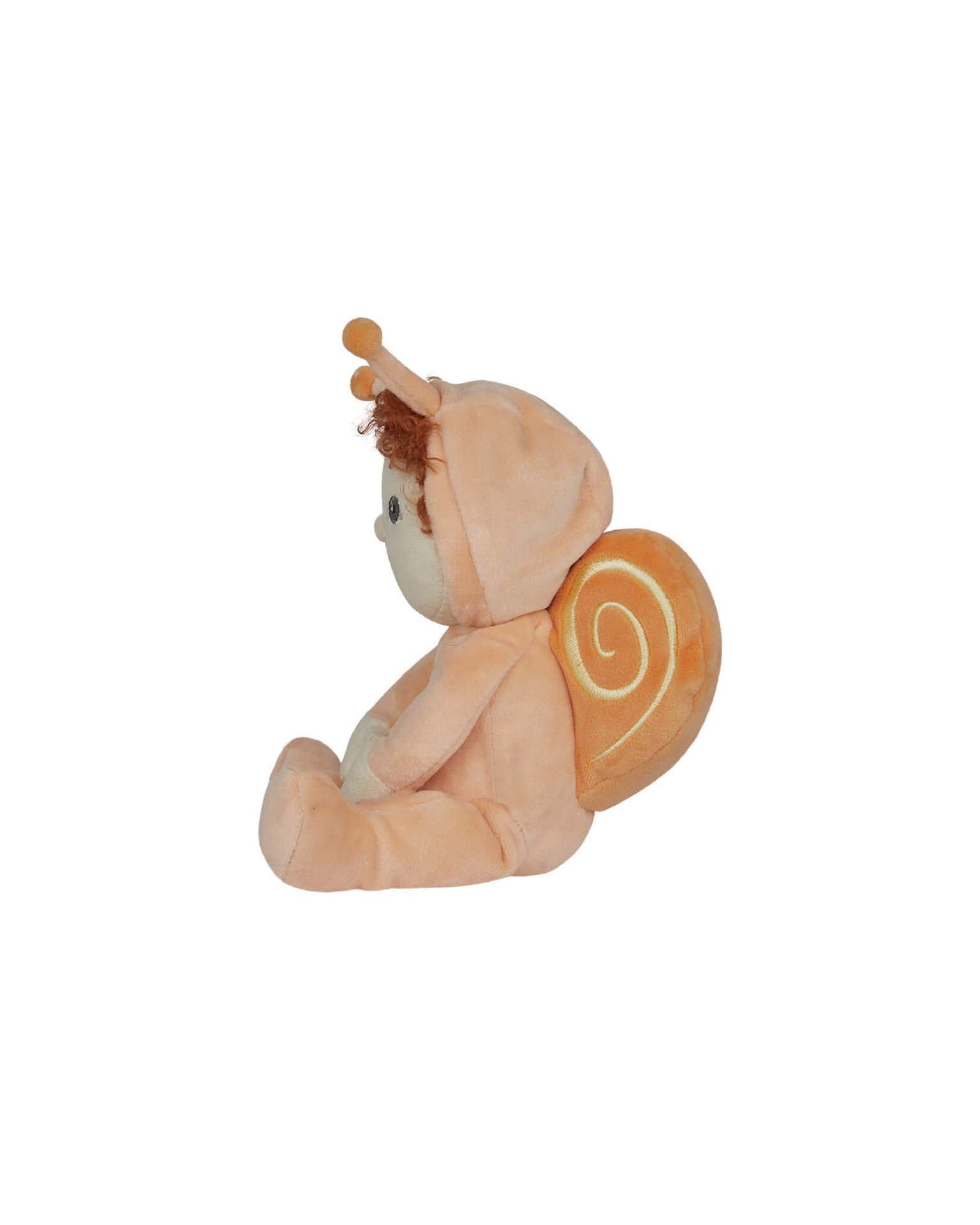 In a soft, velvety orange jumpsuit with matching hood and antennae, Scottie is the epitome of warmth and comfort. Rich, fiery orange curls and ashy hazel eyes are a soft contrast to the big, swirling snail shell on his back, which boasts a delightful yellow embroidery. With a gentle presence and laid-back style, Scottie is the perfect companion for little ones who love to slow down, snuggle, and enjoy the quiet moments.