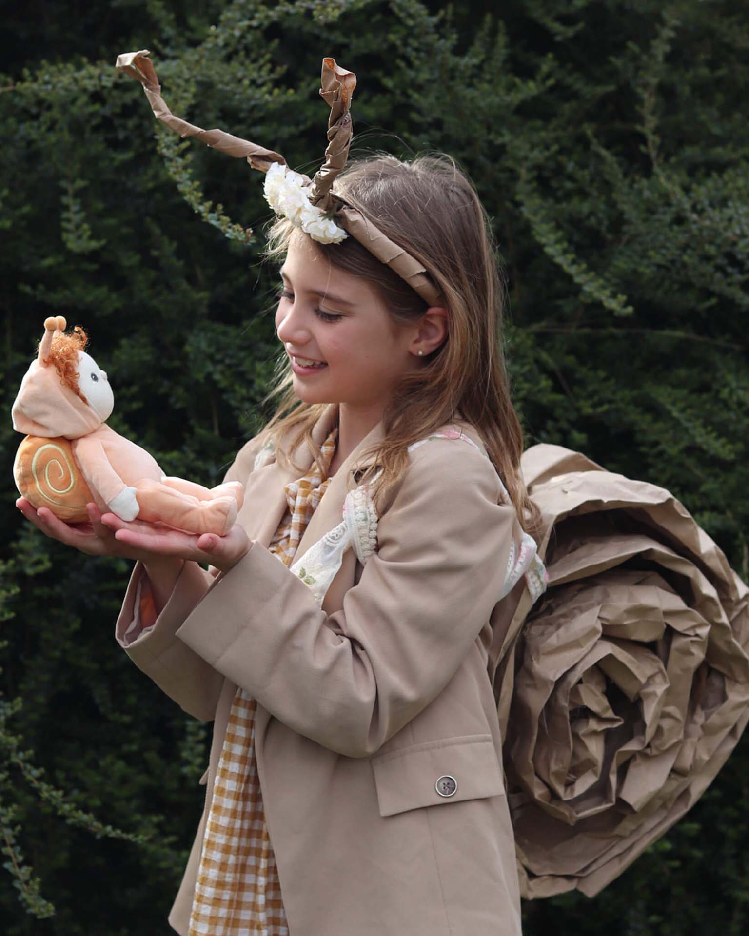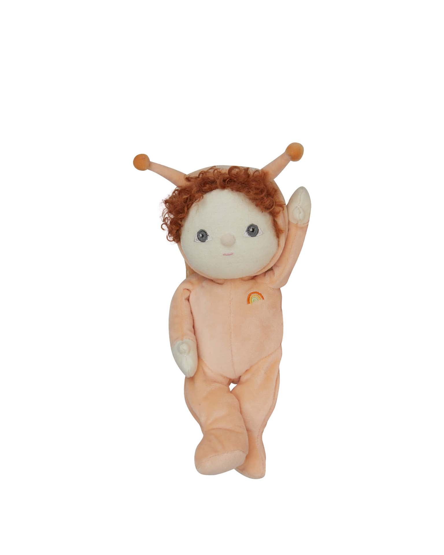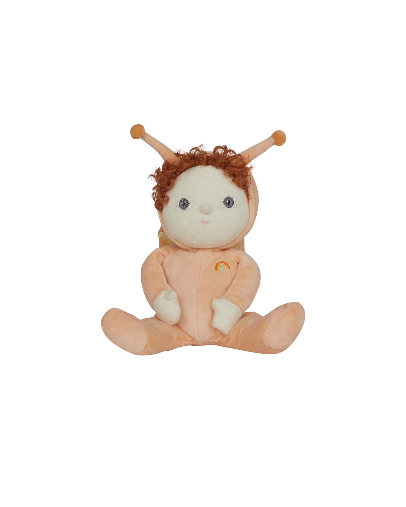 In a soft, velvety orange jumpsuit with matching hood and antennae, Scottie is the epitome of warmth and comfort. Rich, fiery orange curls and ashy hazel eyes are a soft contrast to the big, swirling snail shell on his back, which boasts a delightful yellow embroidery. With a gentle presence and laid-back style, Scottie is the perfect companion for little ones who love to slow down, snuggle, and enjoy the quiet moments.