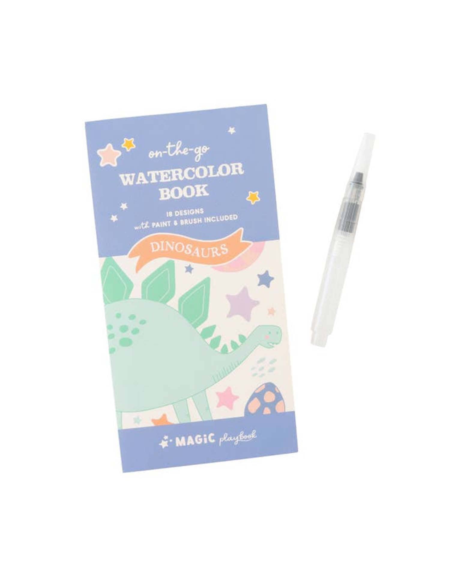 - Approximately 4x8 inch watercolor book with 18 pages of dinosaur-themed scenes