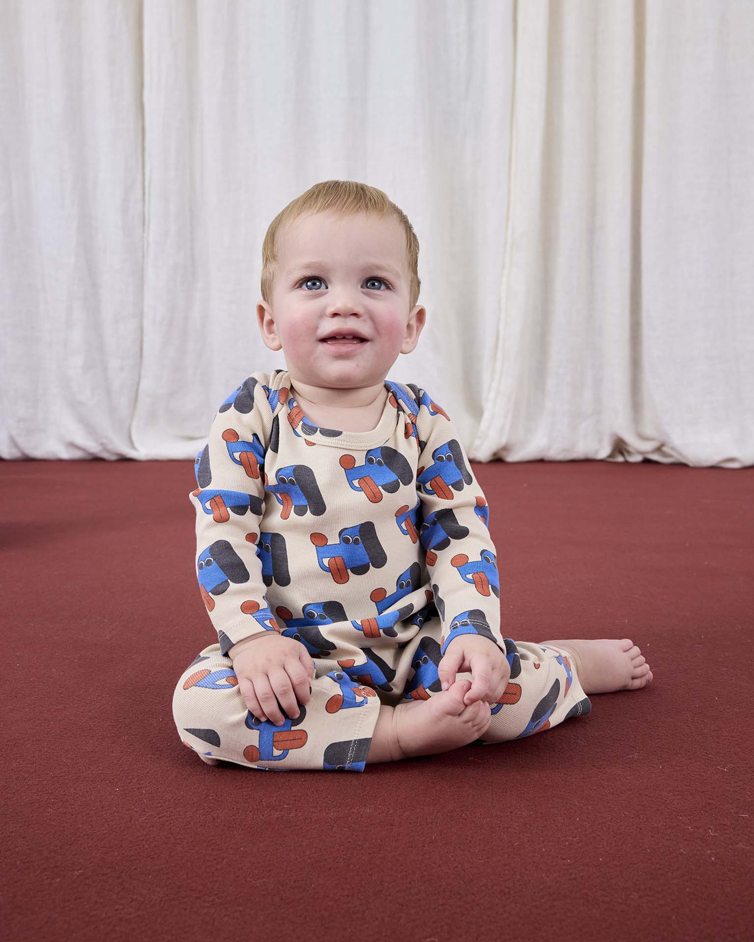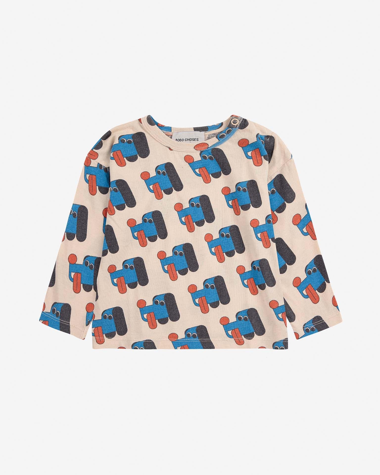 This doggy mate all over tee is fun and bright. With long sleeves and a snap button at the right shoulder for easy changing, this shirt is comfy and soft for all-day wear.