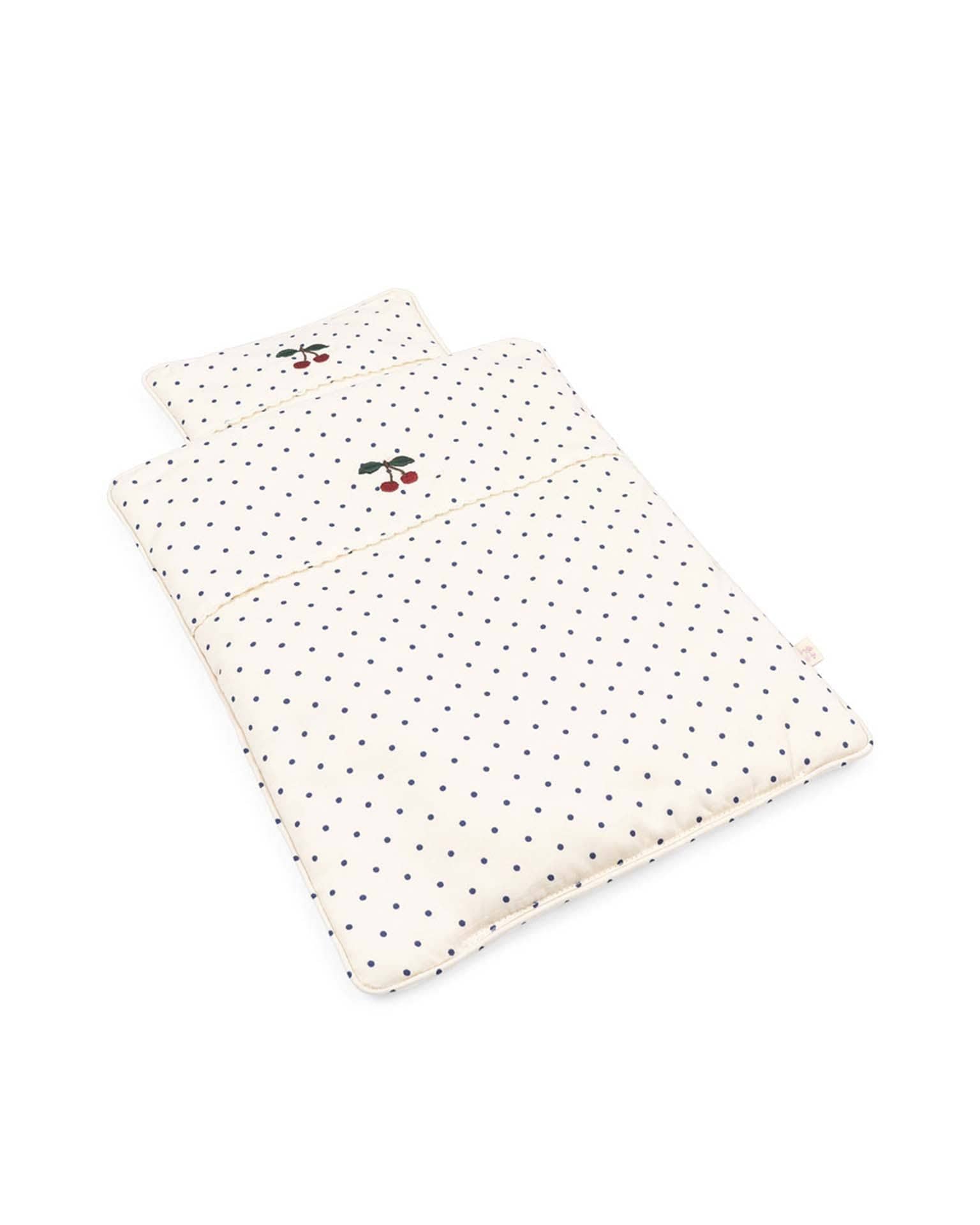 Padded doll bedding made in 100% cotton. Designed with soft piping. The bedding comes in a matching totebag with a tie-string closure.