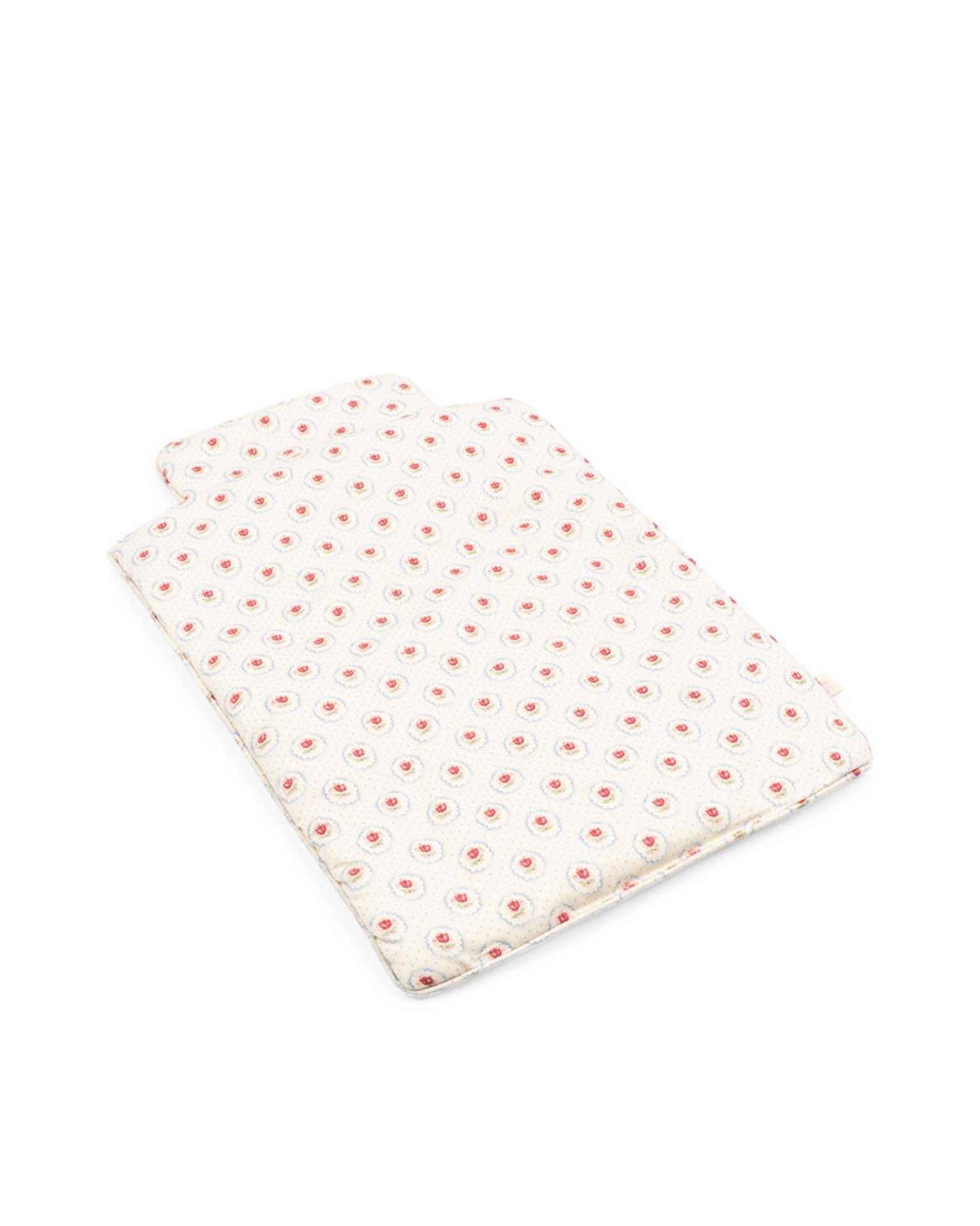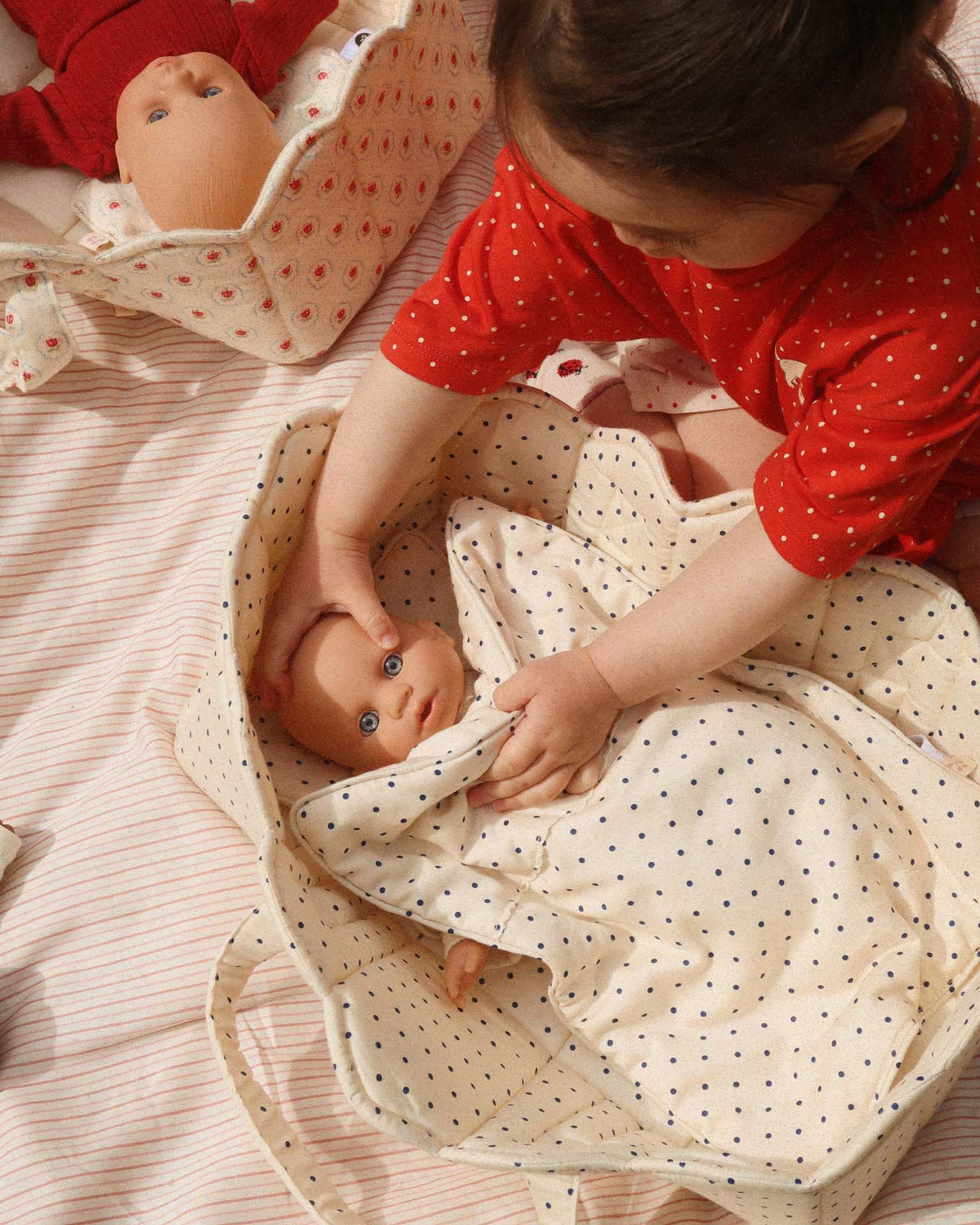 Padded doll bedding made in 100% cotton. Designed with soft piping. The bedding comes in a matching totebag with a tie-string closure.