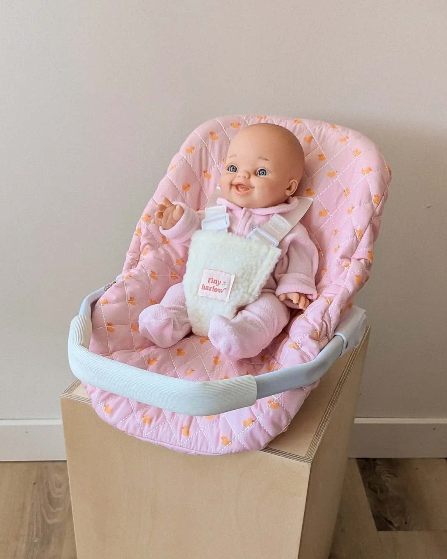 Introducing the Tiny Harlow capsule, perfect for carrying your precious doll! Practical, durable, and pretty, it will delight children who want to take their doll everywhere with them. The doll even attaches like a real baby, using a strap and a click closure! The handle can be placed on top for easy transport. The essential accessory for taking care of your doll!