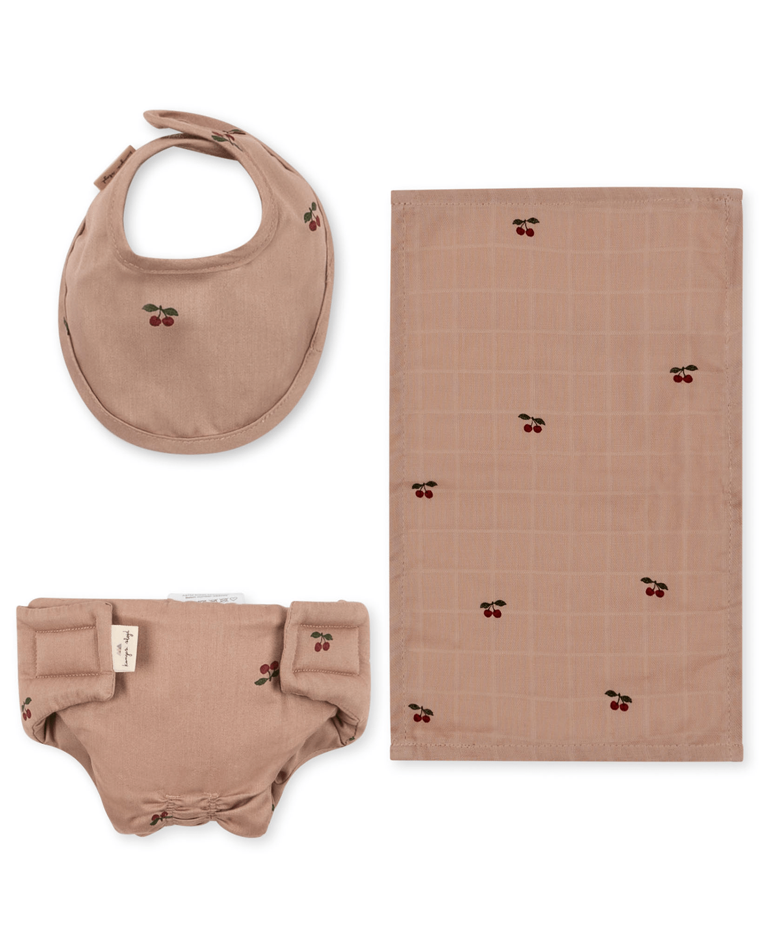 This set is perfect for play with baby dolls or stuffed friends. Made from 100% organic cotton, this set features a bib, changing pad and diaper with velcro closures.