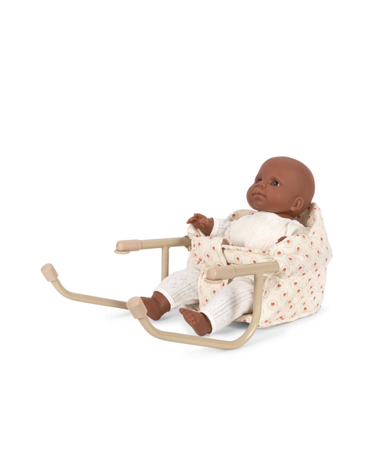 Doll table chair made in 100% quilted cotton with an iron frame. Easily attaches to the table. Designed with scallop edge details. It fits tabletops up to 2,2 cm in height. Small parts. Not suitable for children under 3 years.