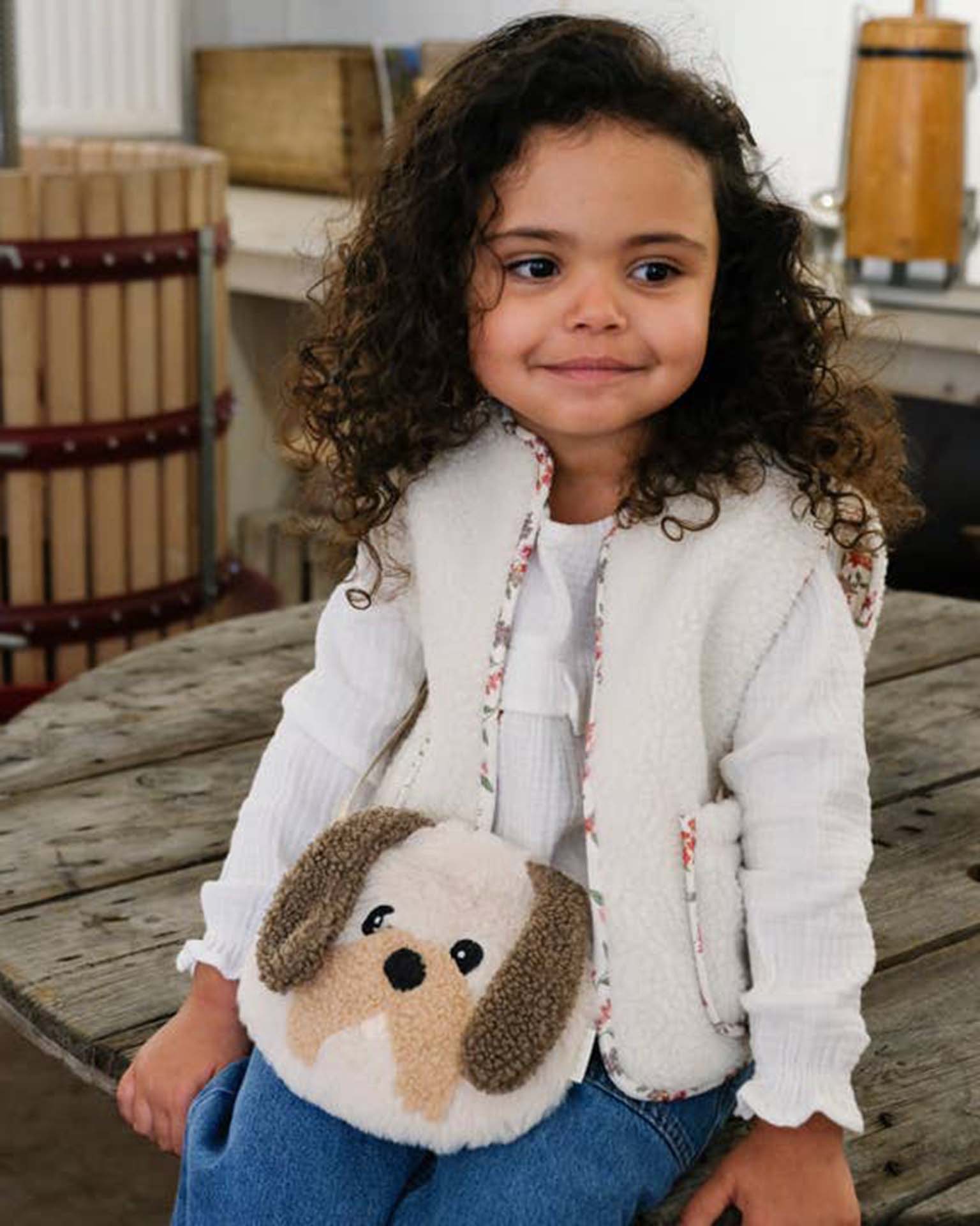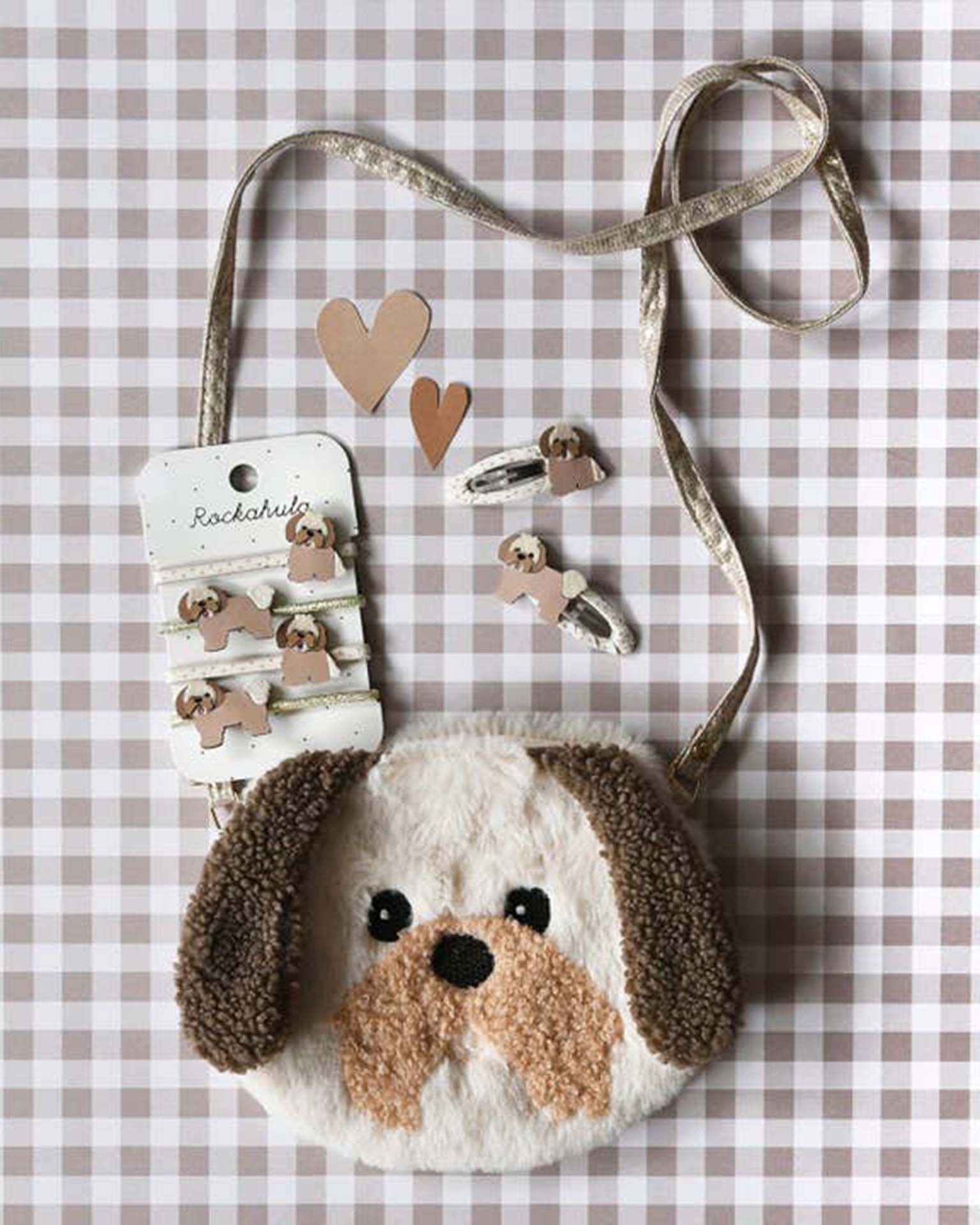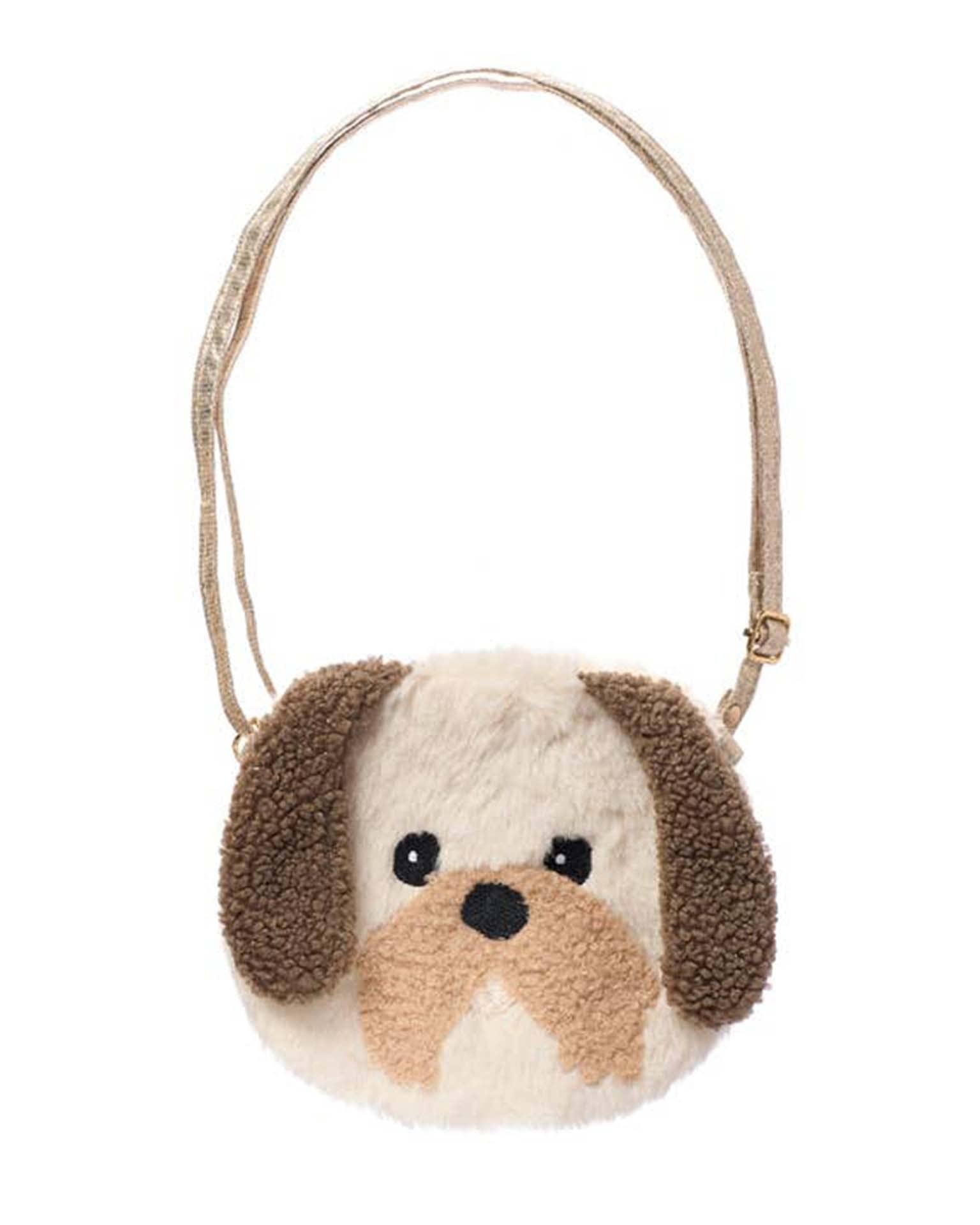 Our darling Dolly Dog will set little tails wagging! Made from the softest faux fur fabric, with floppy boucle ears, boucle moustache and a sweet embroiderry face. Fully lined in brown heart scattered fabric, this bag features a magnetic dot closure and a strap with a break point for safety.