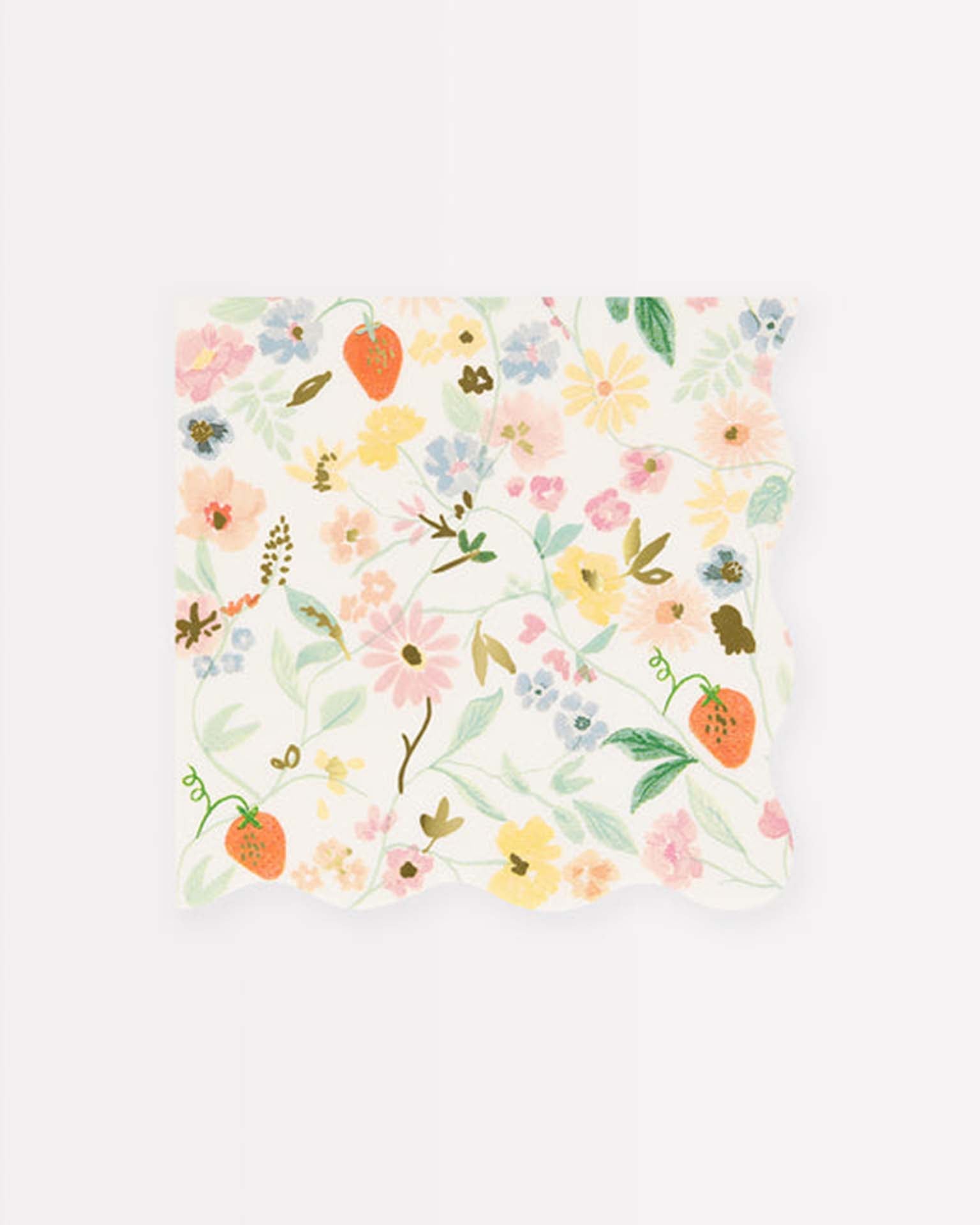 An elegant combination of watercolor flowers, strawberries and on-trend bows on these napkins is perfect for garden parties, bridal showers or any celebration where you want a refined effect.