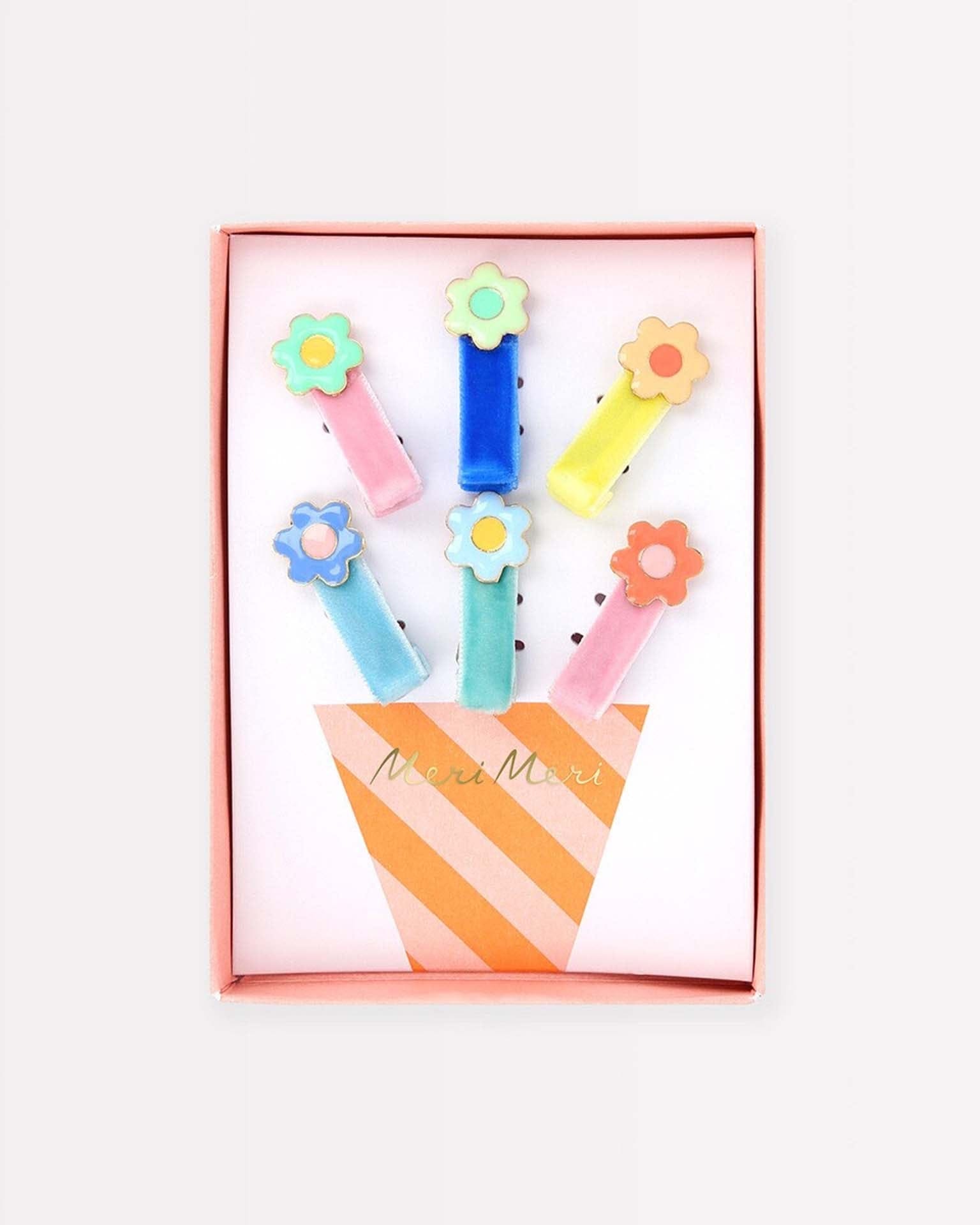Add a touch of floral beauty to your hair with these enamel daisy hair clips. The pack contains six different color combinations, ideal to complement or coordinate with your everyday outfits or for a party look. The flowers are teamed with velvet ribbons for a luxurious effect. They're presented on a card with a flower pot illustration, so make a wonderful gift for kids aged 8+, and adults, who love fun hair accessories.