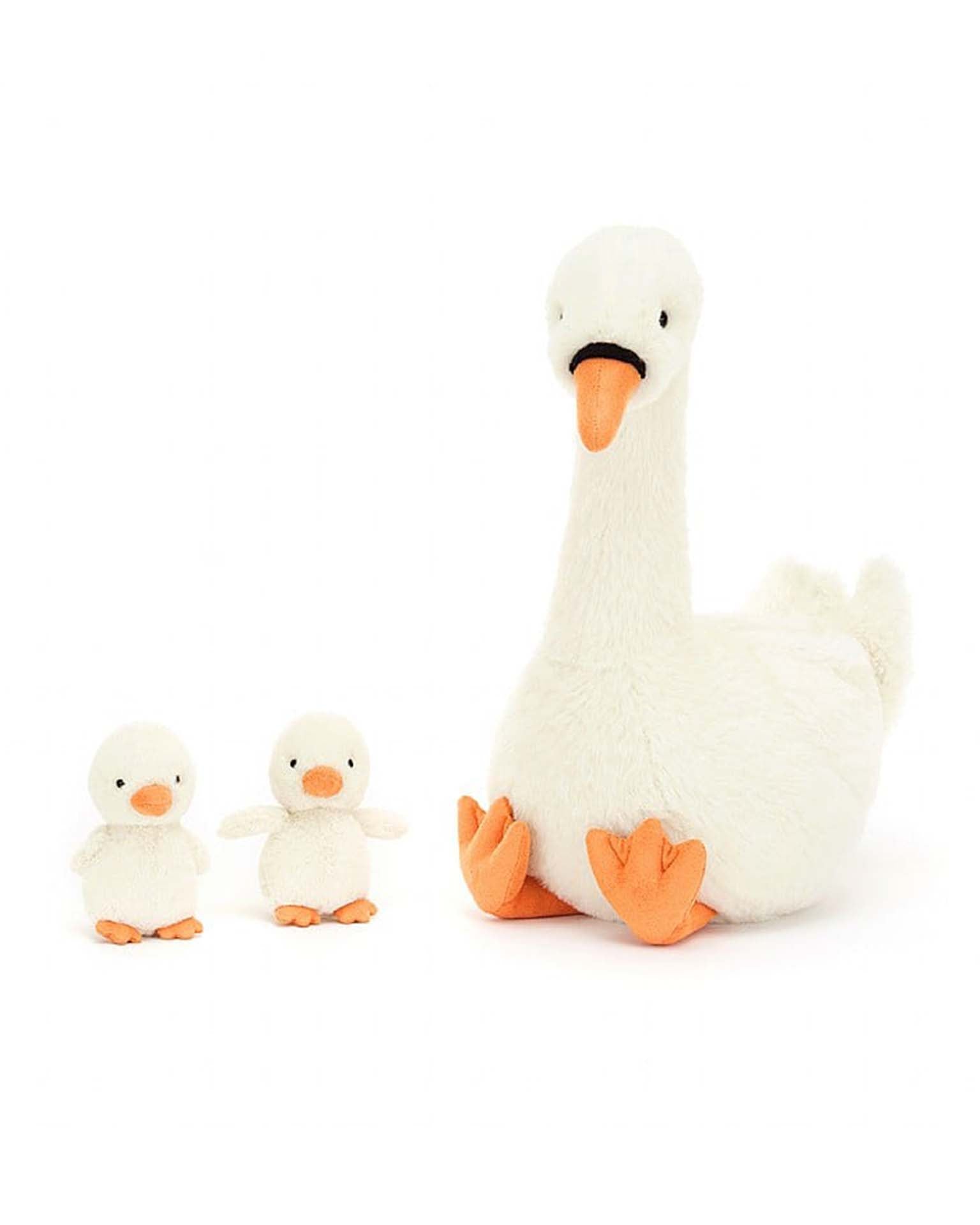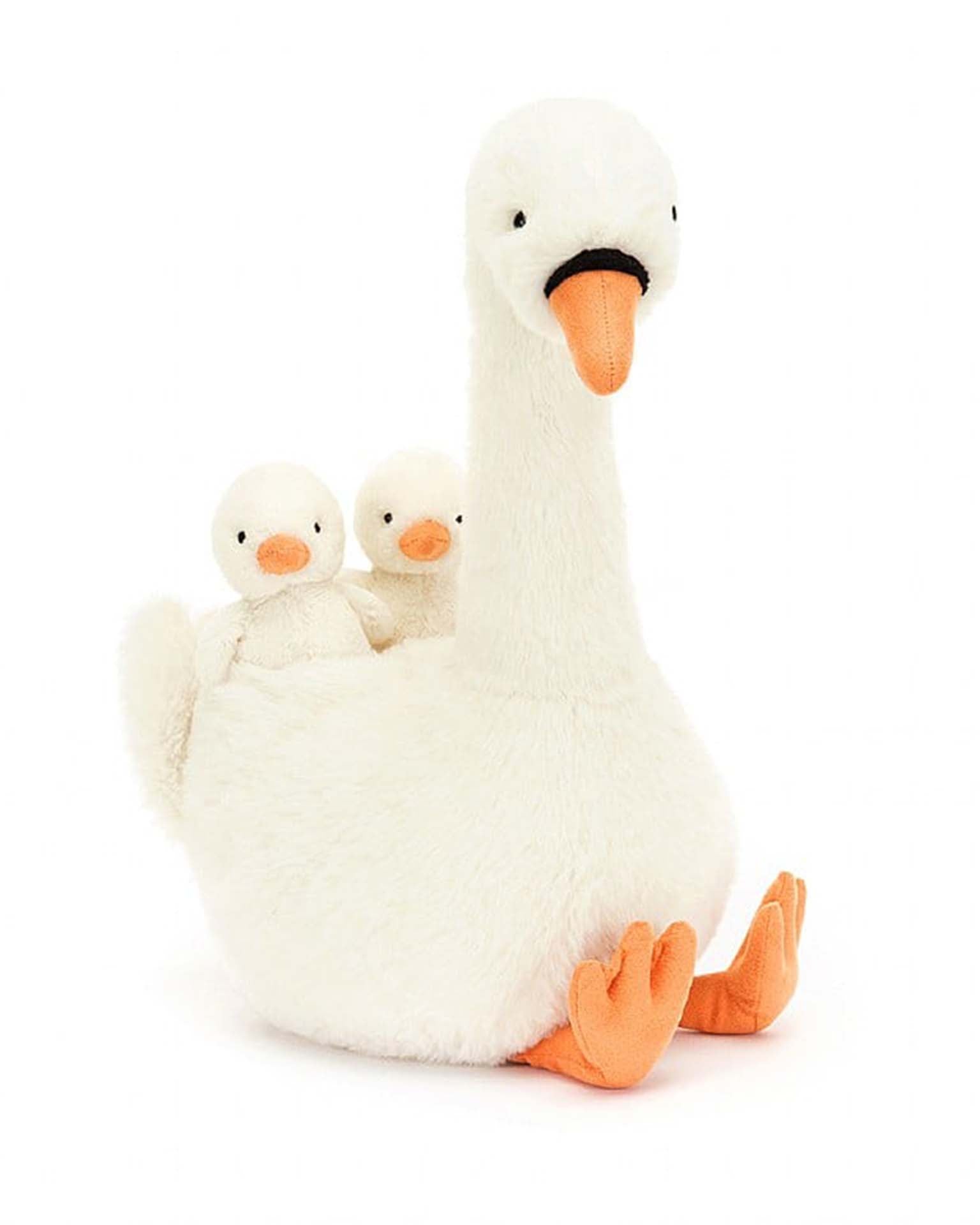 Featherful Swan is a very proud parent, protecting twin cygnets with their fluffy cream wings! This elegant swan has rich vanilla fur, set off by orange suedette feet and a matching beak with piping detail. The babies snuggled on their snowy back can pop out to explore by themselves!