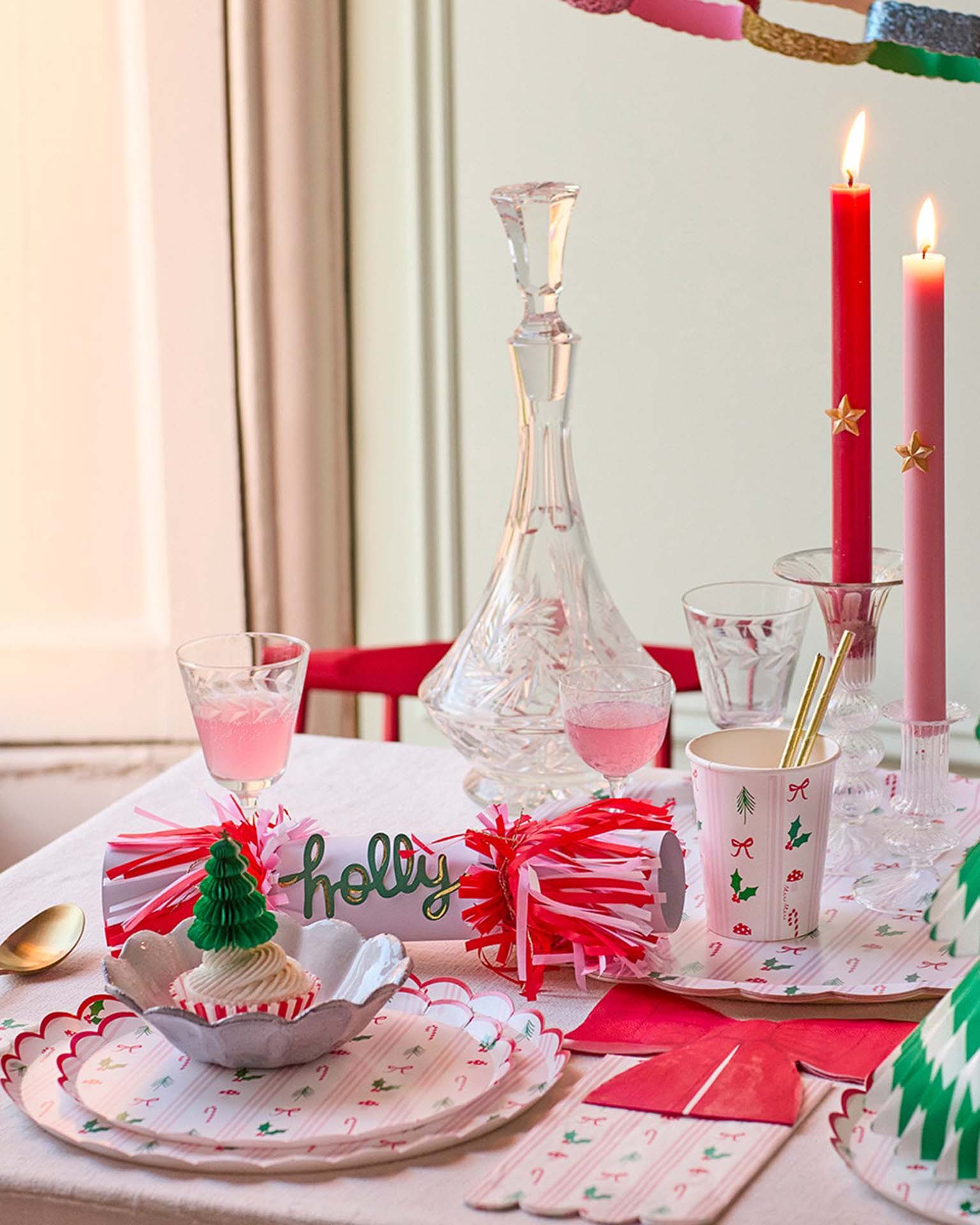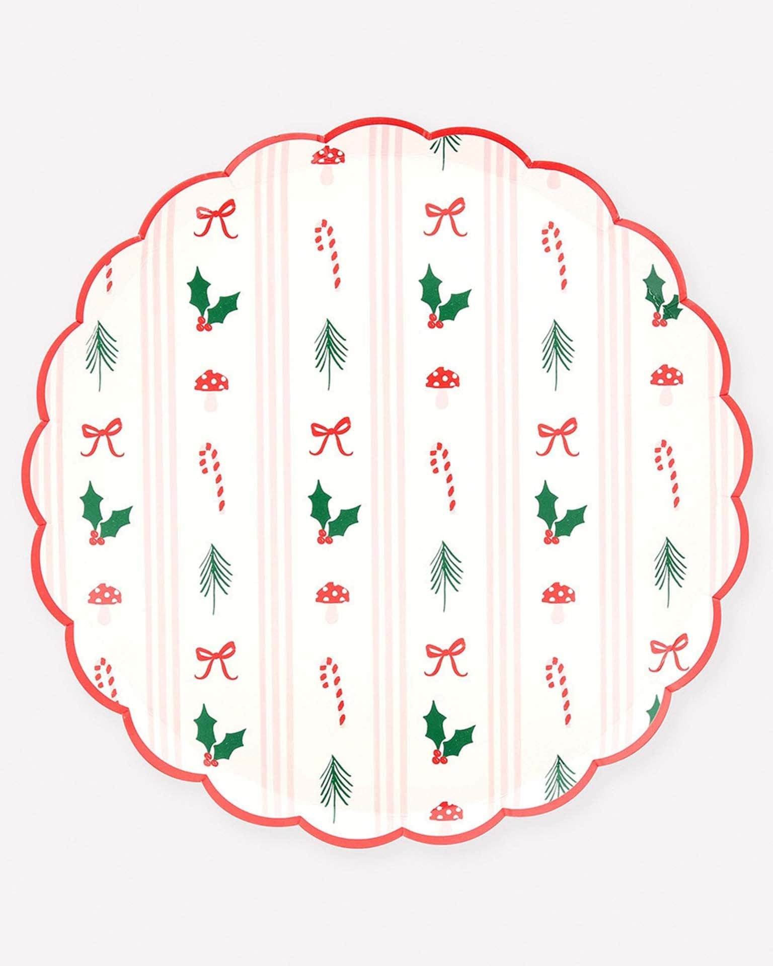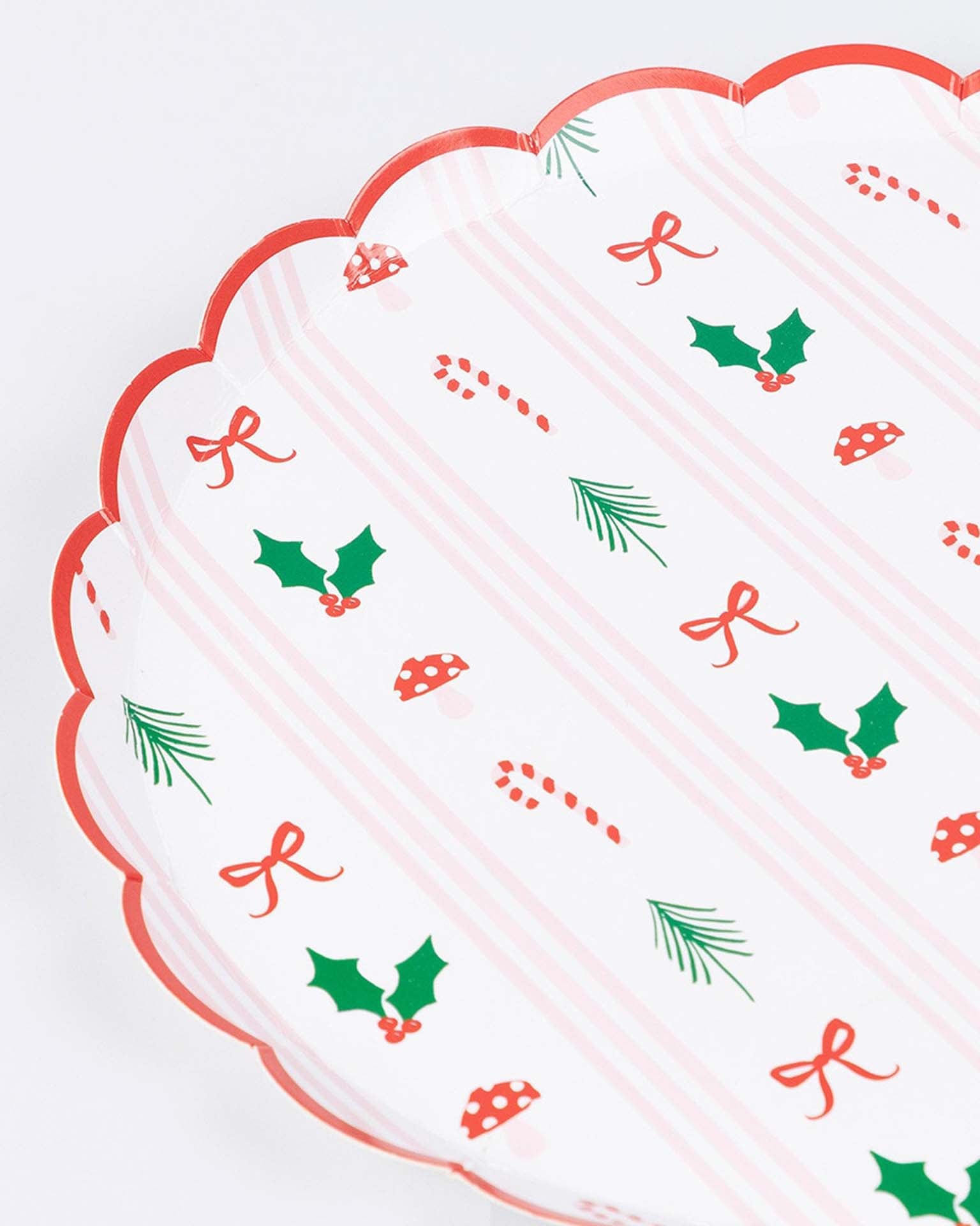 Why settle for just one Christmas motif when you can have a mix of statement icons on your table? Inspired by nostalgic wallpaper patterns, this design blends classic red and green with trend-forward pink stripes for a fresh feel. The bold red scalloped border also adds the perfect vibrant touch of color and style. These paper side plates are ideal to mix and match with your other party essentials.