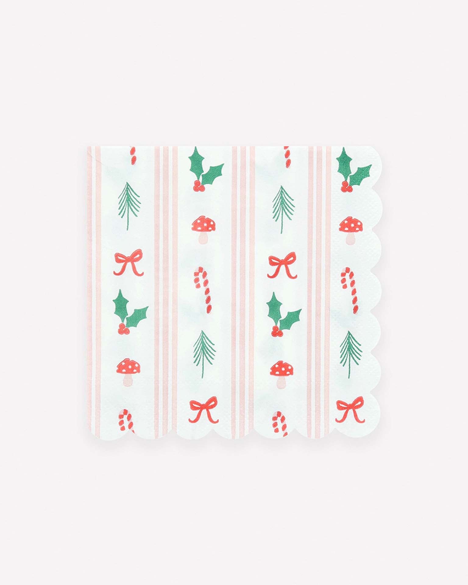 Why settle for just one Christmas motif when you can have a mix of statement icons on your table? Inspired by nostalgic wallpaper patterns, this design blends classic red and green with trend-forward pink stripes for a fresh feel. The scalloped border also adds the perfect touch of style. These small paper napkins are ideal to mix and match with your other party essentials.